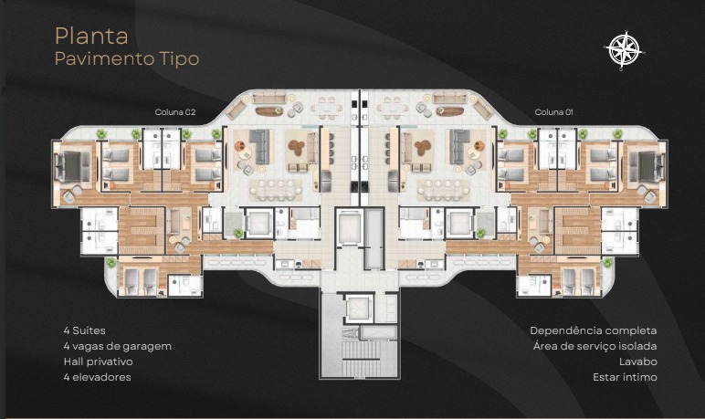 Características do Apartamento:**- 4 Suítes- 4 vagas de garagem- Hall privativo- 4 elevadores- Dependência completa- Área de serviço isolada- Lavabo- Estar íntimo