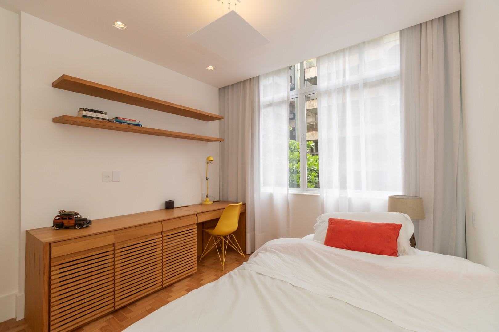 A distribuição interna é primorosa, com 3 suítes luxuosas que garantem privacidade e conforto aos moradores. Destaque para a suíte master, que conta com um espaçoso closet. Os demais quartos possuem armários e bancadas sob medida, todos com um refinado acabamento em marcenaria e automação em todos os ambientes, proporcionando praticidade e modernidade.