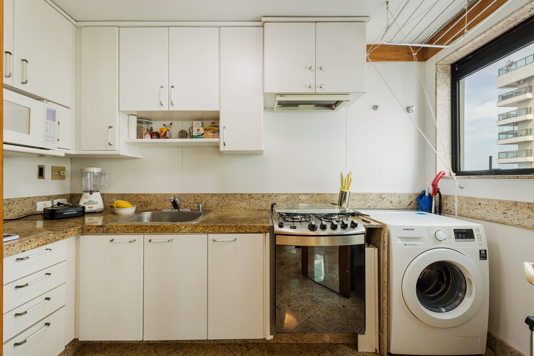A sala de jantar e estar, com varandas de ambos os lados, proporciona belíssima vista lateral para o azul do mar e verde do Golf Club. Mutíssimo aprazível! São 2 quartos, sendo uma suíte muito confortável, e ambos os quartos com varandas também vista mar e Golf. Ainda, banheiro completo, cozinha e área de serviço.