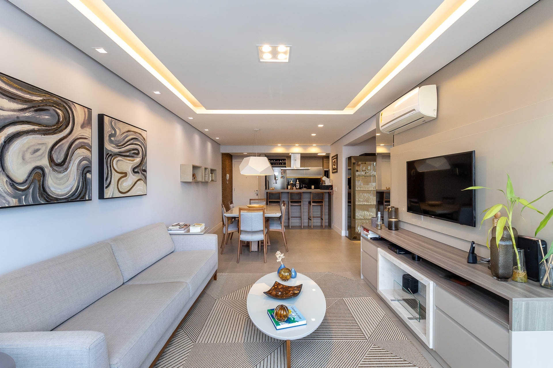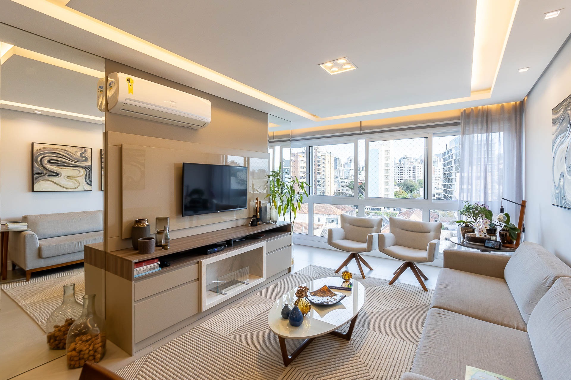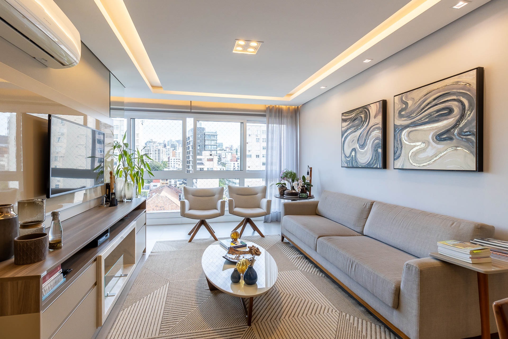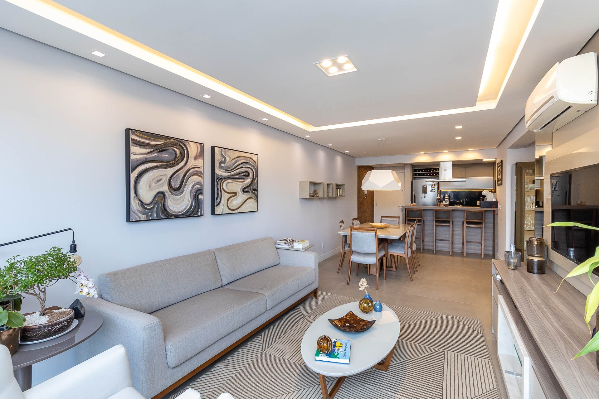 Apartamento de alto padrão, mobiliado com sofisticação, localizado no bairro Passo d' Areia, com 105m² de área privativa. Conta com 3 dormitórios, sendo 1 suíte, além de um living integrado para 3 ambientes, cozinha americana com ilha e torre quente, churrasqueira e área de serviço separada. Dispõe de lavabo e banheiro social. O imóvel oferece conforto e tecnologia, com cortinas blackout automatiz...