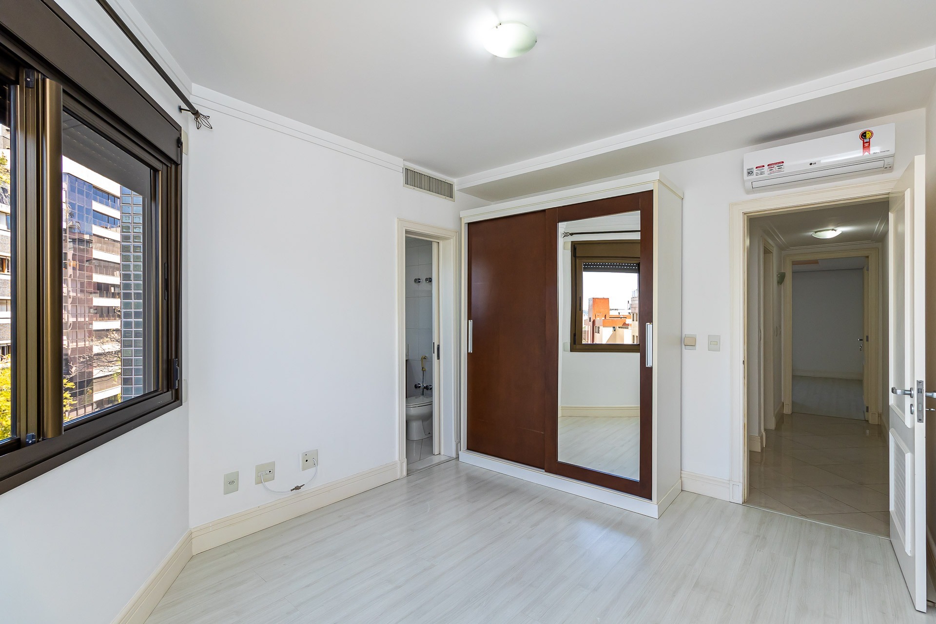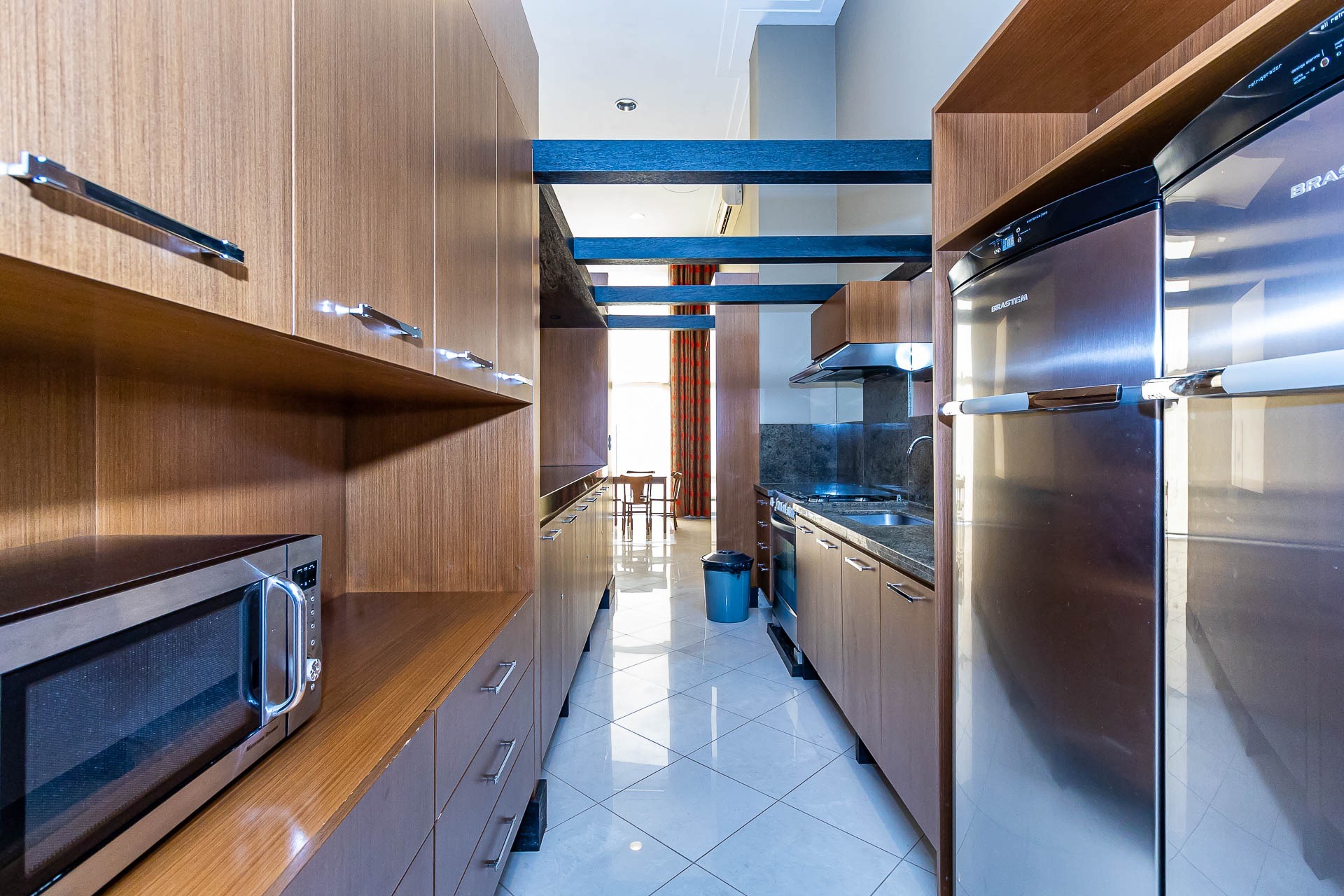 Apartamento para alugar mobiliado com 4 dormitórios, sendo 2 suítes, 179m de área privativa, living com ar condicionado, sacada fechada e ampla com churrasqueira, escrivaninha, cômodas, ventiladores de teto e cortinas, banheiro social com armários, cozinha completa com armários, fogão, geladeira, micro-ondas e coifa e área de serviço.