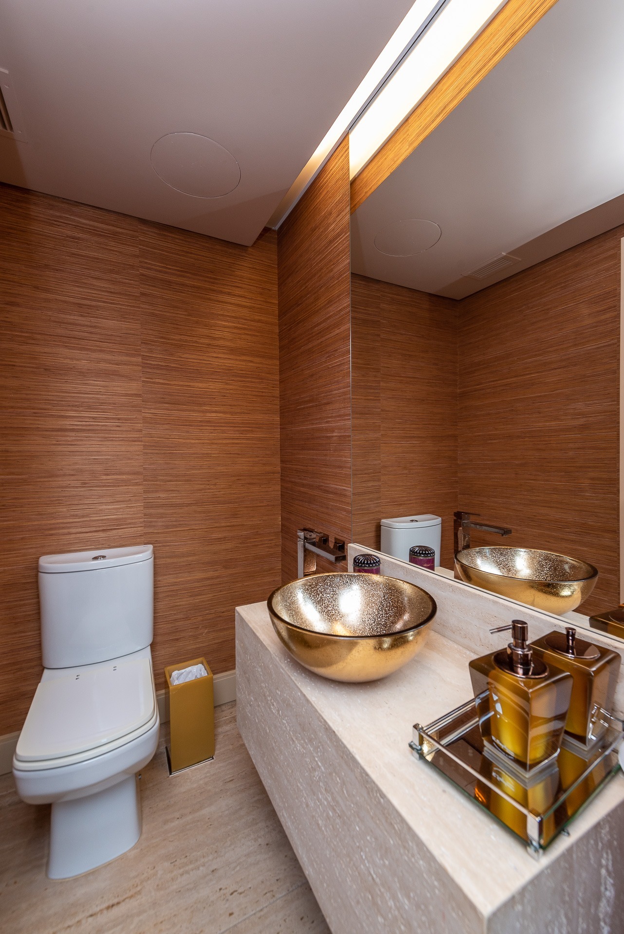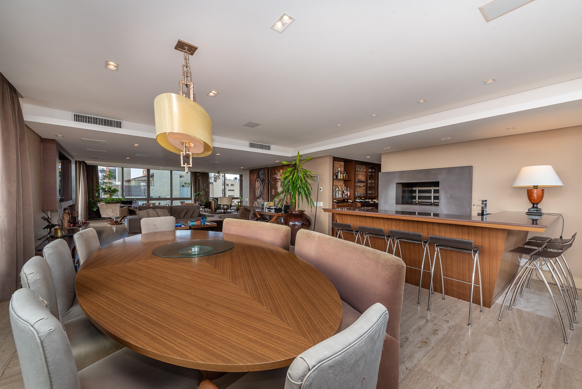 O primeiro pavimento possui hall, gabinete, lavabo, amplo living para 3 ambientes, cozinha integrada com ilha gourmet, churrasqueira. Há ainda acesso ao pátio privativo com lounge, deck e piscina, churrasqueira e balcão de apoio com pia.