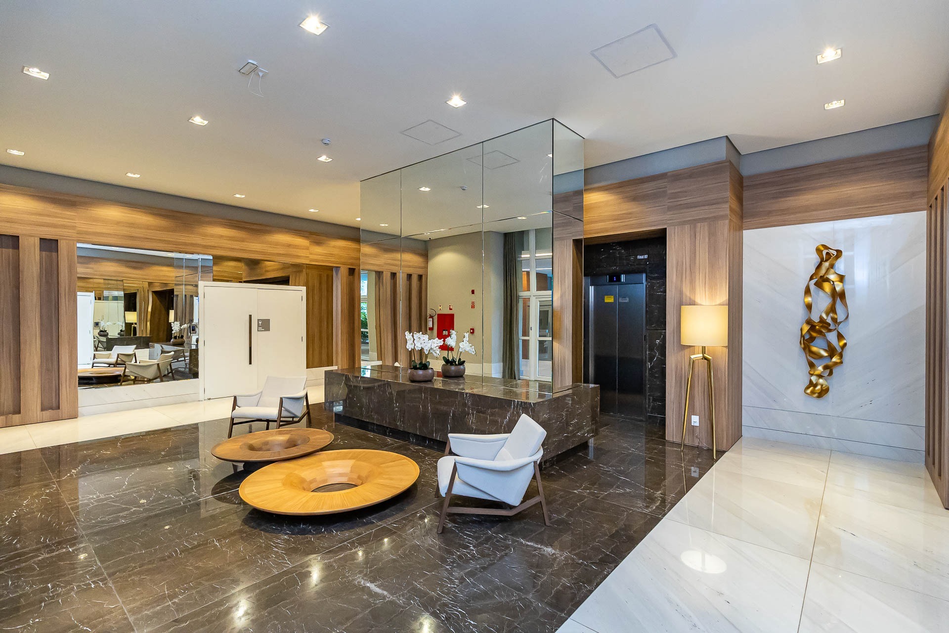 Living para 3 ambientes, com lavabo, churrasqueira, lareira, sacada aberta, ampla cozinha com móveis planejados, lavanderia, dependência de empregada completa e hall privativo. A área íntima conta com 4 amplas suítes, sendo 2 americanas e 1 máster com closet.