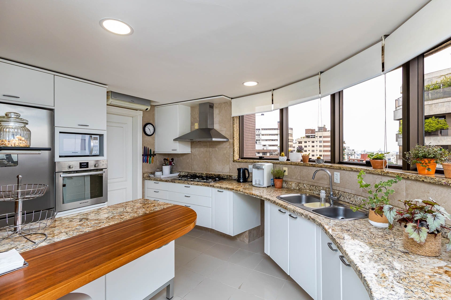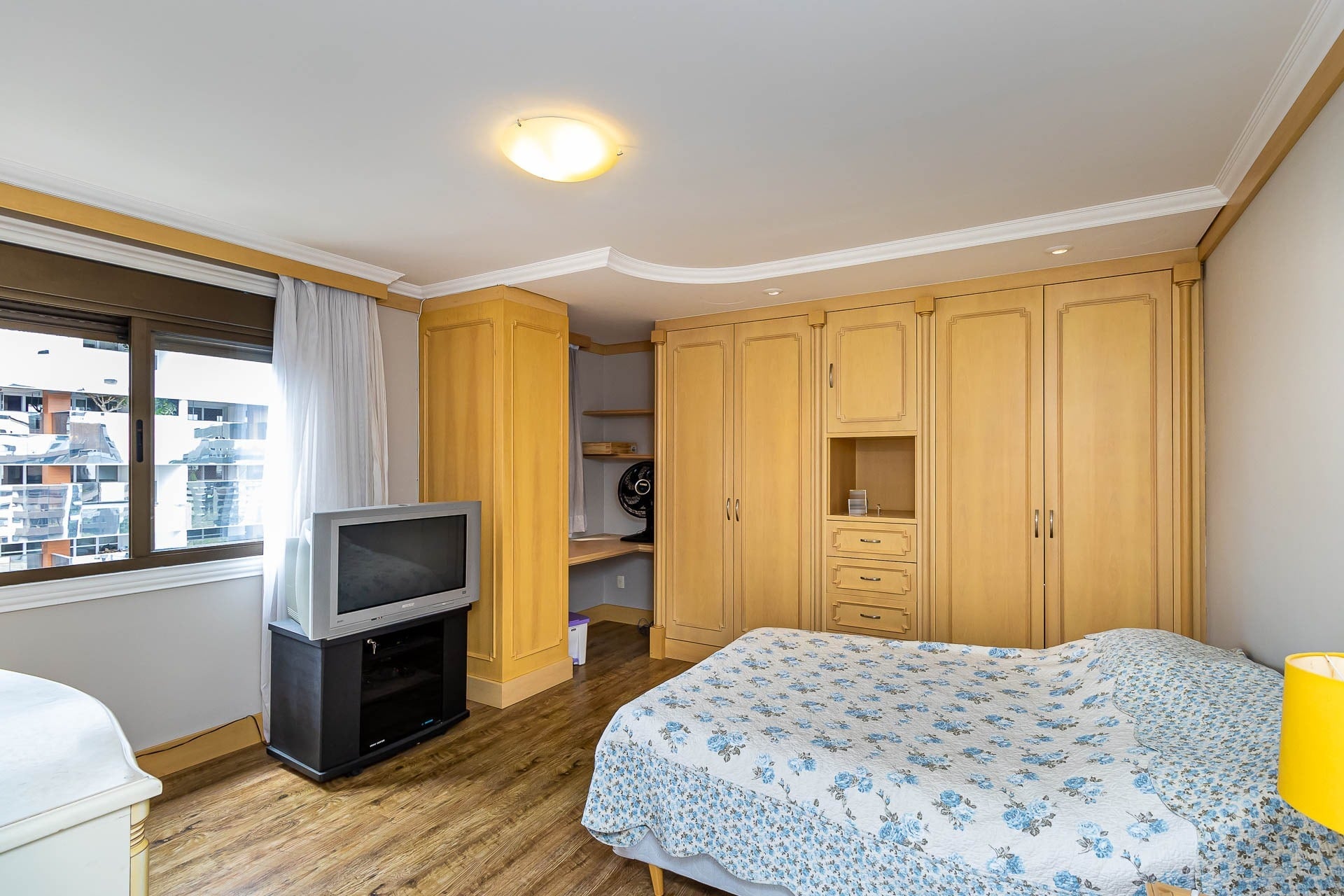 Apartamento para alugar mobiliado com 4 dormitórios, sendo 2 suítes, 179m de área privativa, living com ar condicionado, sacada fechada e ampla com churrasqueira, escrivaninha, cômodas, ventiladores de teto e cortinas, banheiro social com armários, cozinha completa com armários, fogão, geladeira, micro-ondas e coifa e área de serviço.