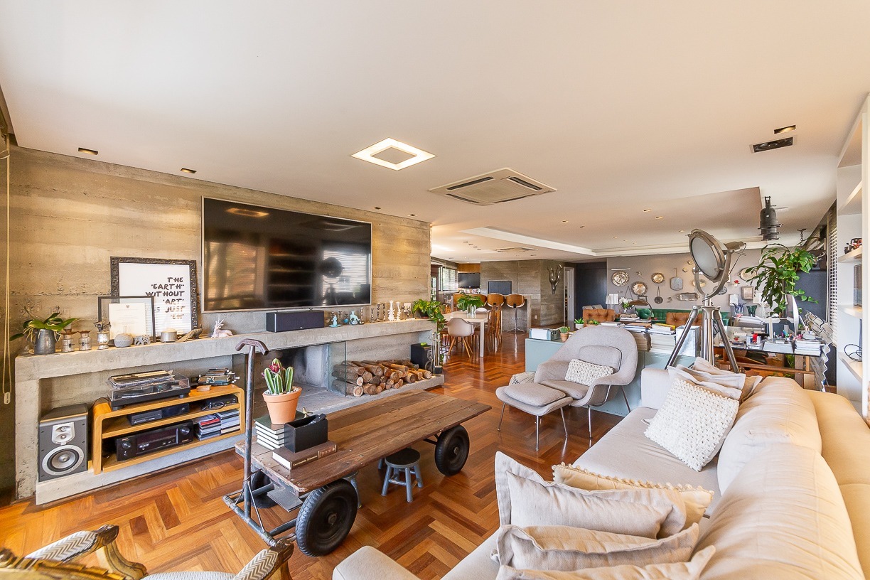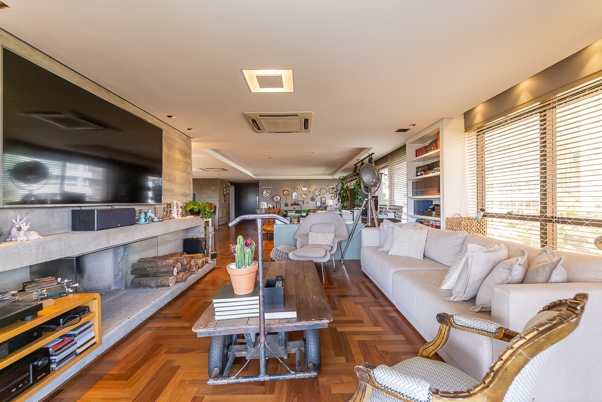 Living 4 ambientes com lareira, sala de jantar, espaço gourmet com churrasqueira e chopeira, lavabo, gabinete, 3 sacadas, jardim de inverno, adega climatizada.
