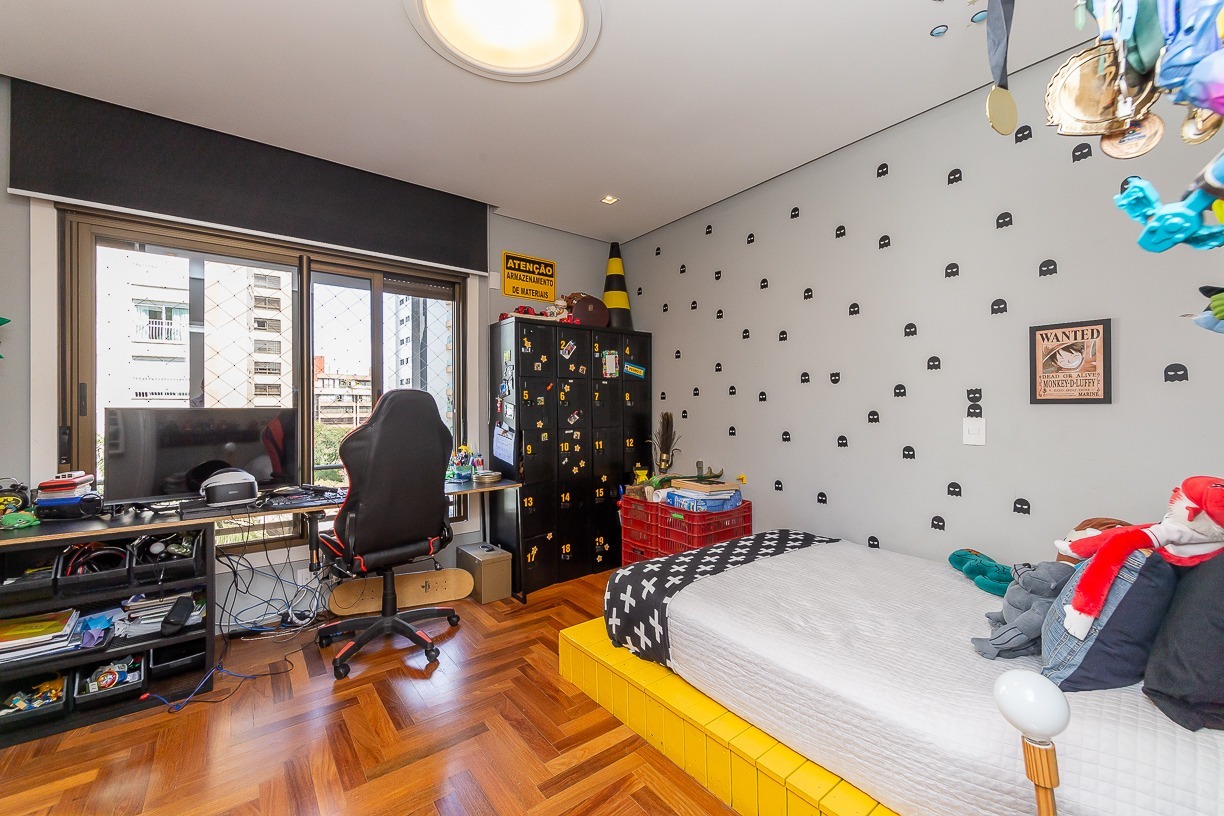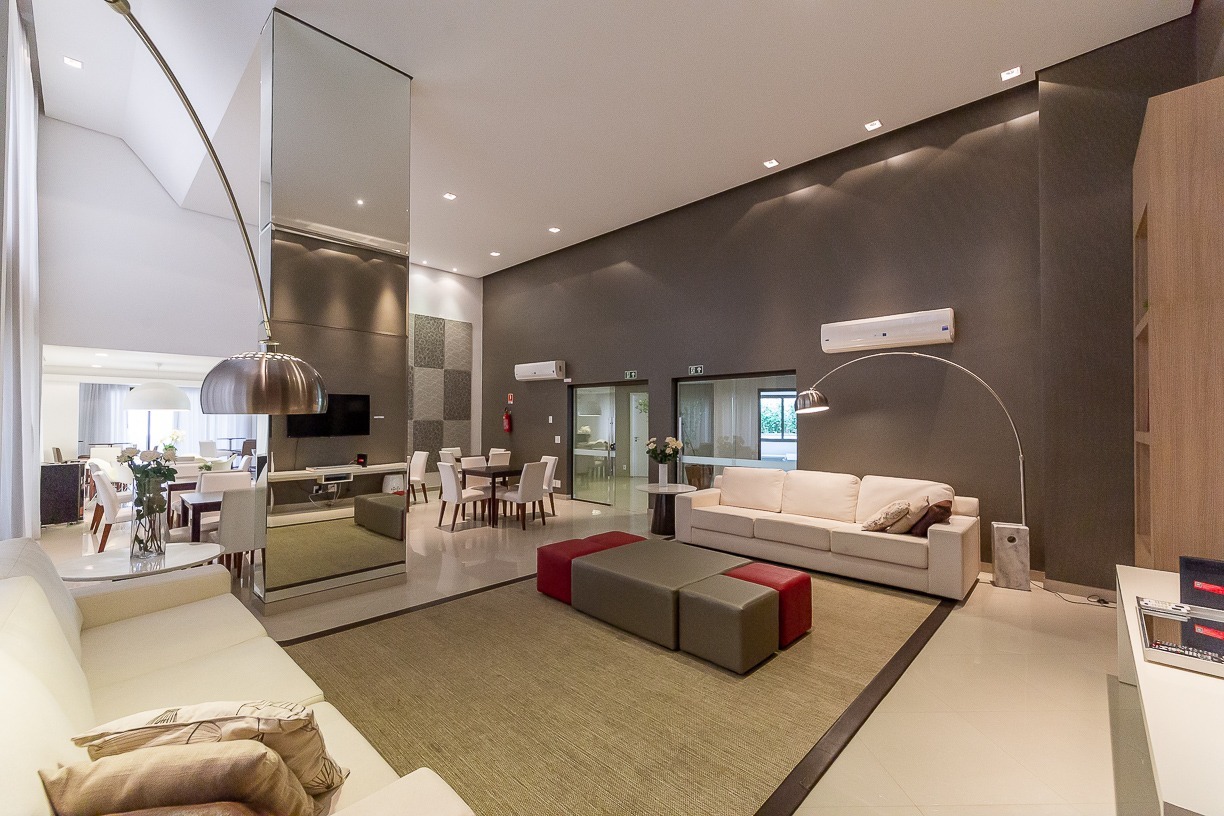 Living para 3 ambientes, com lavabo, churrasqueira, lareira, sacada aberta, ampla cozinha com móveis planejados, lavanderia, dependência de empregada completa e hall privativo. A área íntima conta com 4 amplas suítes, sendo 2 americanas e 1 máster com closet.