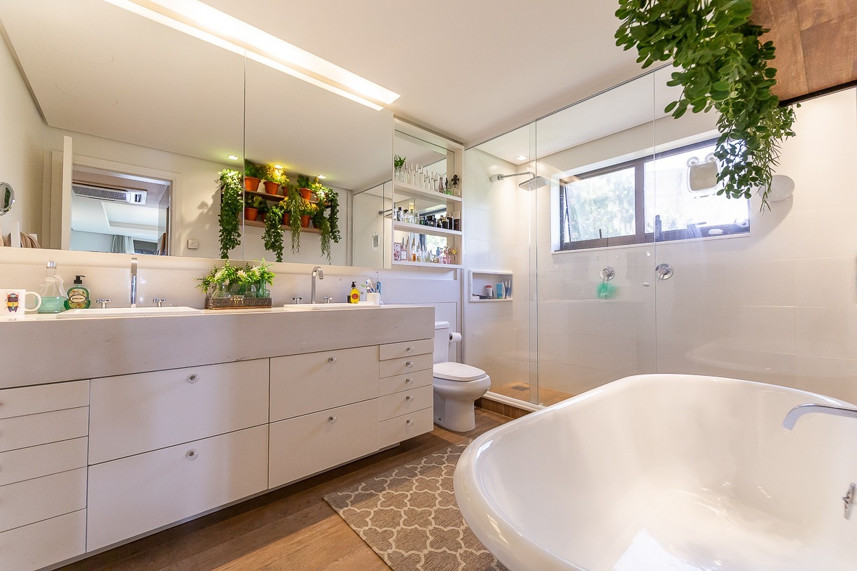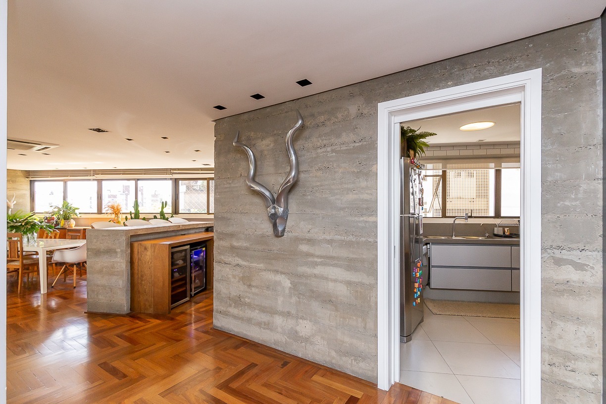 Pé-direito de 3m e esquadrias piso-teto que permitem ambientes abertos, arejados e com muita iluminação natural. Além disso, as esquadrias fazem com que o interior se integre com o espaço externo, tornando o living em uma grande varanda. A ideia é descomplicar a vida e favorecer o convívio.