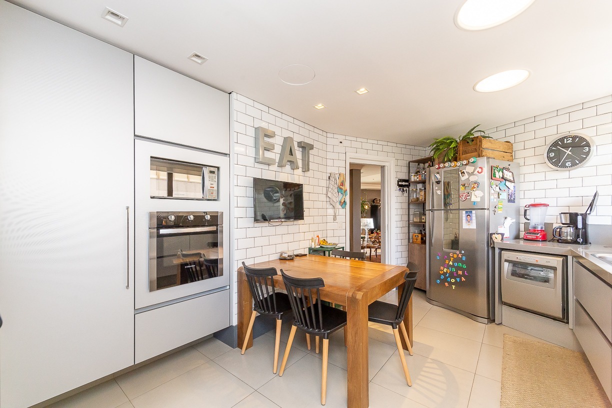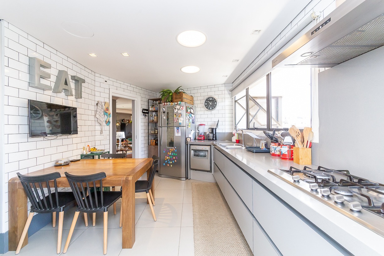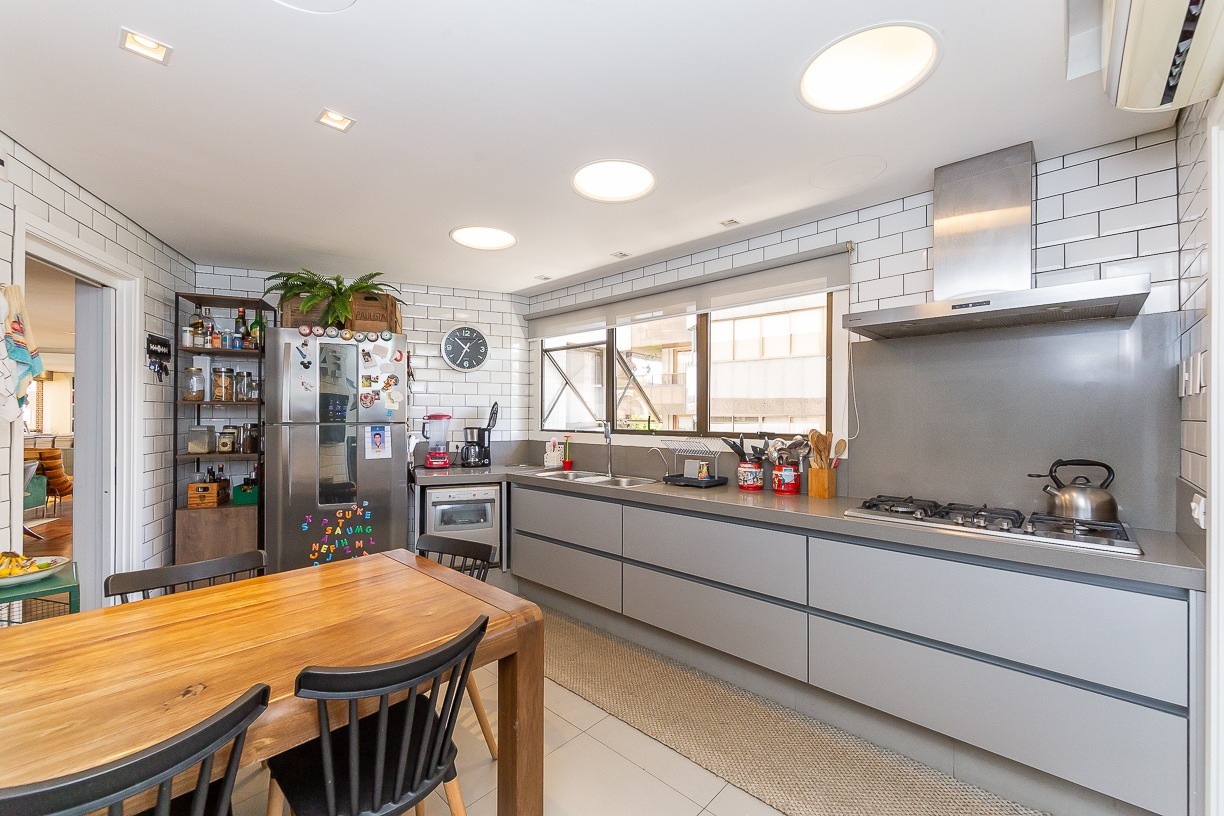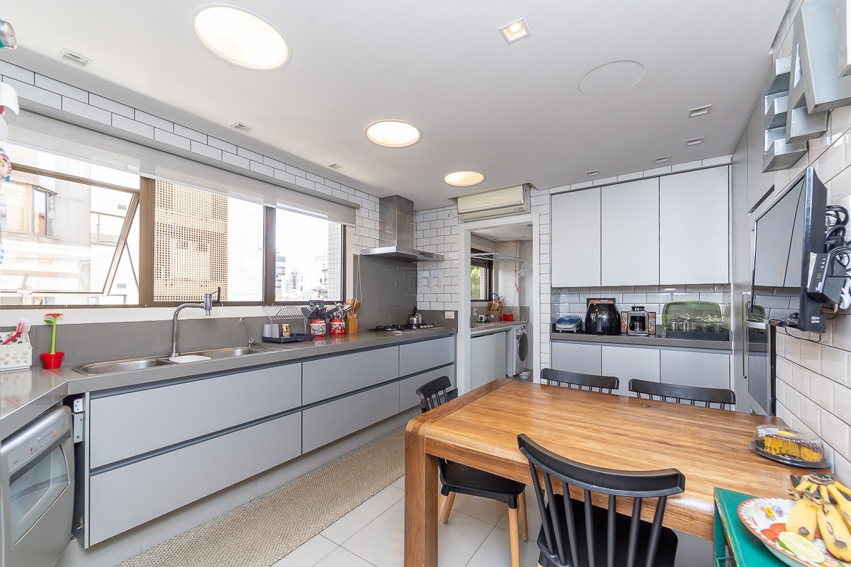 Ampla copa cozinha com ilha, closet de louças, dependência de empregada completa, entrada de serviço codificada.