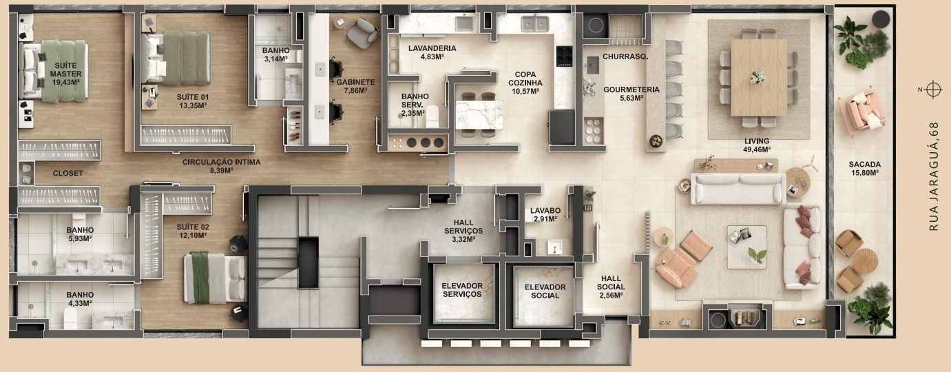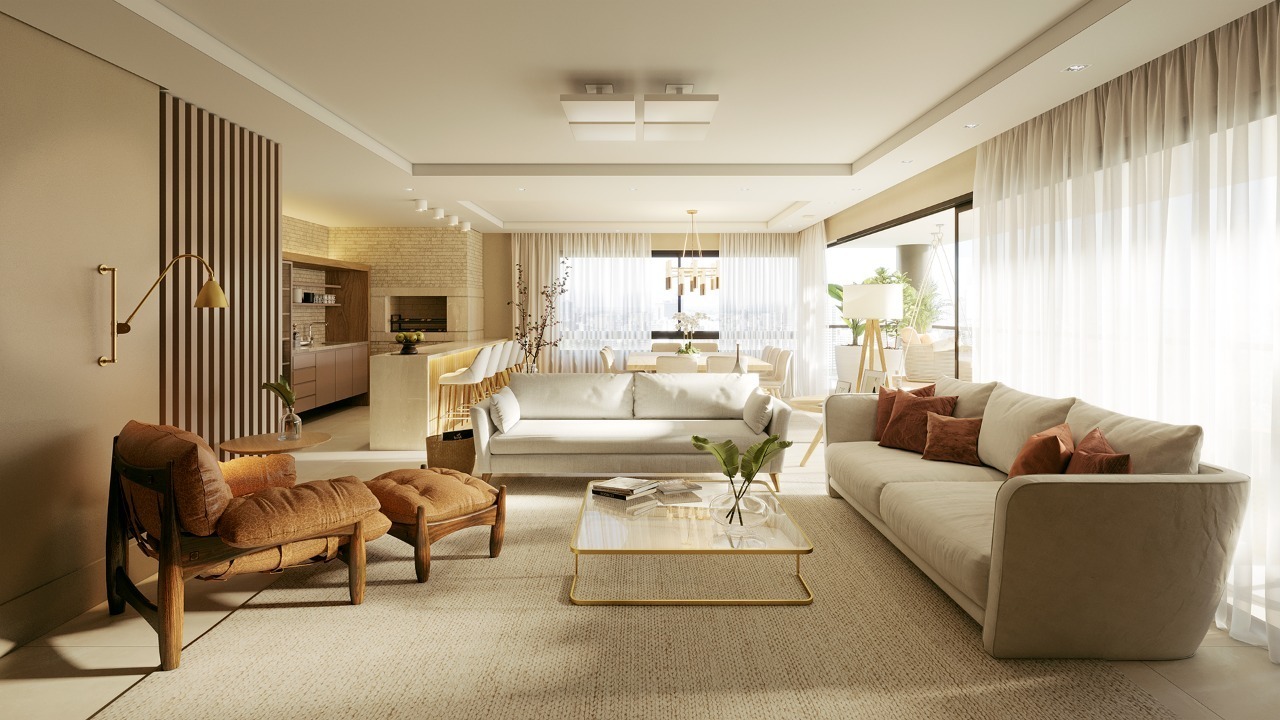 Living para 3 ambientes, com lavabo, churrasqueira, lareira, sacada aberta, ampla cozinha com móveis planejados, lavanderia, dependência de empregada completa e hall privativo. A área íntima conta com 4 amplas suítes, sendo 2 americanas e 1 máster com closet.