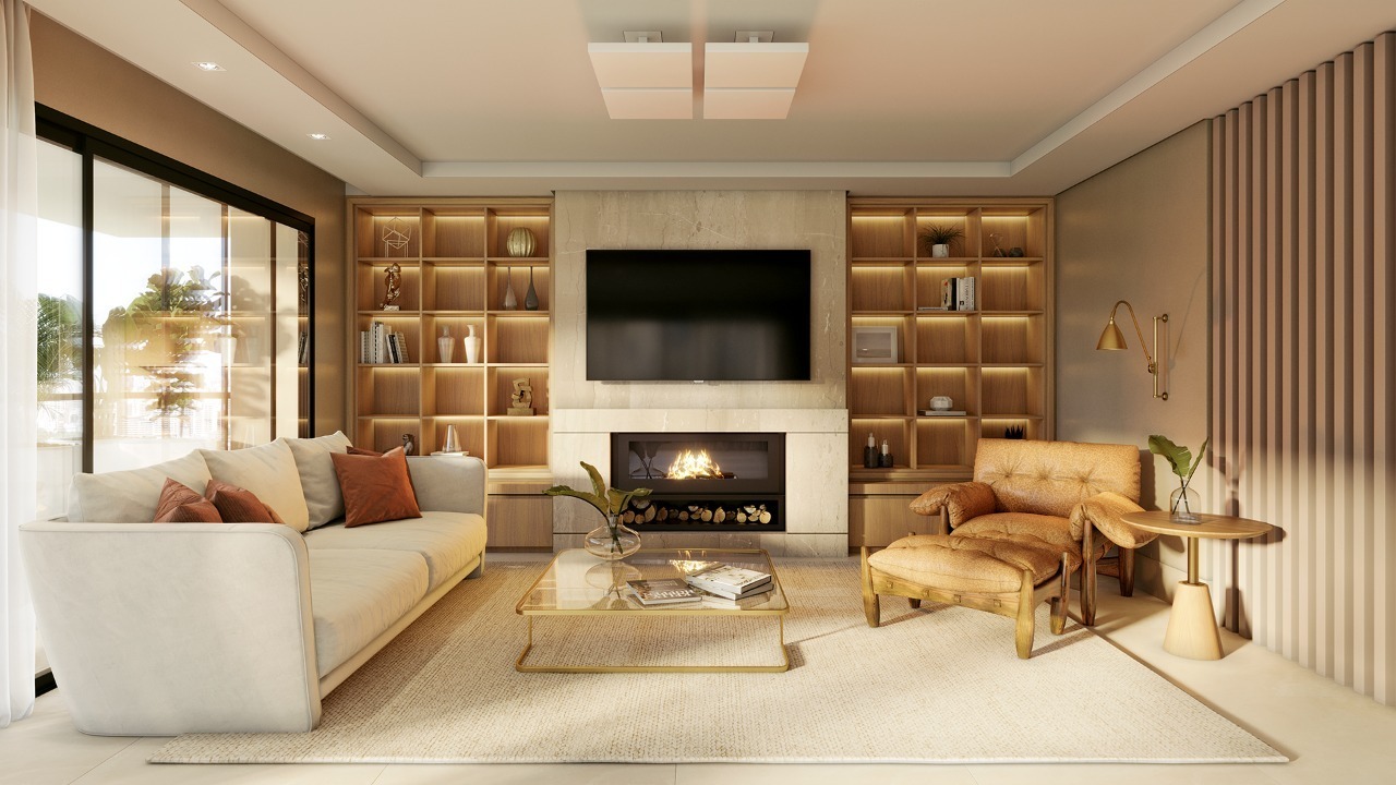 Amplo living equipado com lareira canadense, detalhe que proporciona aconchego nos dias mais frios.