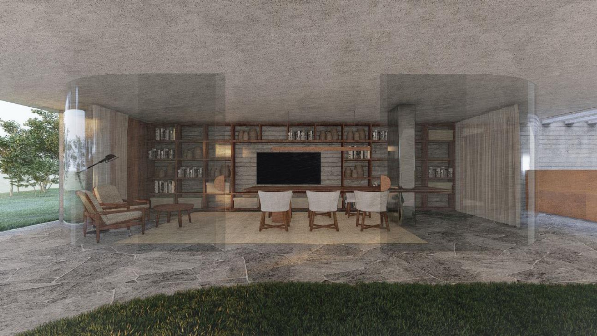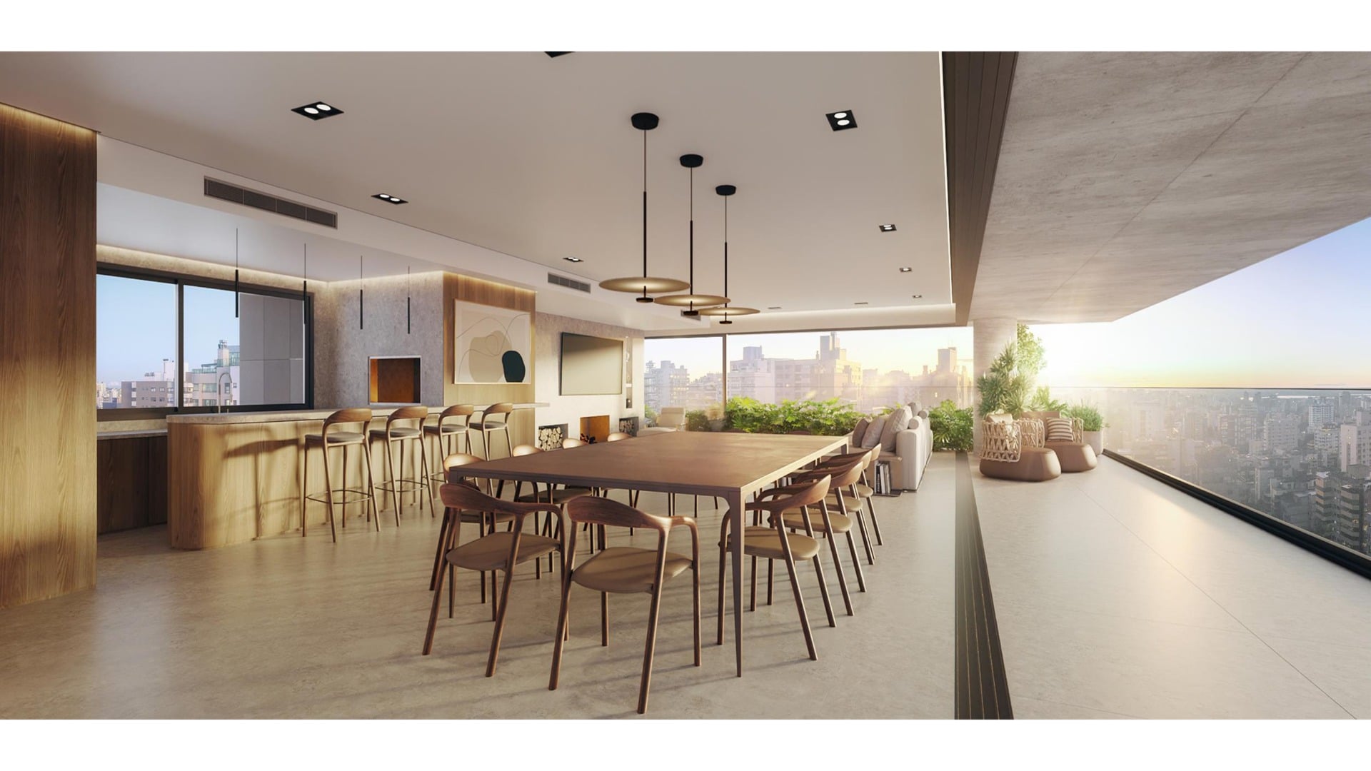 Amplo living equipado com lareira canadense, detalhe que proporciona aconchego nos dias mais frios.