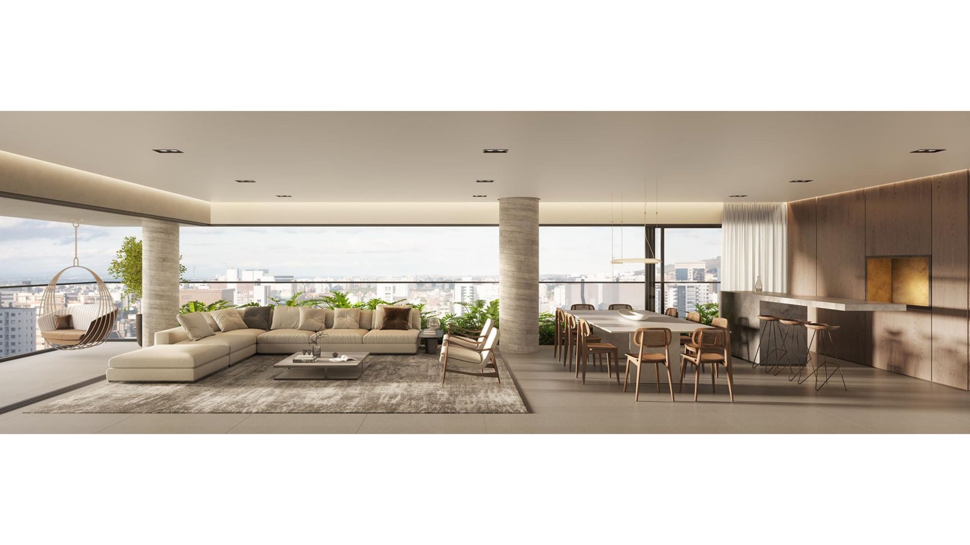 A sala espaçosa conta com uma lareira canadense e uma varanda que proporciona uma vista panorâmica da cidade. O apar...