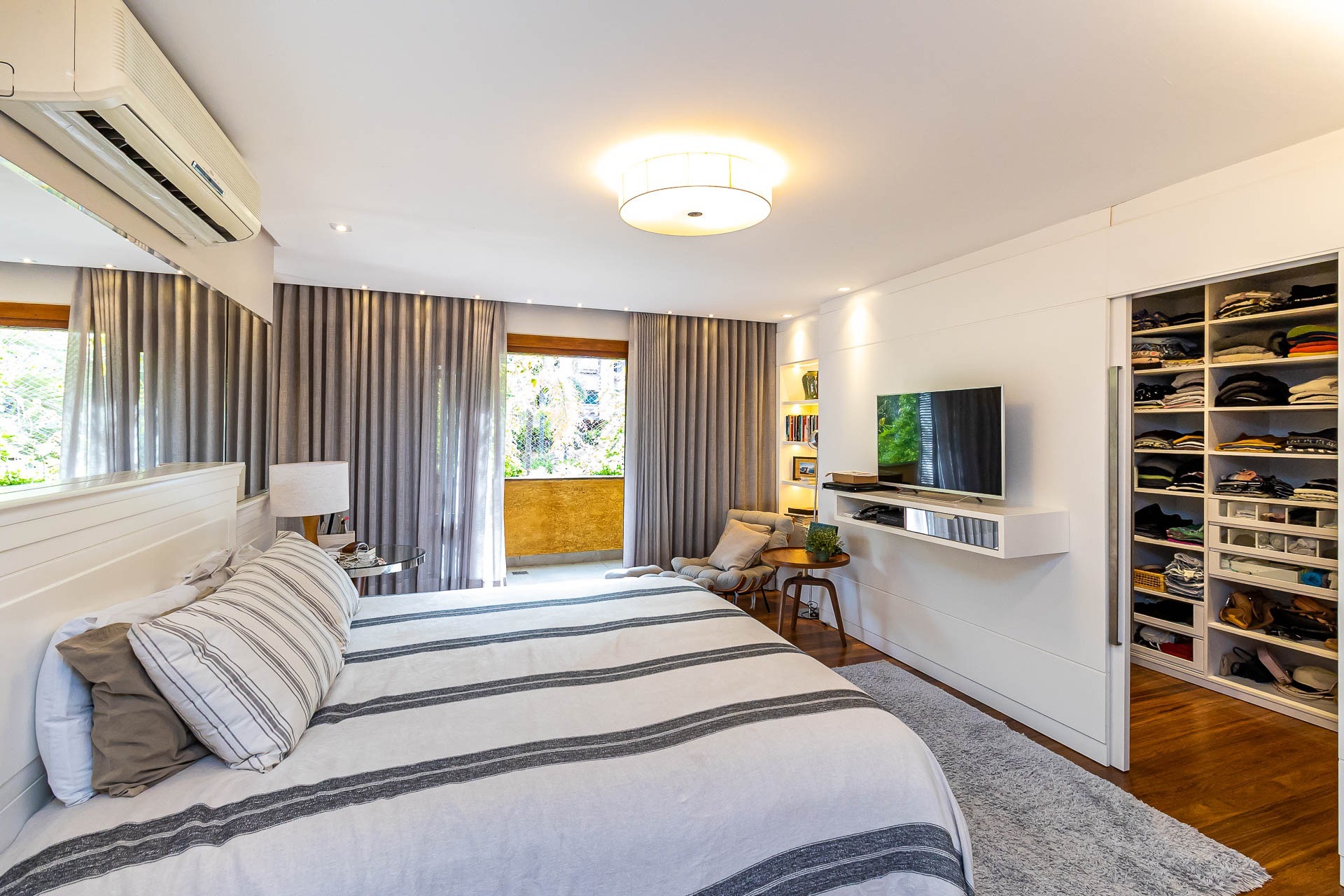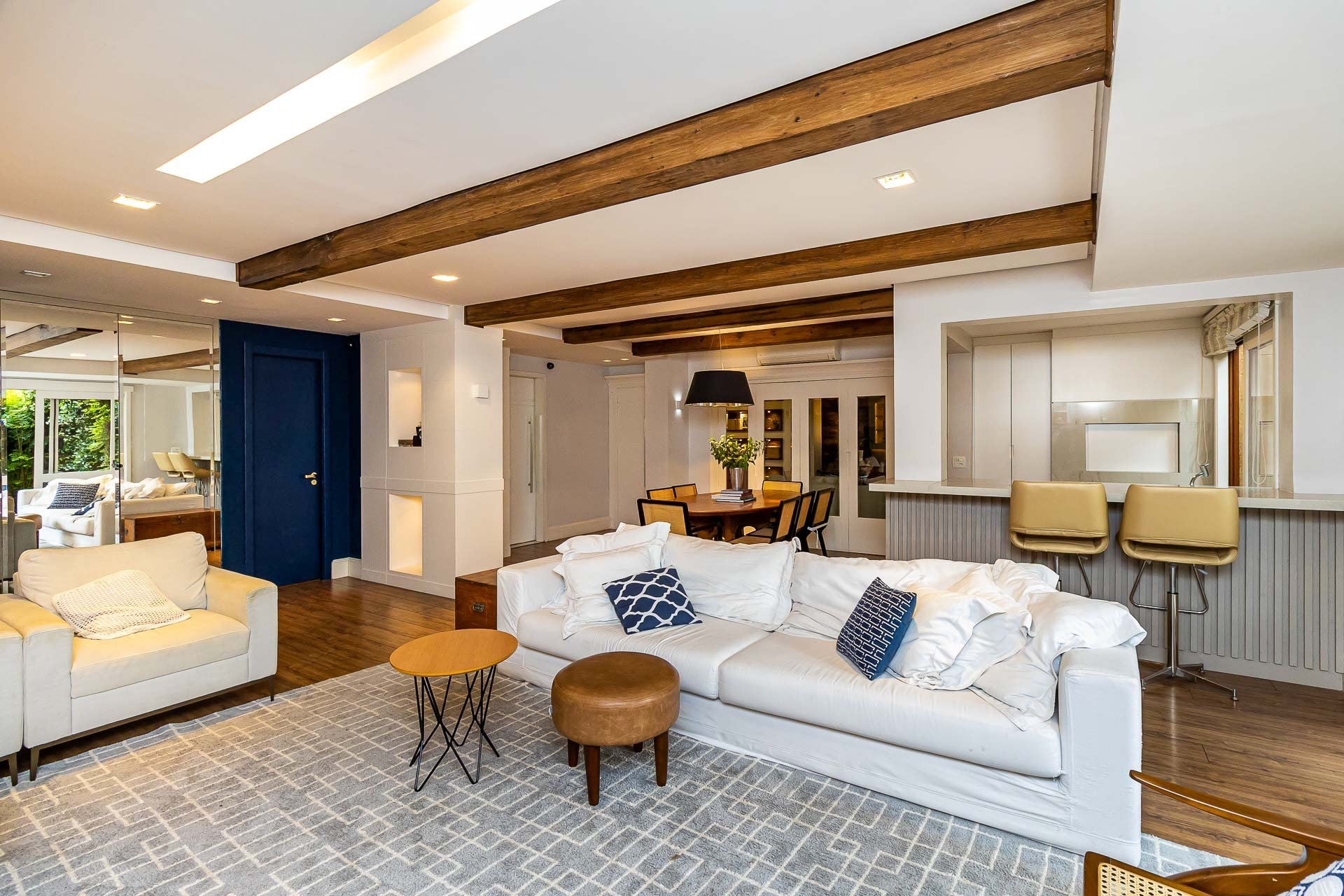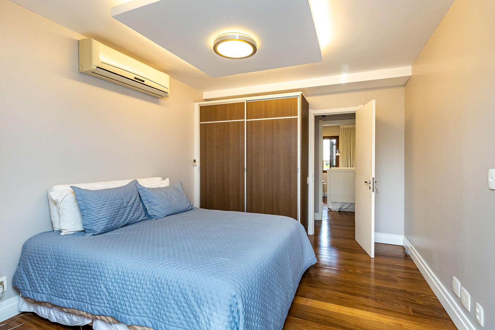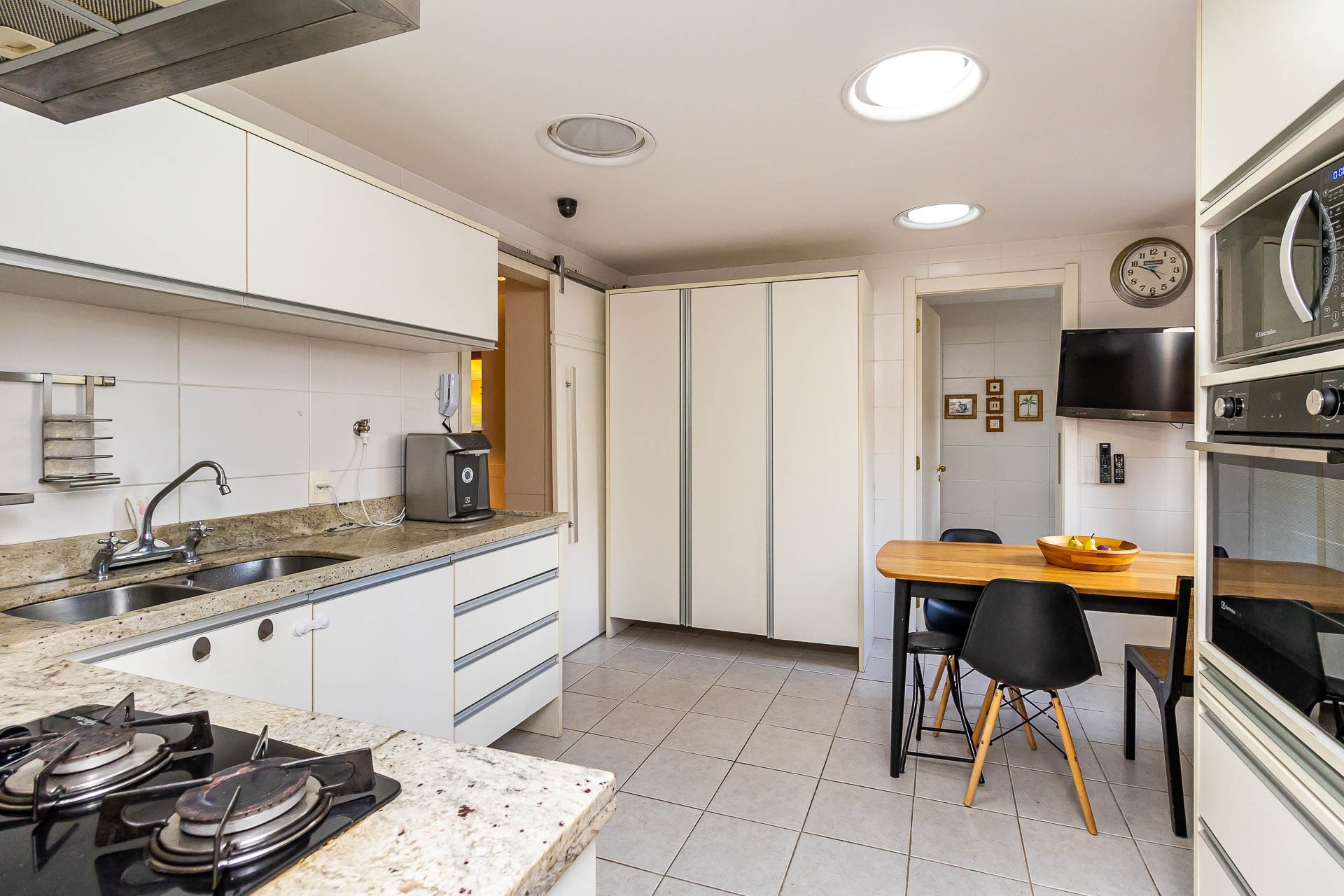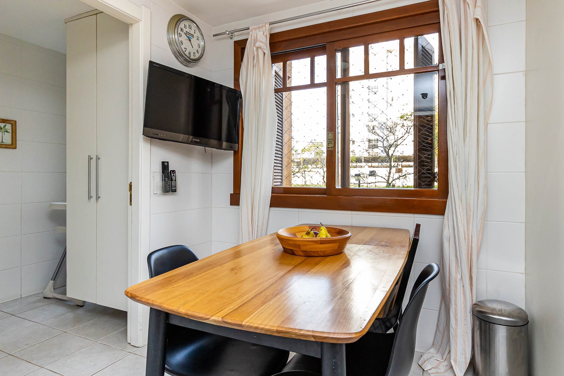 Apartamento para alugar mobiliado com 4 dormitórios, sendo 2 suítes, 179m de área privativa, living com ar condicionado, sacada fechada e ampla com churrasqueira, escrivaninha, cômodas, ventiladores de teto e cortinas, banheiro social com armários, cozinha completa com armários, fogão, geladeira, micro-ondas e coifa e área de serviço.