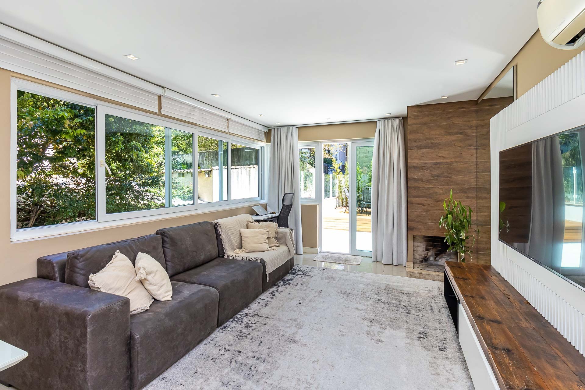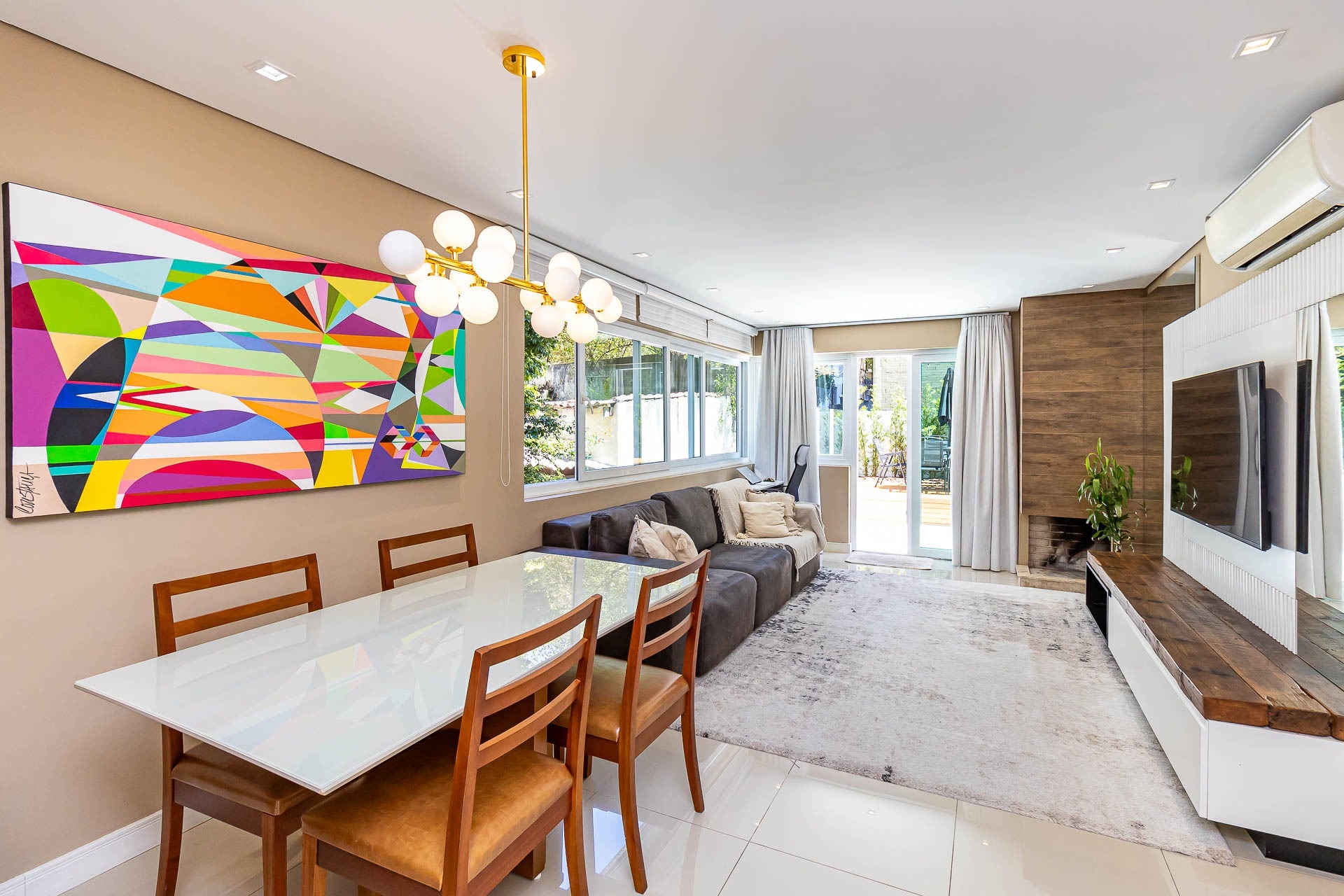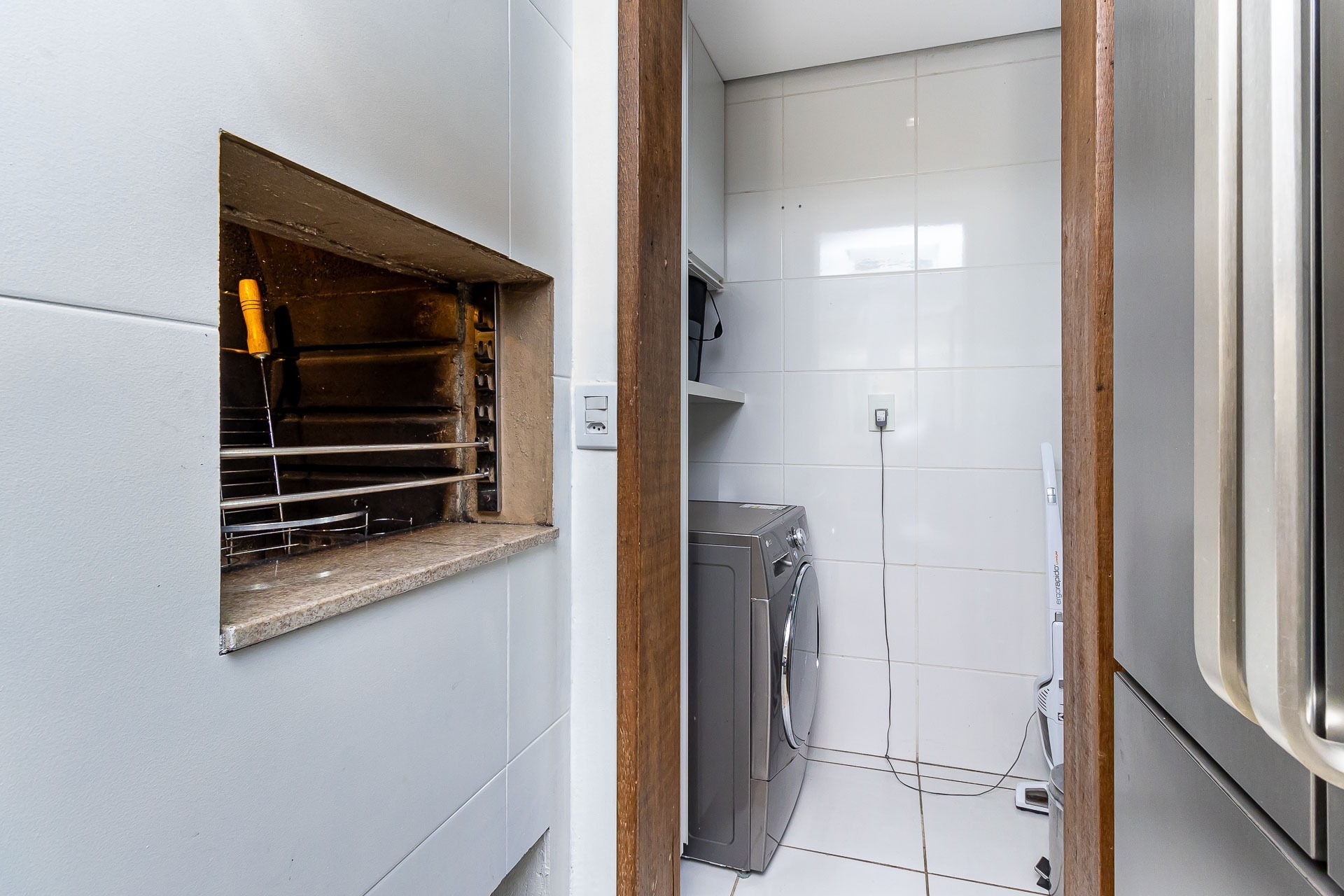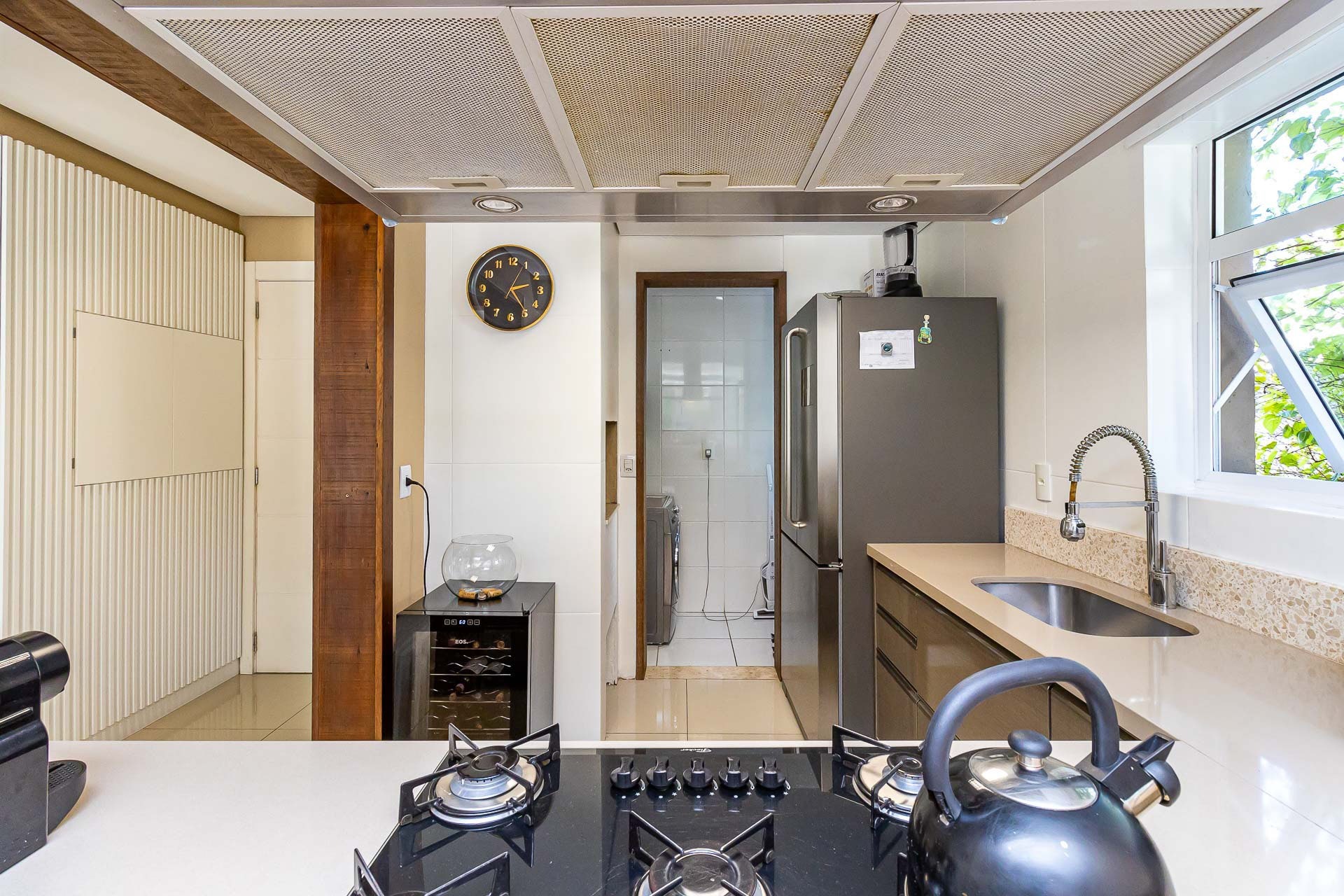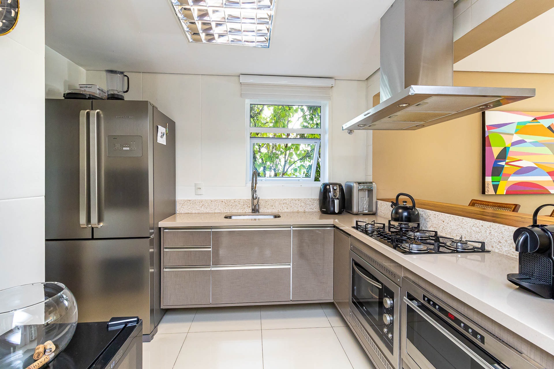 Janelas fullview, dando luminosidade e conforto para quem está no local, cozinha americana montada com churrasqueira, lavabo, 2 suítes, área de serviço, 2 vagas de garagem individuais.