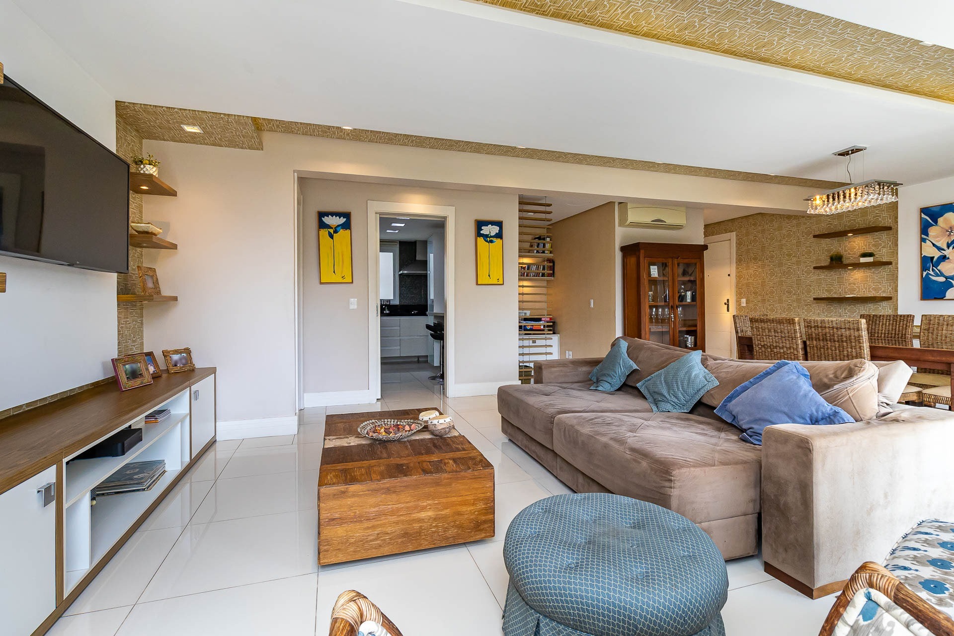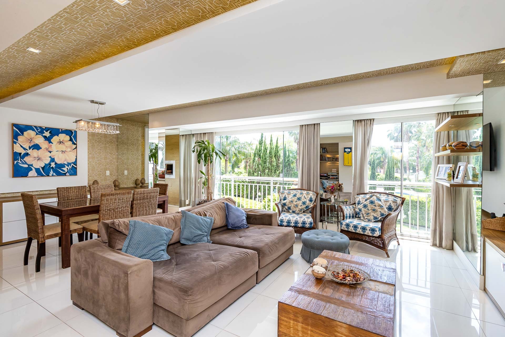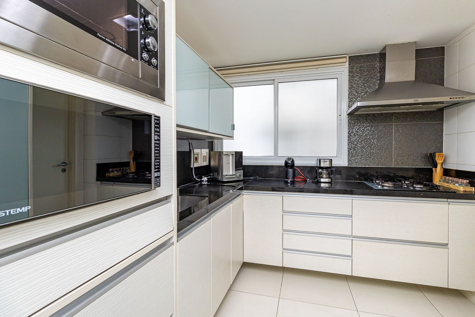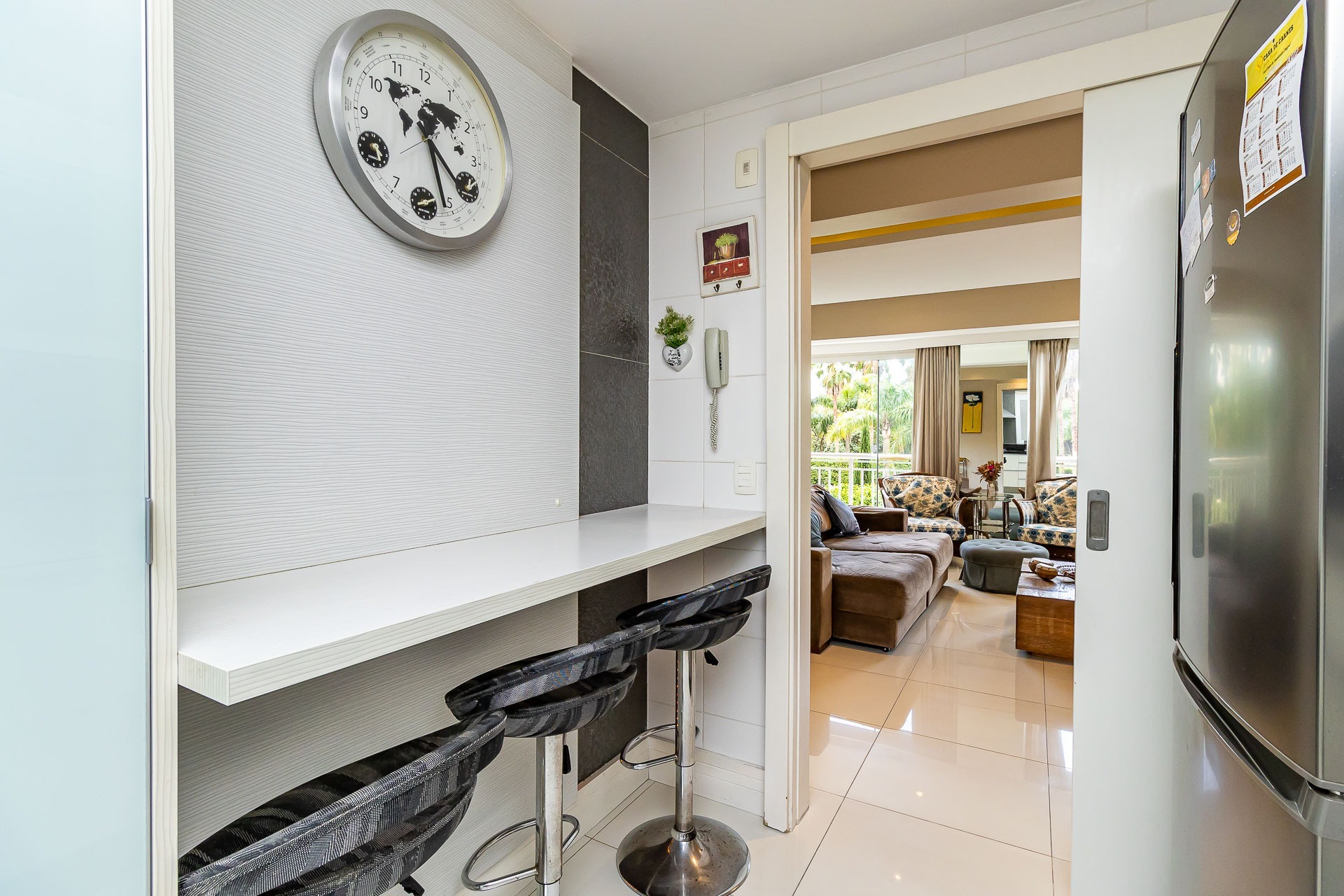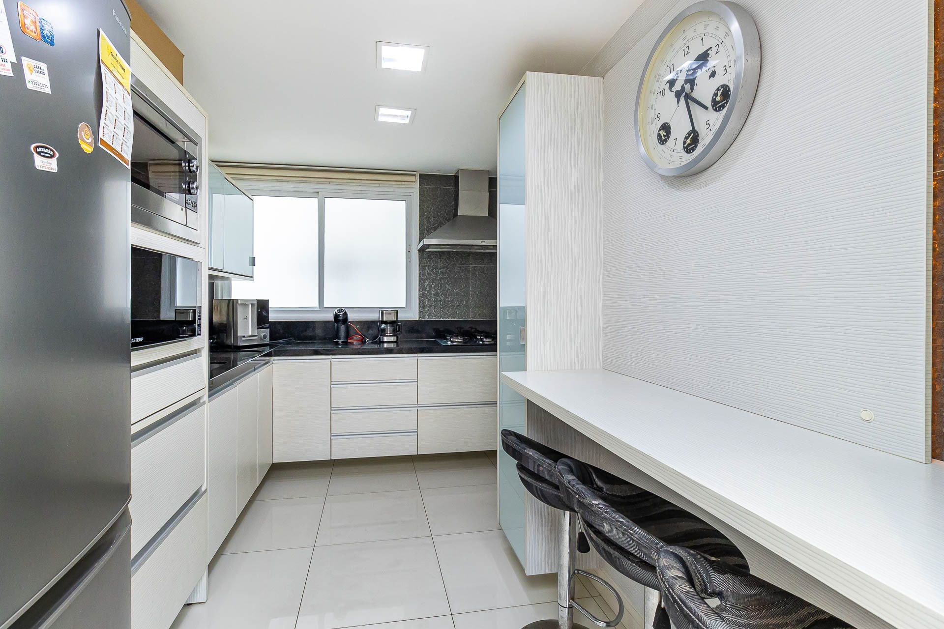 Living estendido integrado a cozinha americana completa, churrasqueira, lavabo, área de serviço, orientação solar voltada para o Norte, 2 vagas de garagem.