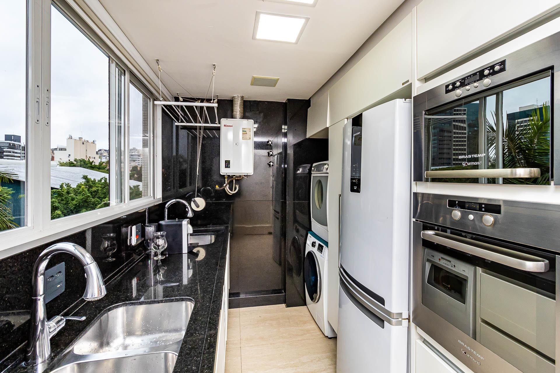 Apartamento para alugar mobiliado com 4 dormitórios, sendo 2 suítes, 179m de área privativa, living com ar condicionado, sacada fechada e ampla com churrasqueira, escrivaninha, cômodas, ventiladores de teto e cortinas, banheiro social com armários, cozinha completa com armários, fogão, geladeira, micro-ondas e coifa e área de serviço.