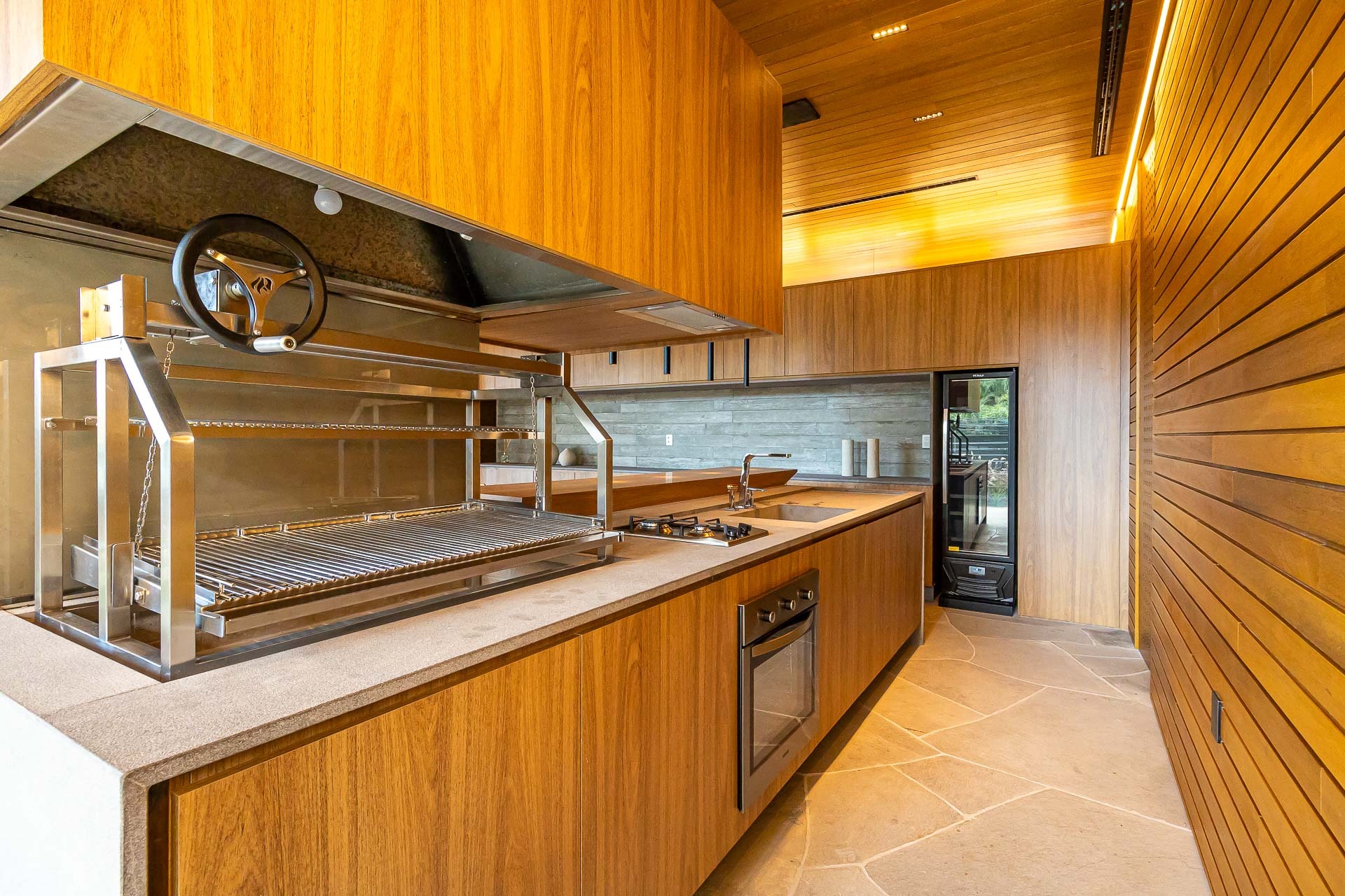 Living para 3 ambientes, com lareira e churrasqueira, lavabo, cozinha com copa, área de serviço e banheiro auxiliar.