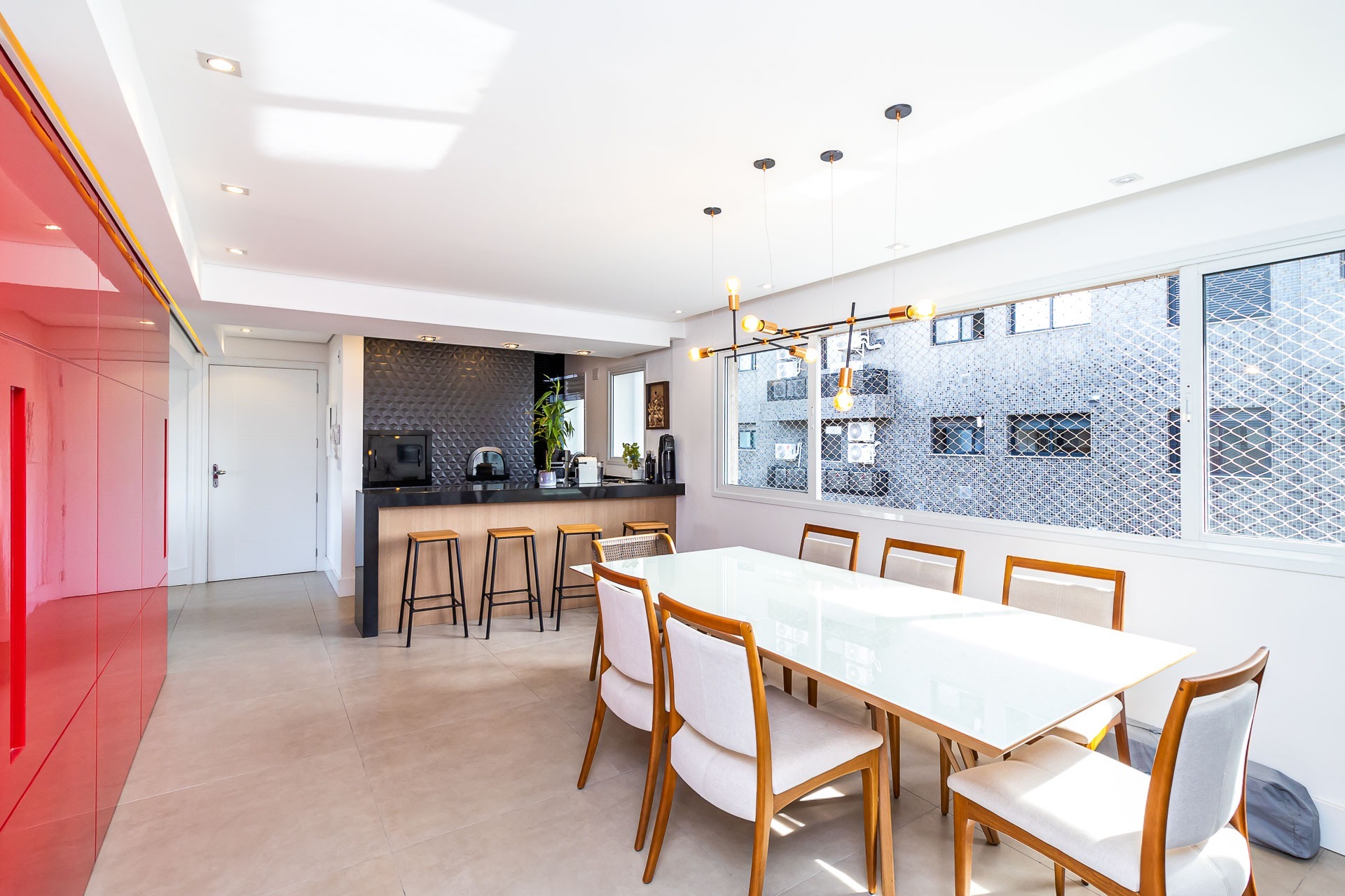 Apartamento possui um enorme living para 3 ambientes super iluminado e arejado, possui uma linda vista, lavabo, lareira, espaço gourmet com churrasqueira que da acesso ao terraço que conta com uma piscina aquecida.