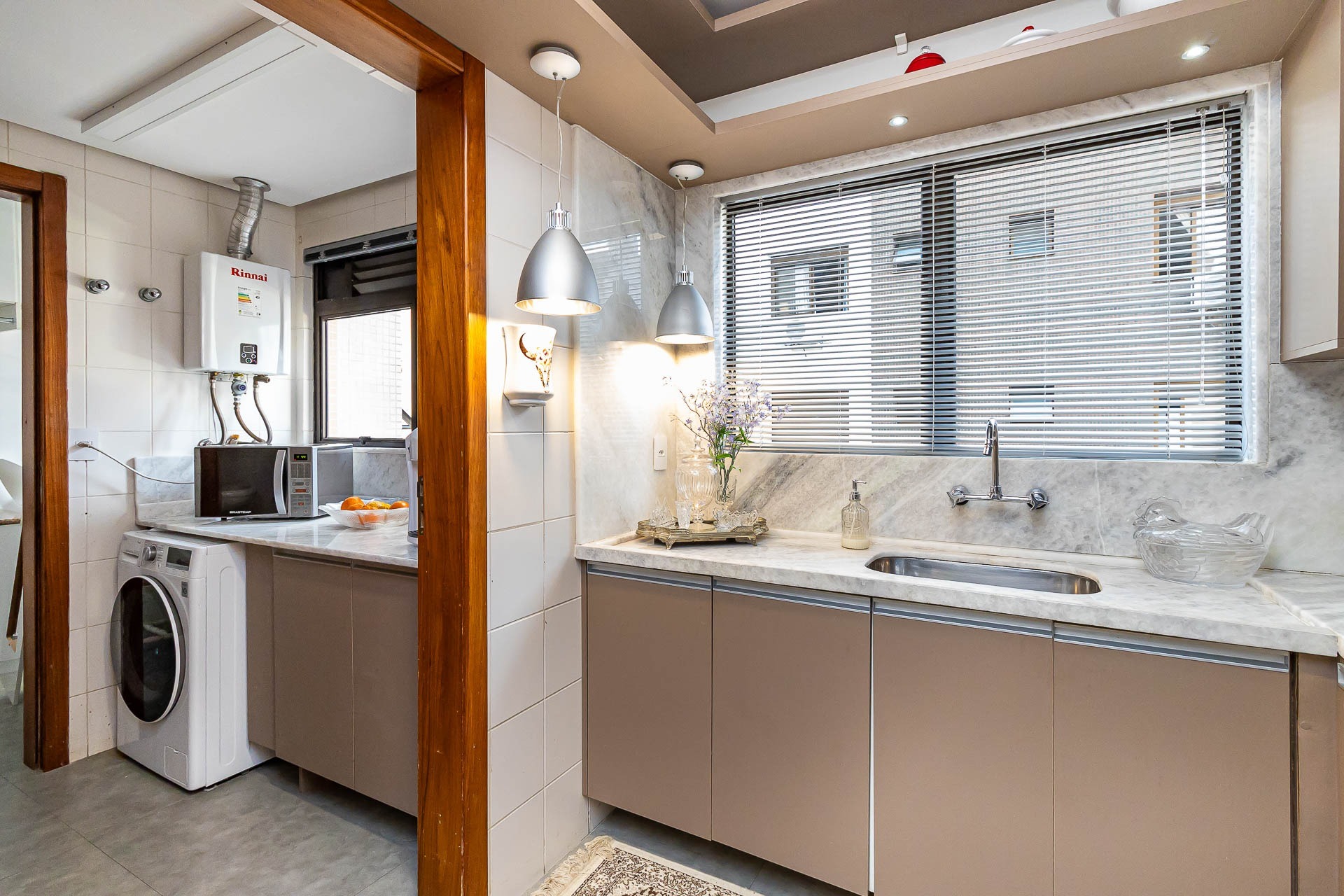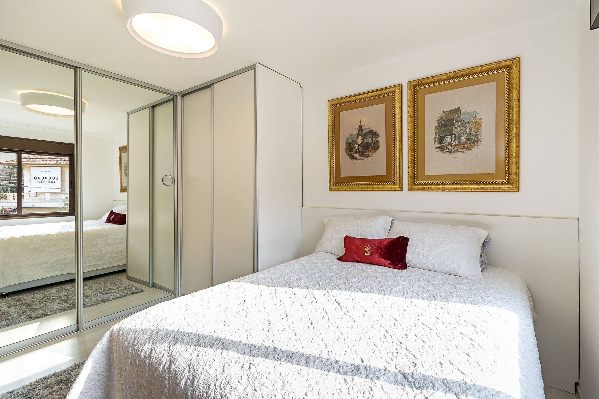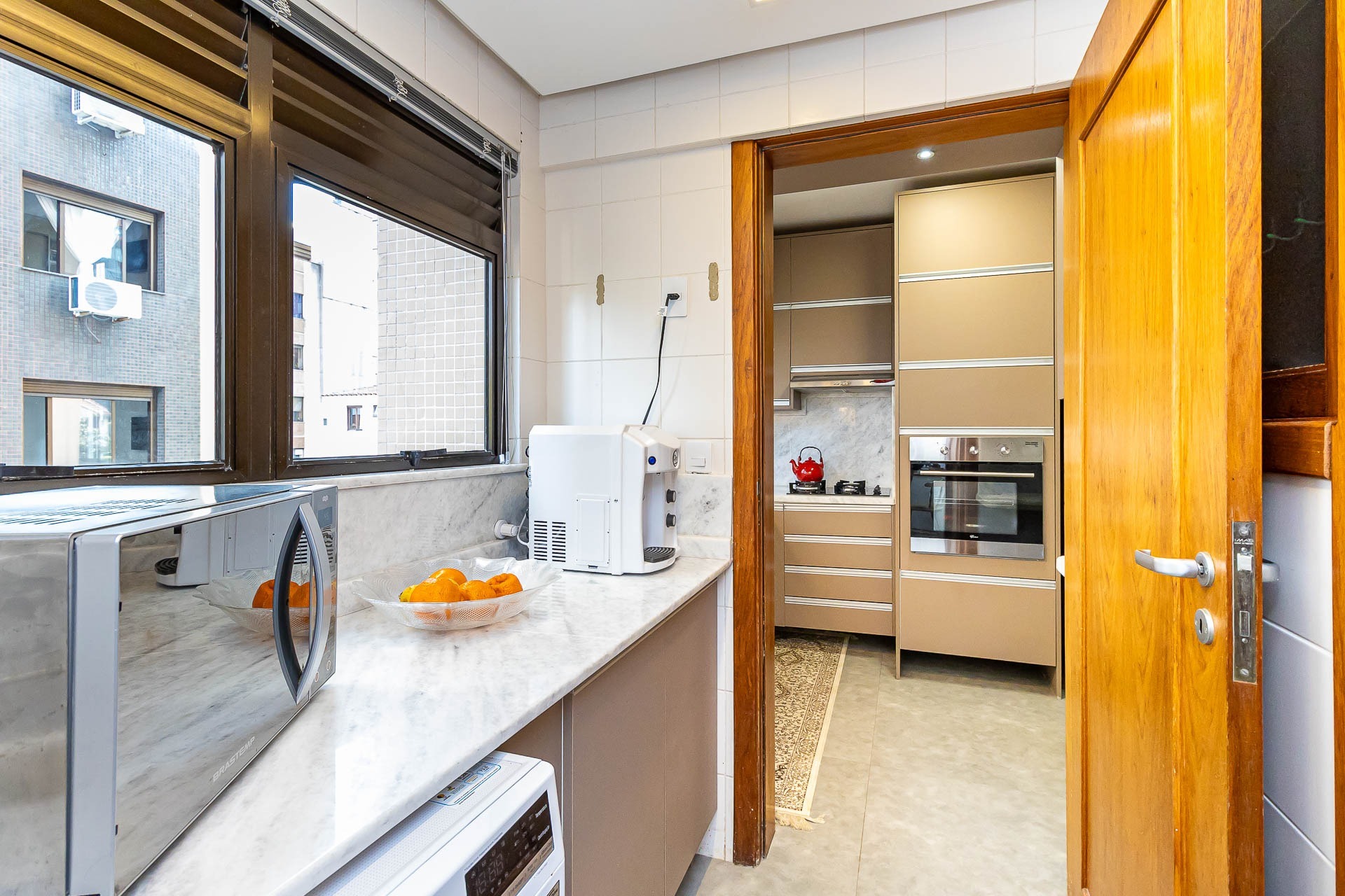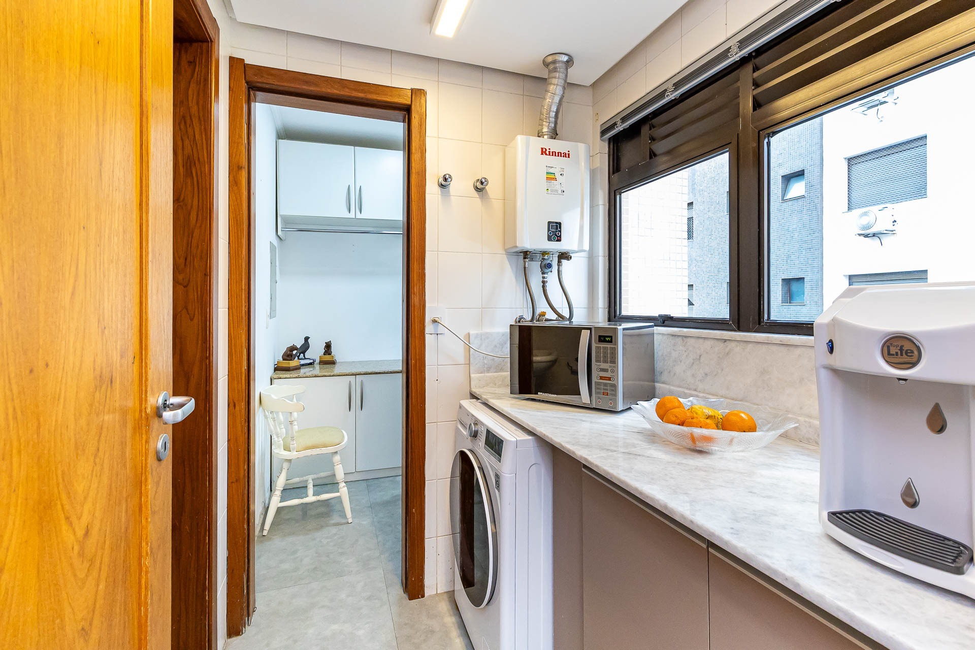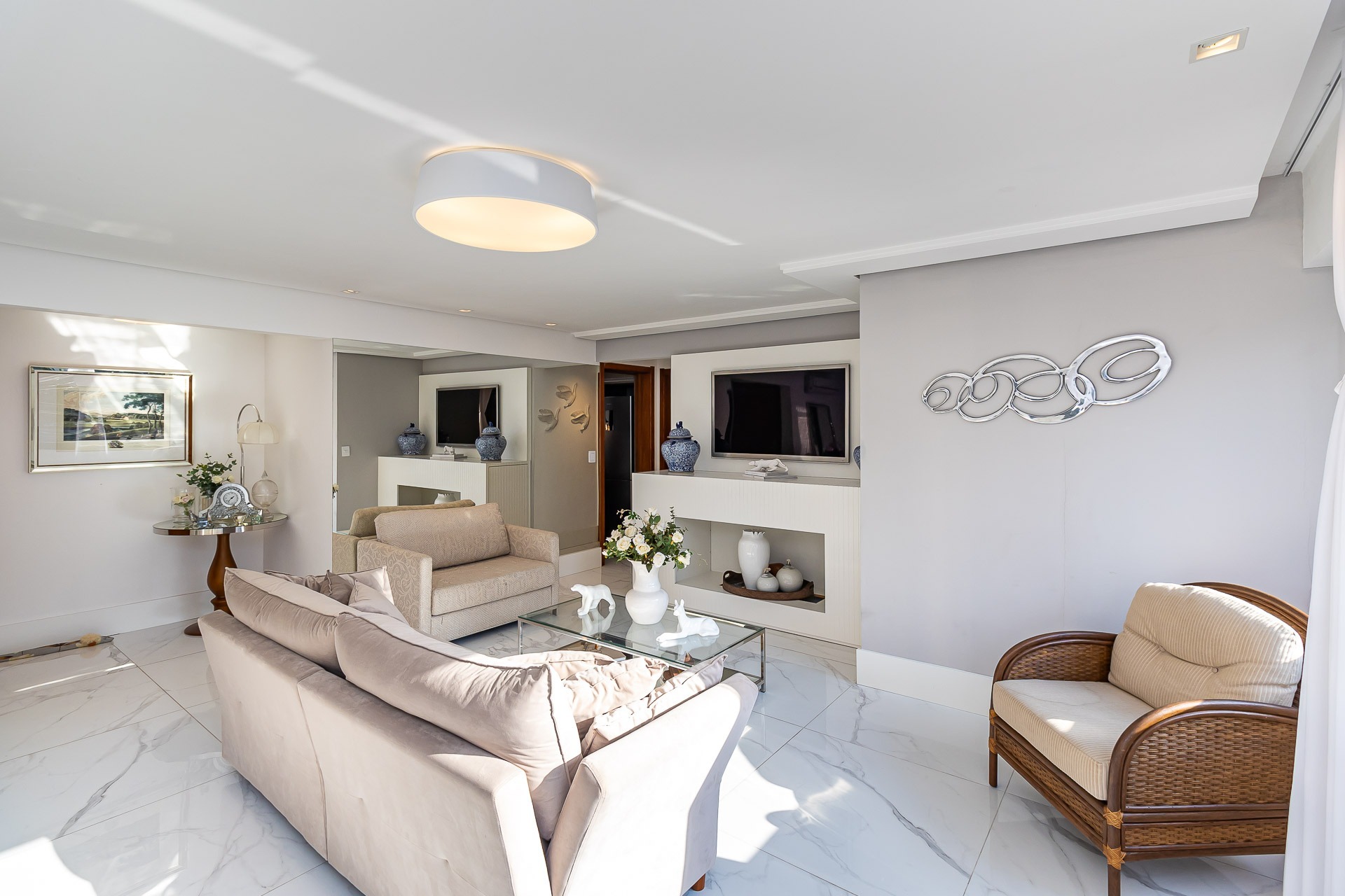Apartamento para alugar mobiliado com 4 dormitórios, sendo 2 suítes, 179m de área privativa, living com ar condicionado, sacada fechada e ampla com churrasqueira, escrivaninha, cômodas, ventiladores de teto e cortinas, banheiro social com armários, cozinha completa com armários, fogão, geladeira, micro-ondas e coifa e área de serviço.