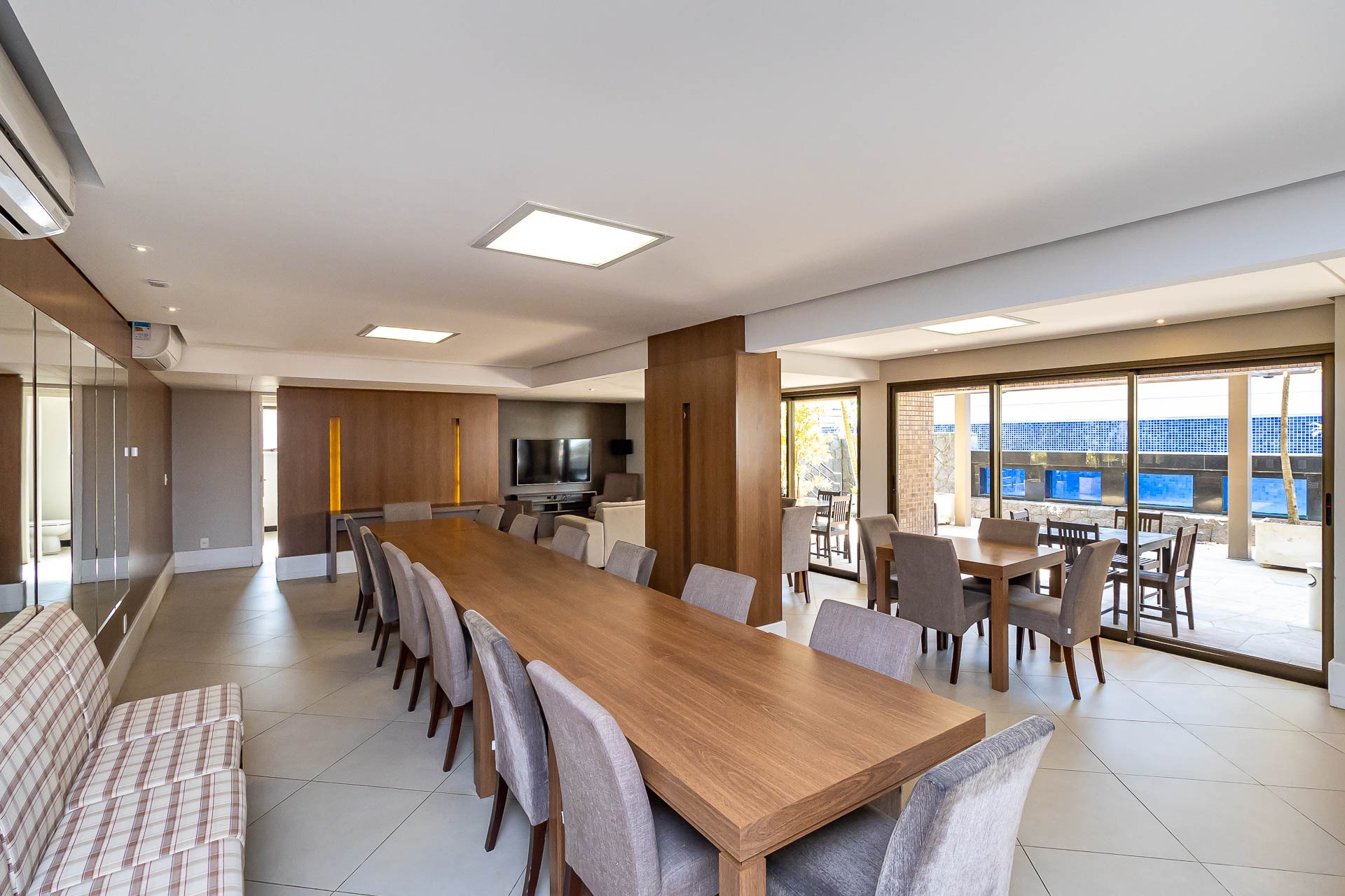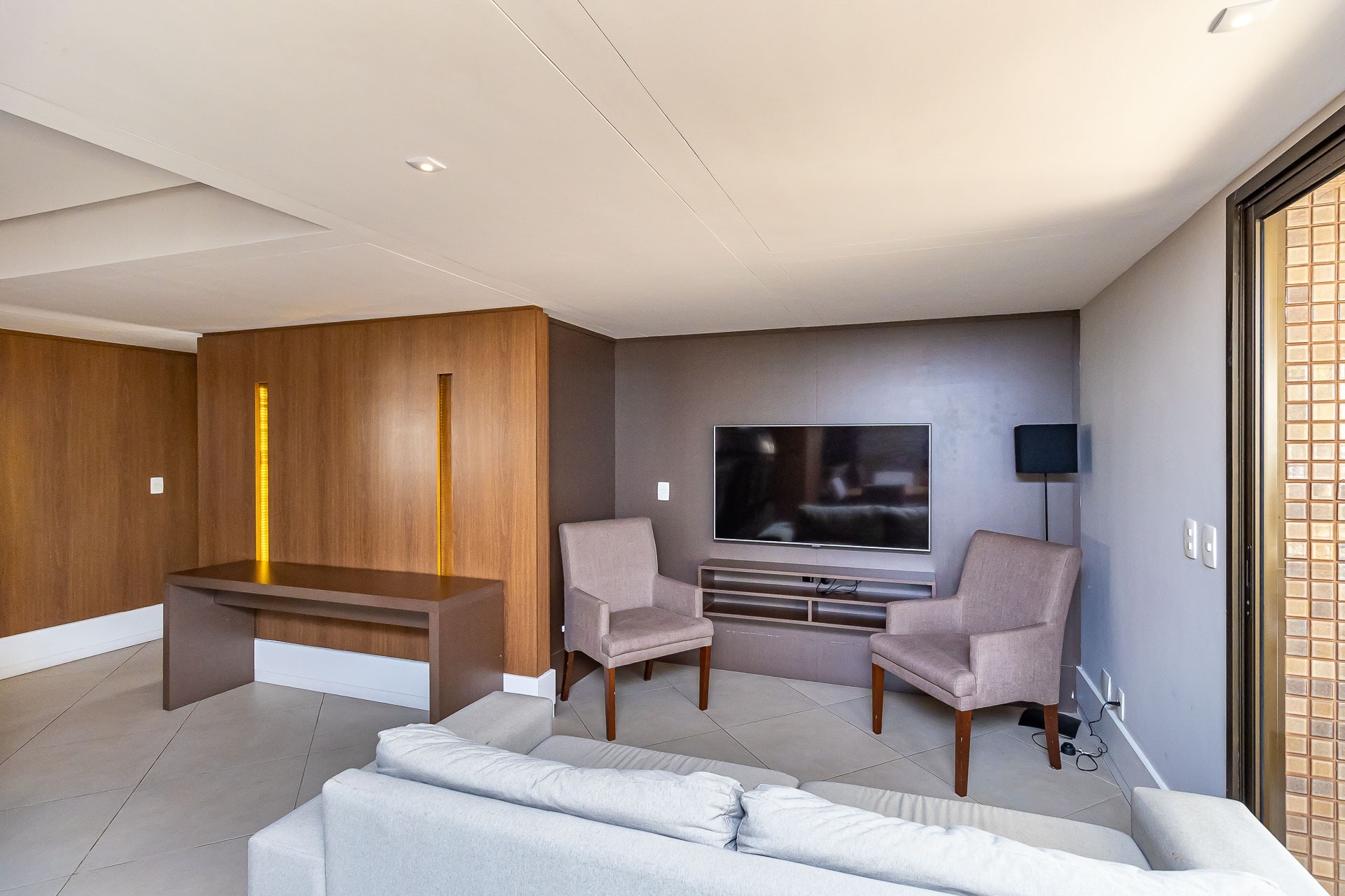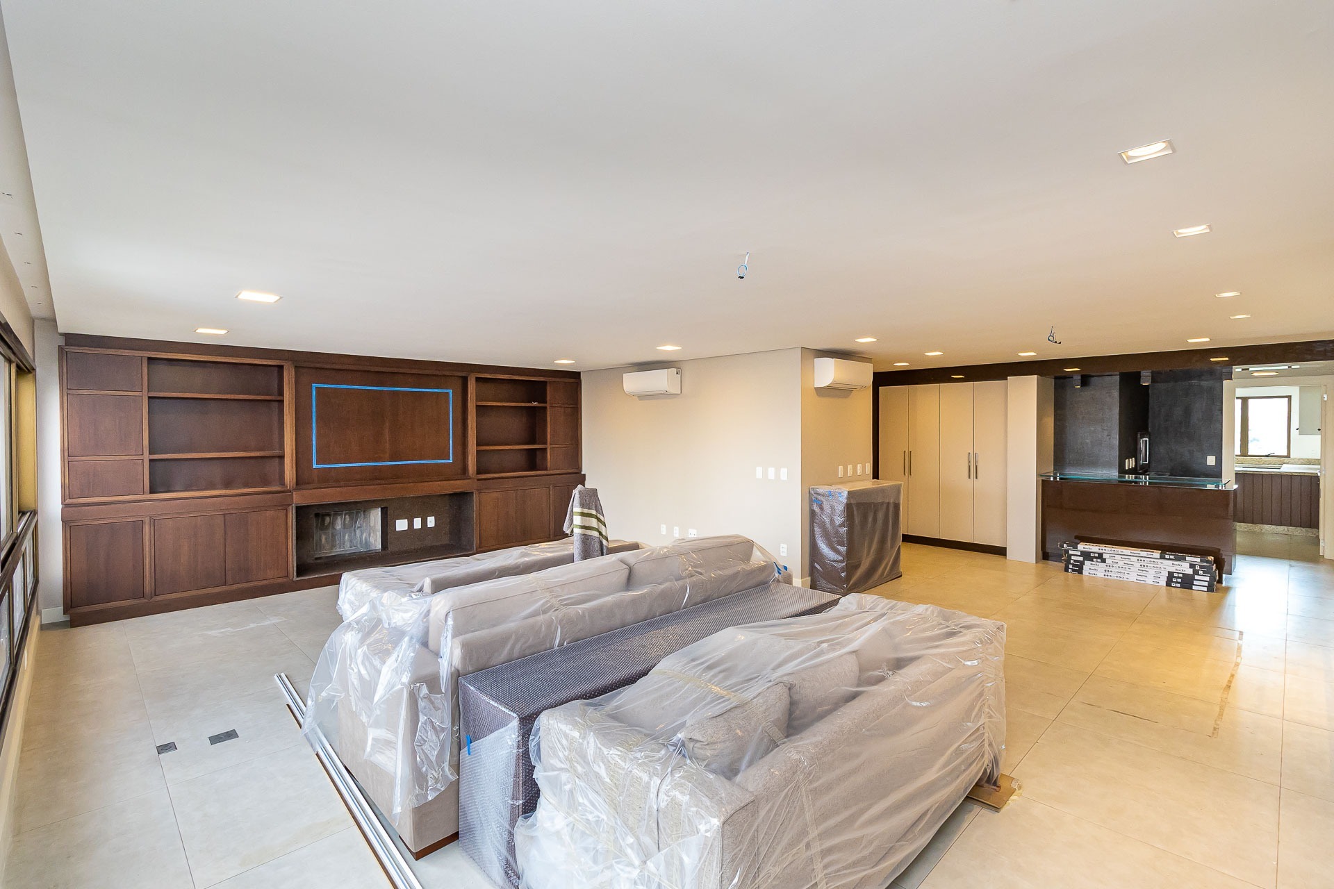Apartamento para alugar mobiliado com 4 dormitórios, sendo 2 suítes, 179m de área privativa, living com ar condicionado, sacada fechada e ampla com churrasqueira, escrivaninha, cômodas, ventiladores de teto e cortinas, banheiro social com armários, cozinha completa com armários, fogão, geladeira, micro-ondas e coifa e área de serviço.
