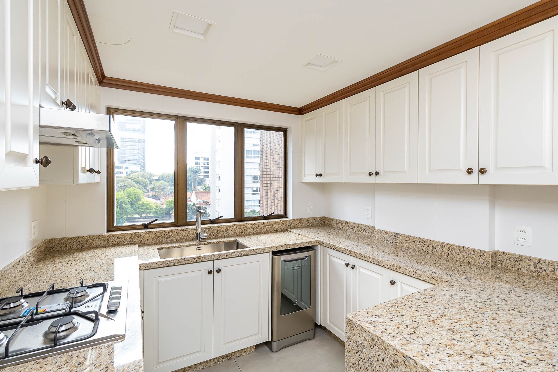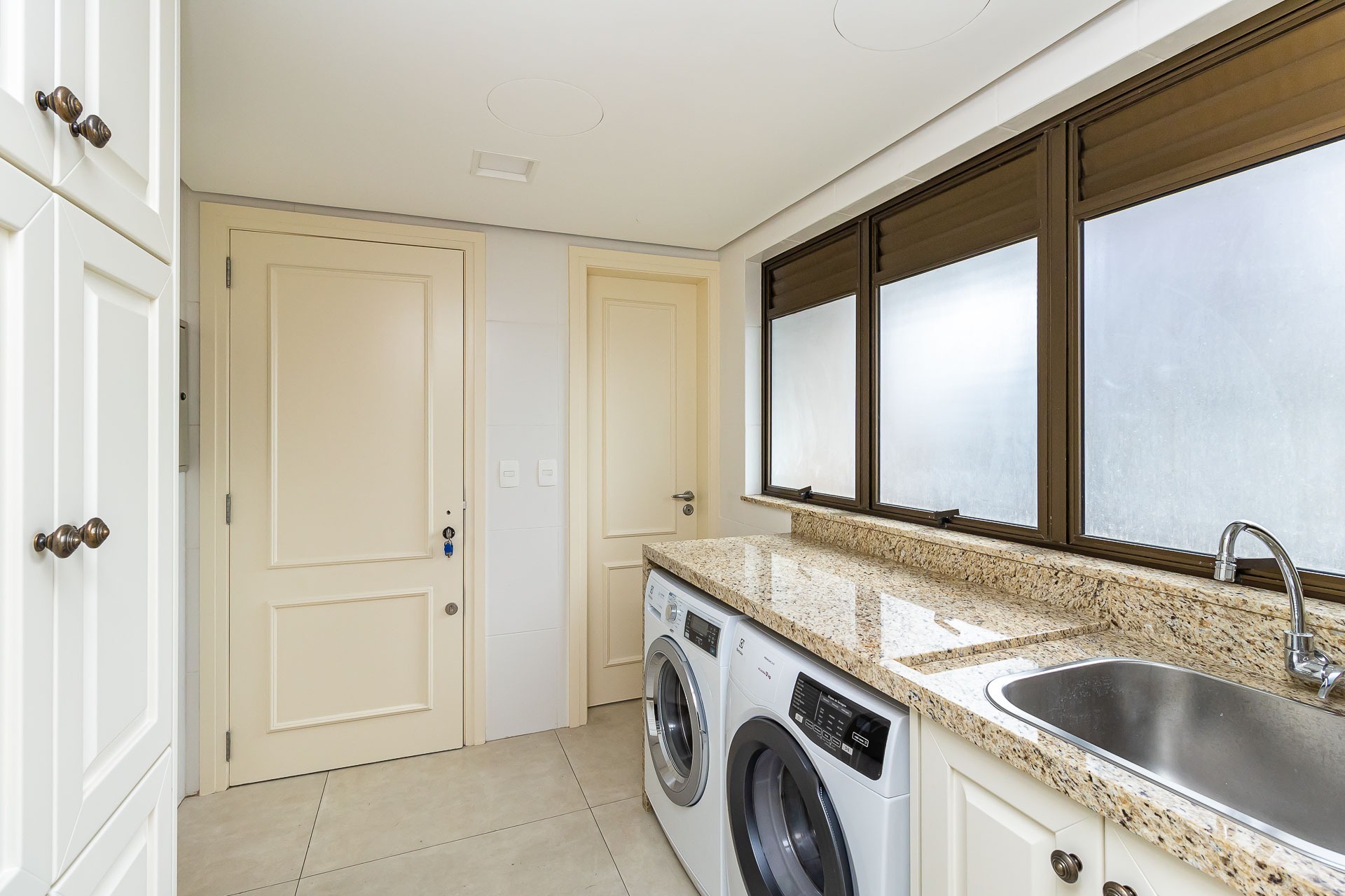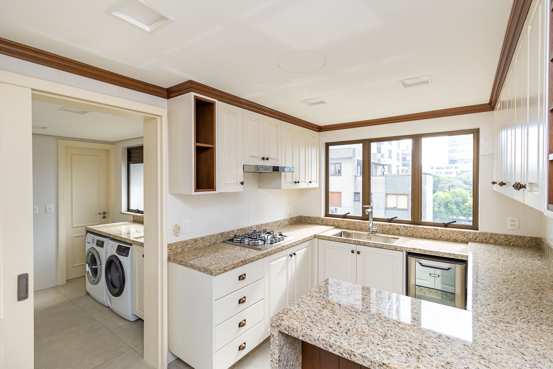 Apartamento para alugar mobiliado com 4 dormitórios, sendo 2 suítes, 179m de área privativa, living com ar condicionado, sacada fechada e ampla com churrasqueira, escrivaninha, cômodas, ventiladores de teto e cortinas, banheiro social com armários, cozinha completa com armários, fogão, geladeira, micro-ondas e coifa e área de serviço.