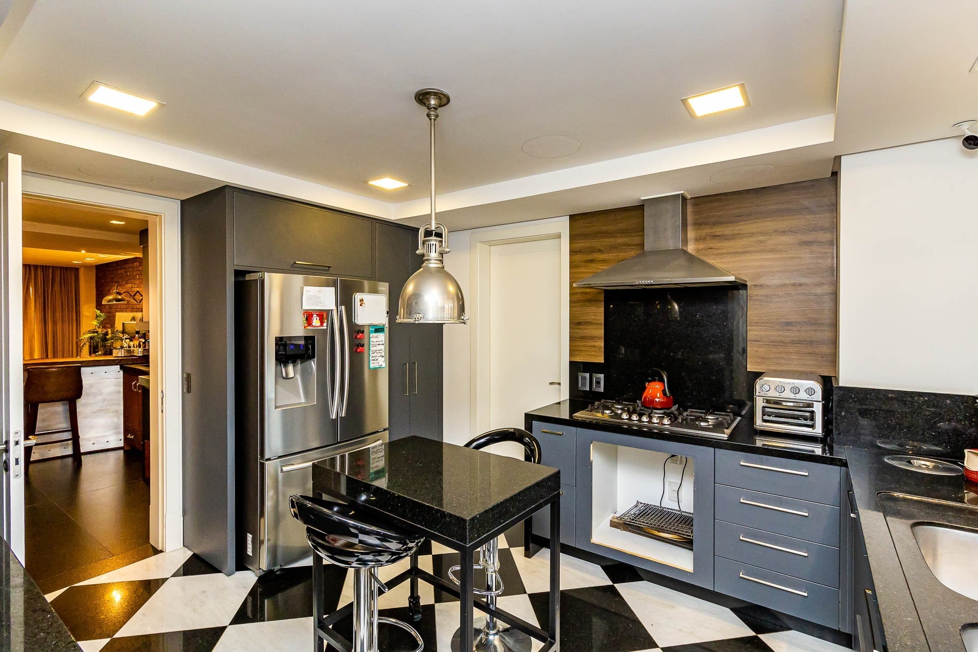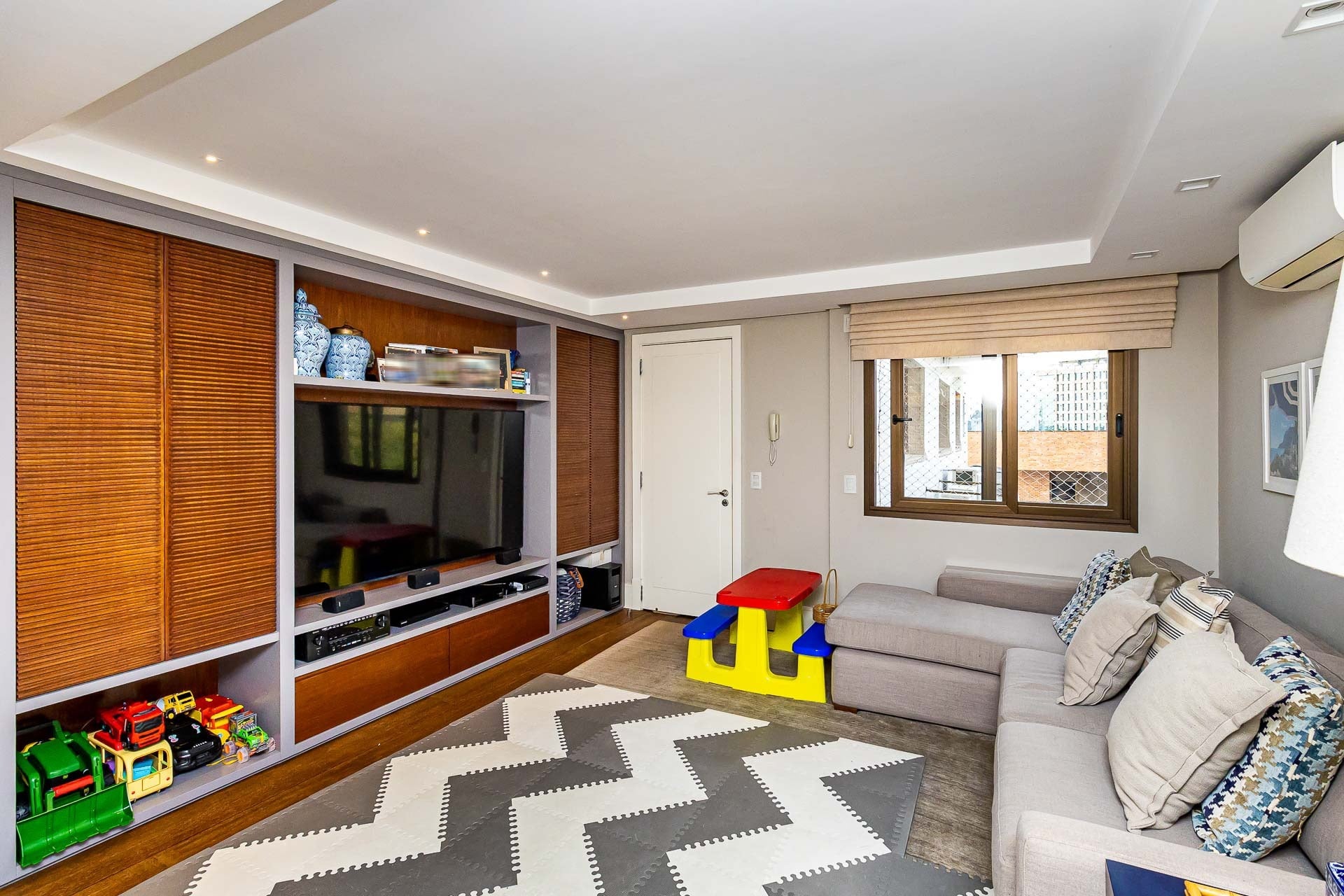 Possui área privativa de 113,96m², sendo que o imóvel conta ainda com banheiro social, amplo living 2 ambientes com churrasqueira, cozinha, área de serviço e dependência de empregada completa.