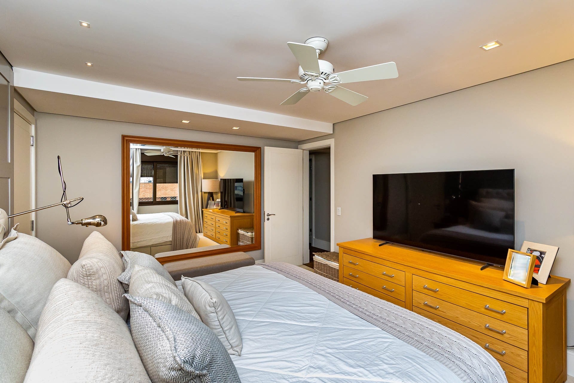 Apartamento para alugar mobiliado com 4 dormitórios, sendo 2 suítes, 179m de área privativa, living com ar condicionado, sacada fechada e ampla com churrasqueira, escrivaninha, cômodas, ventiladores de teto e cortinas, banheiro social com armários, cozinha completa com armários, fogão, geladeira, micro-ondas e coifa e área de serviço.