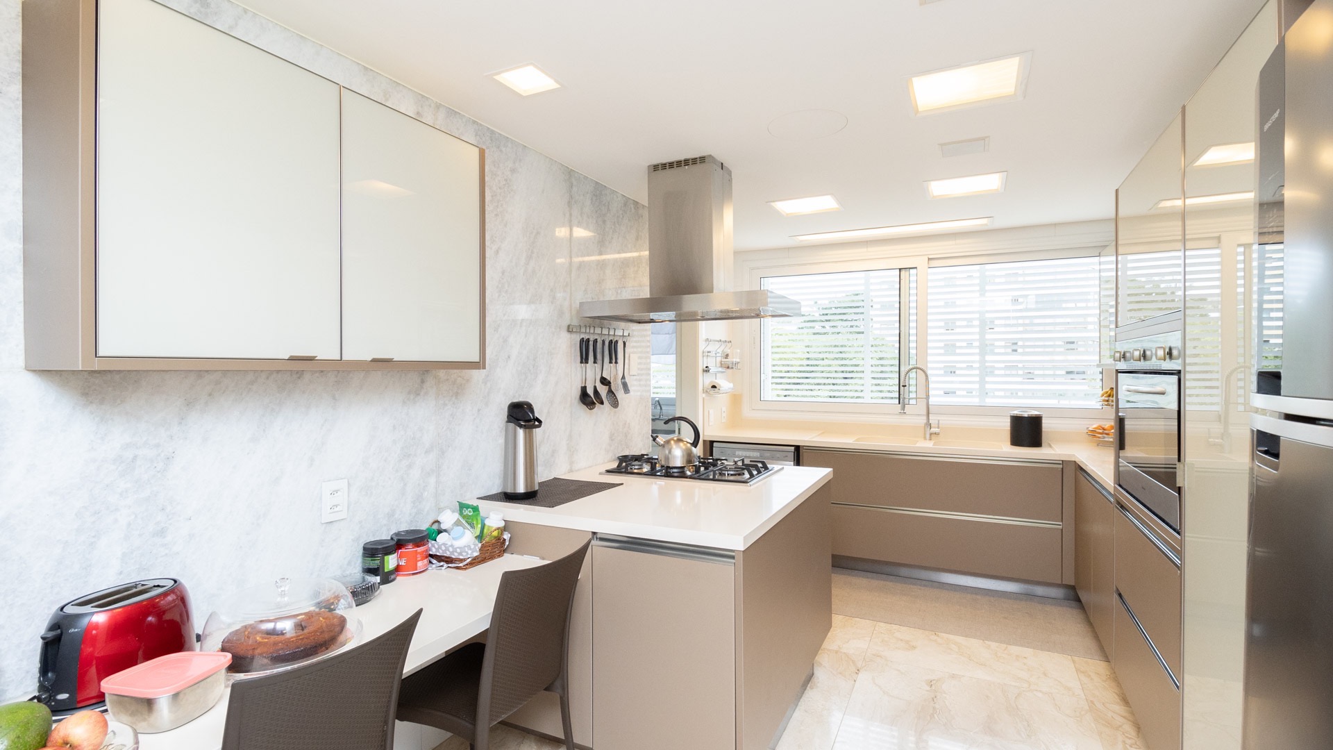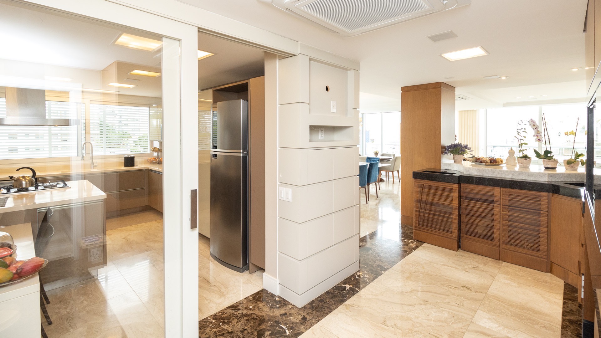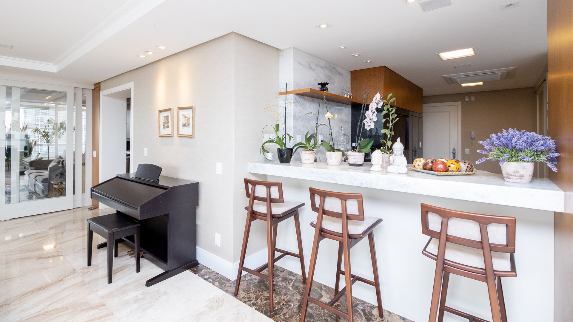 Living amplo, finamente decorado, sacada espaçosa e ensolarada, espaço gourmet e cozinha com ilha impecável, lavanderia separada e dependência de empregada. 4 vagas de garagem individuais sendo uma delas com depósito.