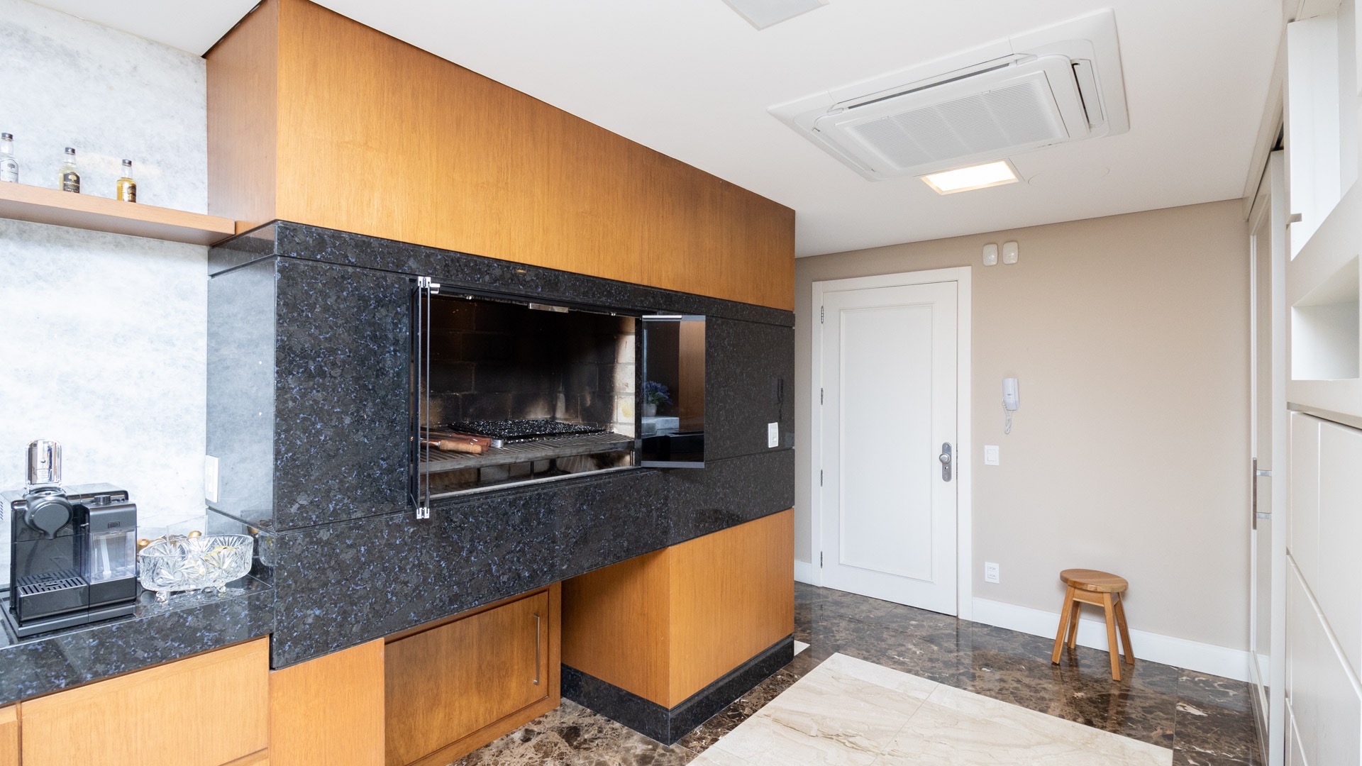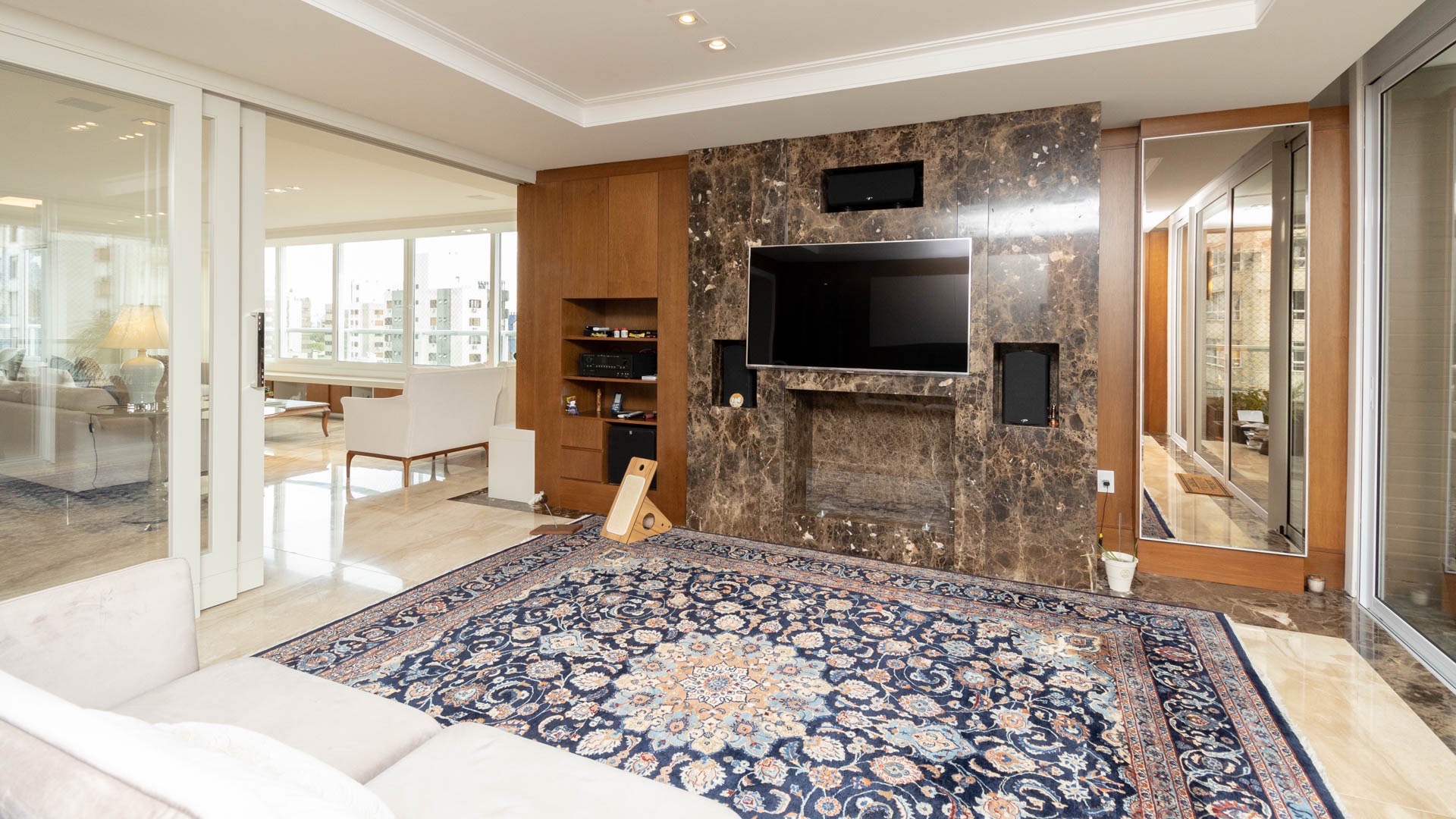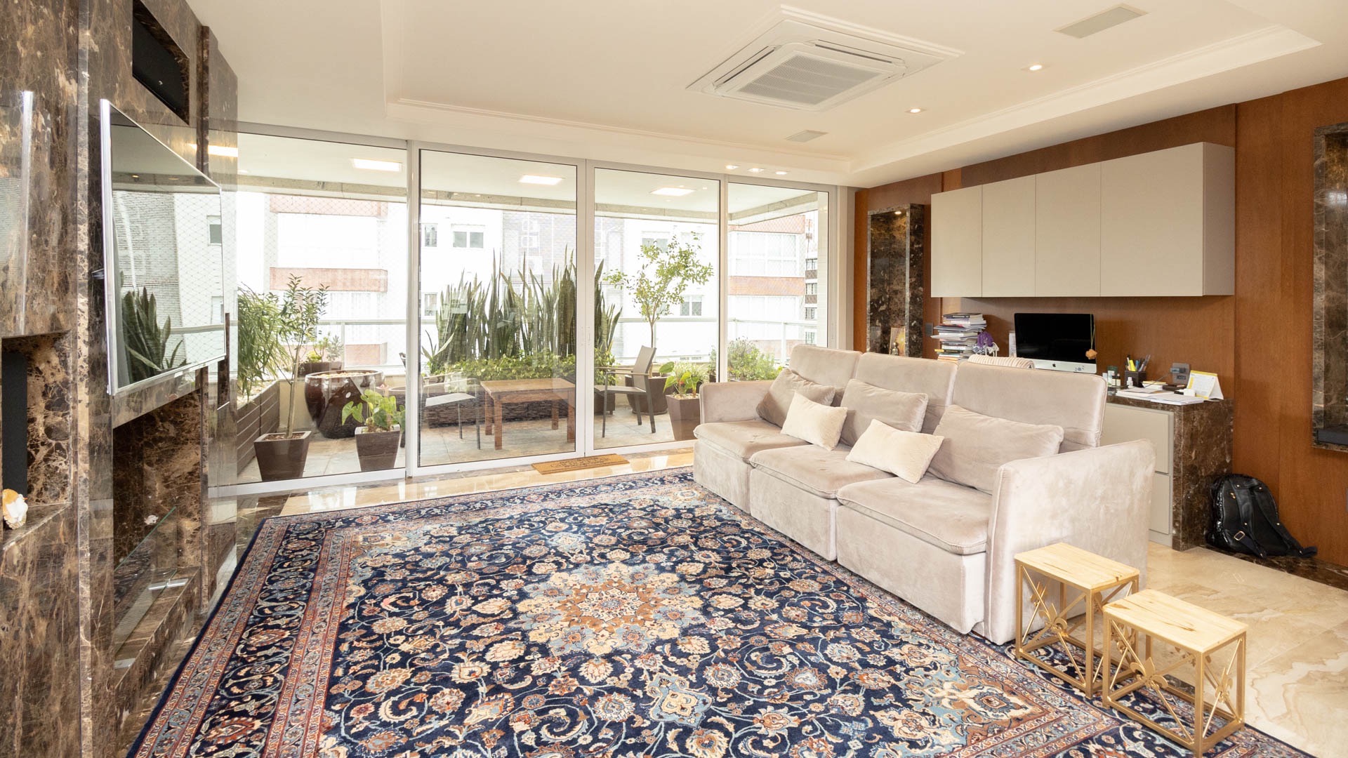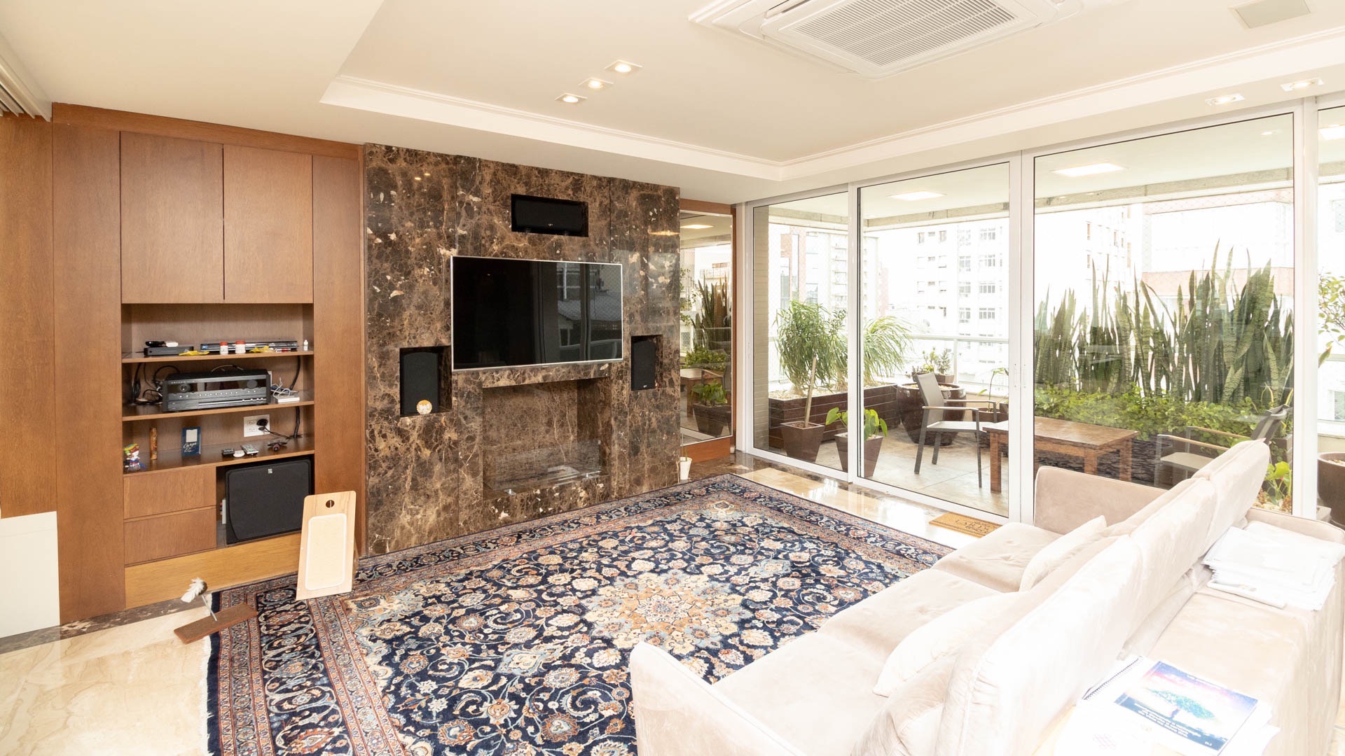 Amplo living equipado com lareira canadense, detalhe que proporciona aconchego nos dias mais frios.