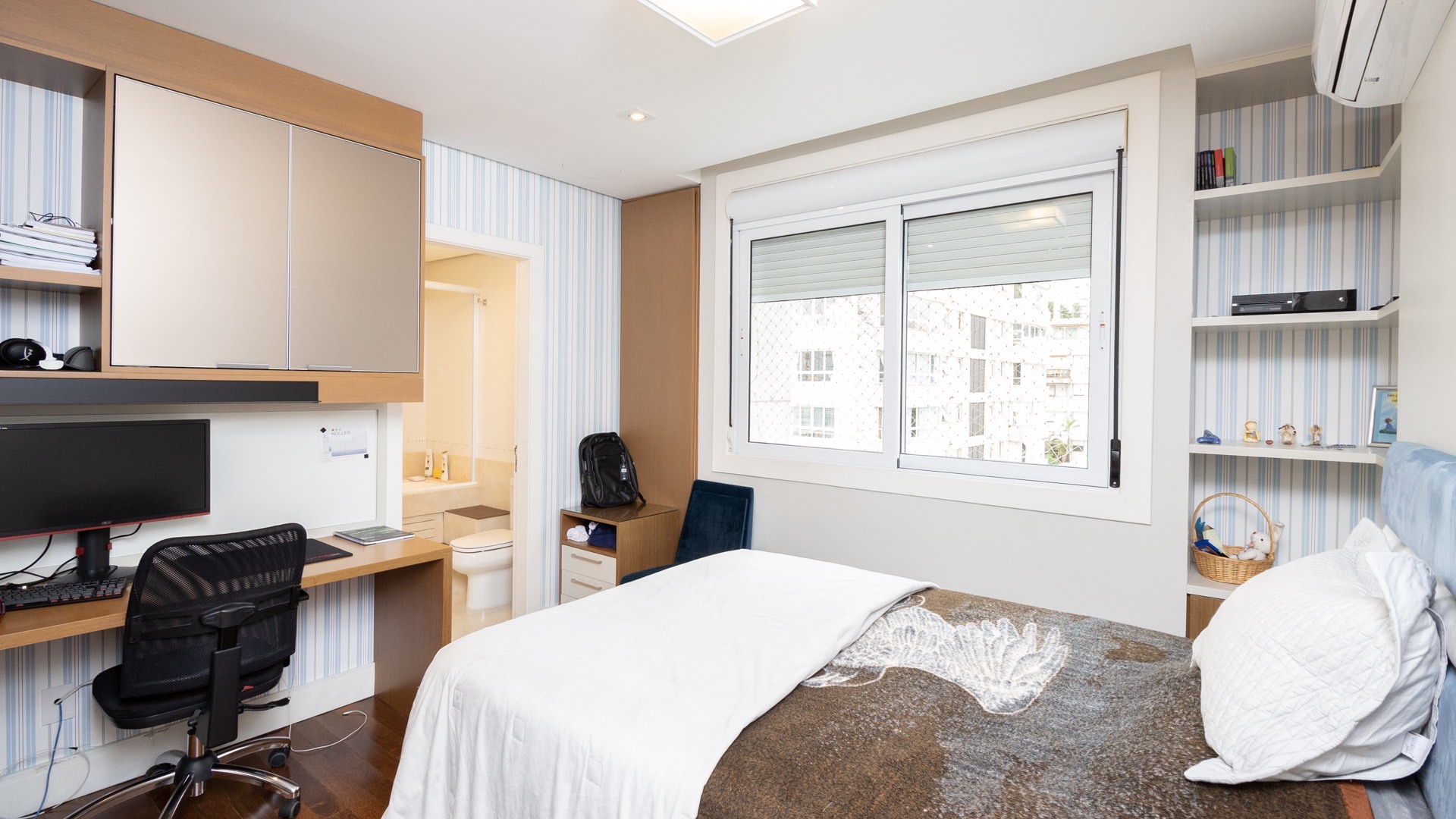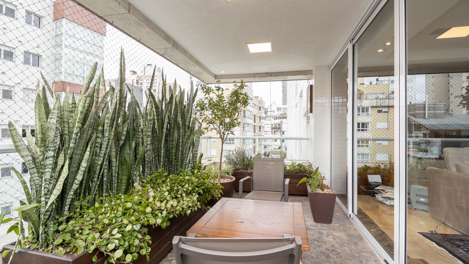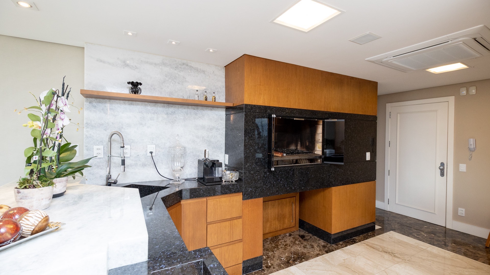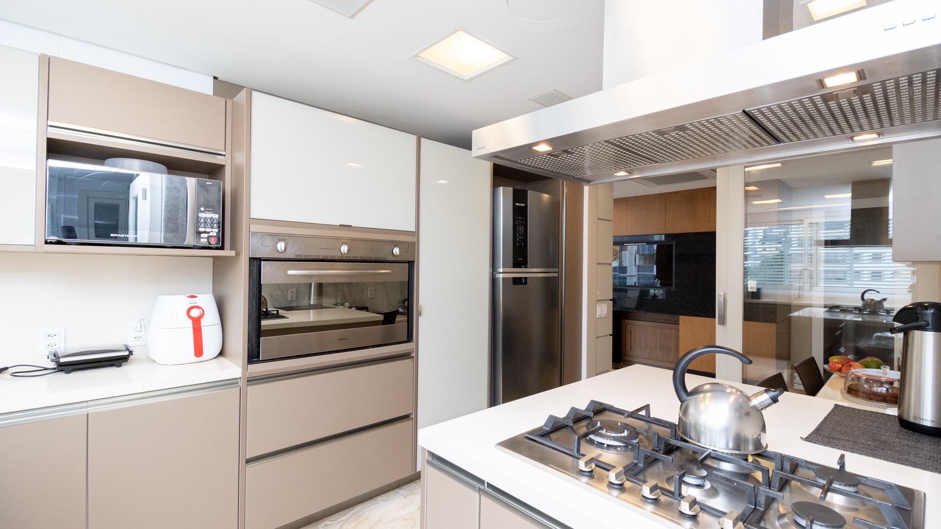 Amplo living equipado com lareira canadense, detalhe que proporciona aconchego nos dias mais frios.