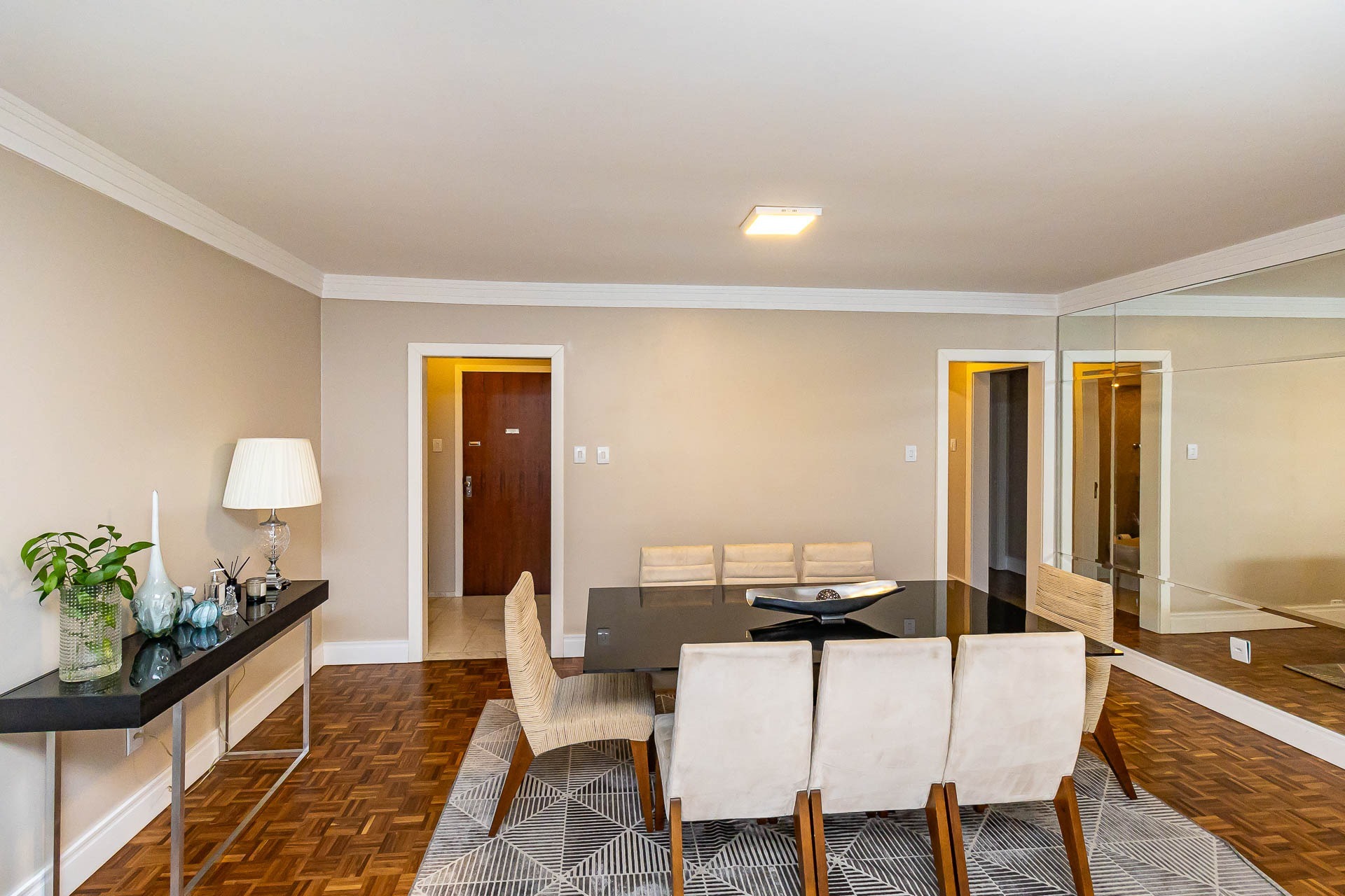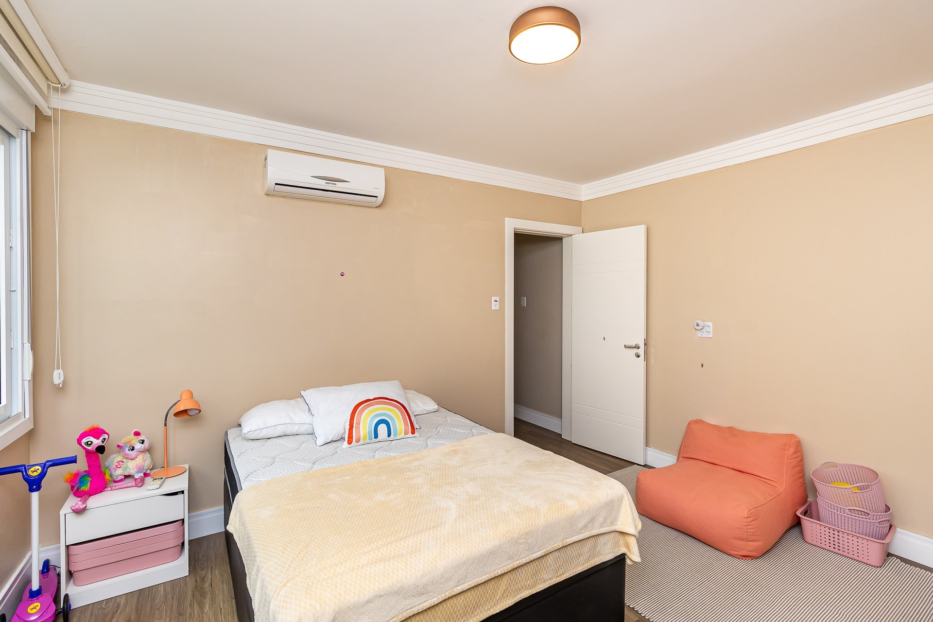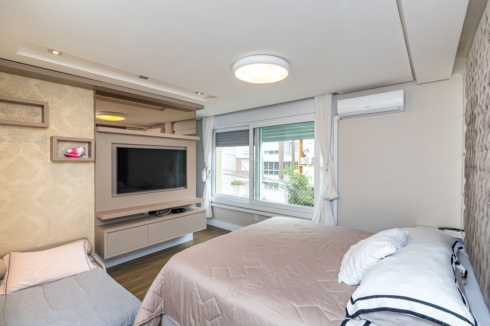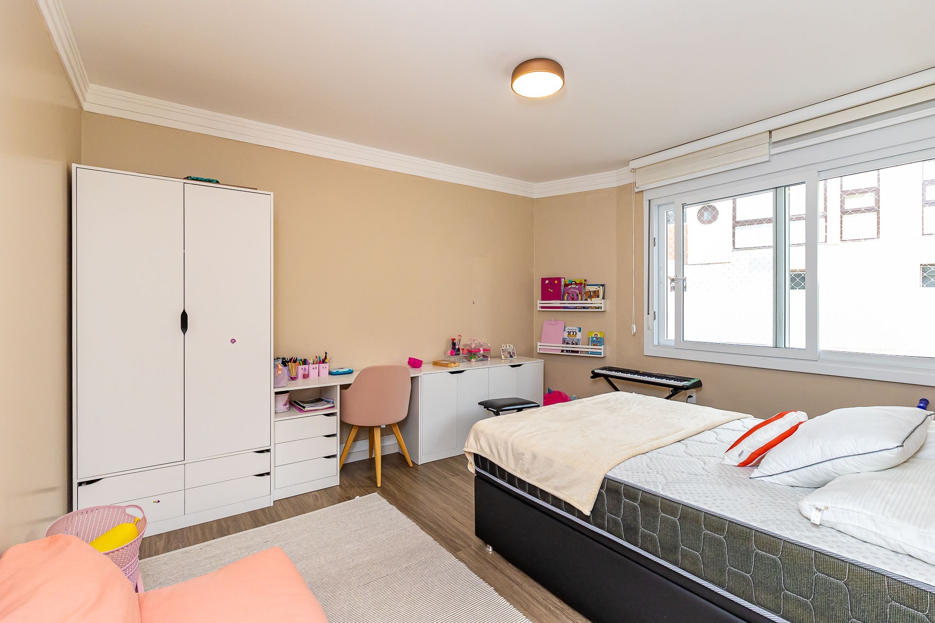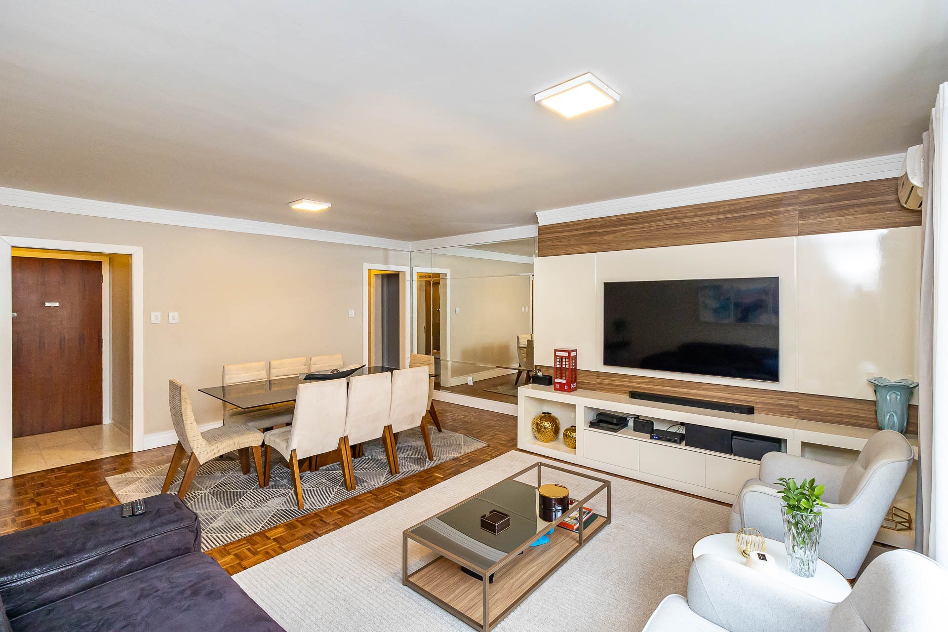 Apartamento para alugar mobiliado com 4 dormitórios, sendo 2 suítes, 179m de área privativa, living com ar condicionado, sacada fechada e ampla com churrasqueira, escrivaninha, cômodas, ventiladores de teto e cortinas, banheiro social com armários, cozinha completa com armários, fogão, geladeira, micro-ondas e coifa e área de serviço.