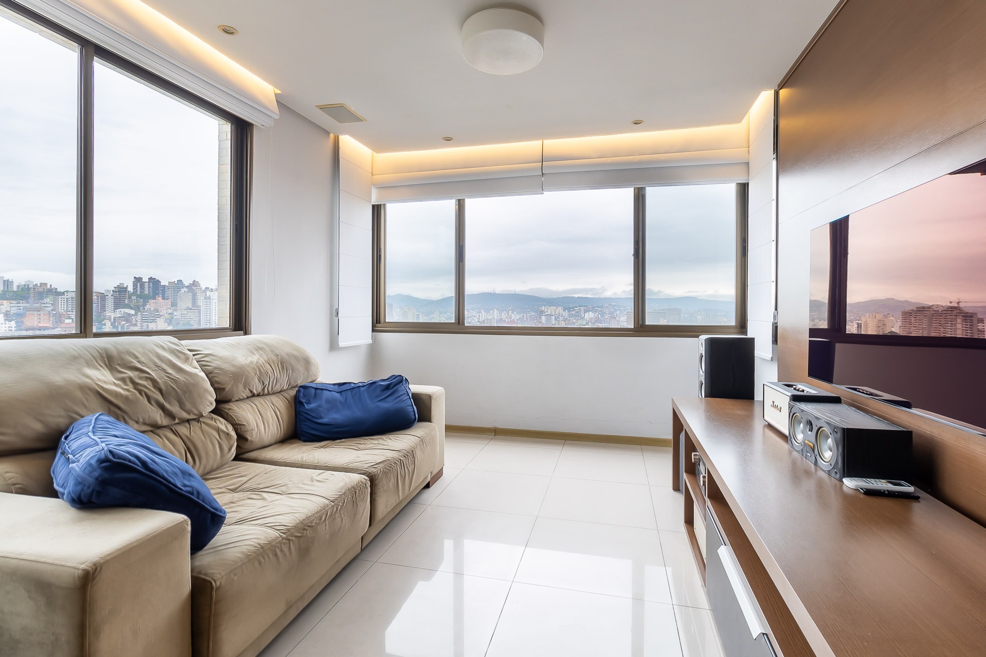 Apartamento 3 suítes, em andar alto, com 172m² de área privativa, 3 vagas de garagem. Amplo living equipado com lareira, ideal para os dias mais frios.