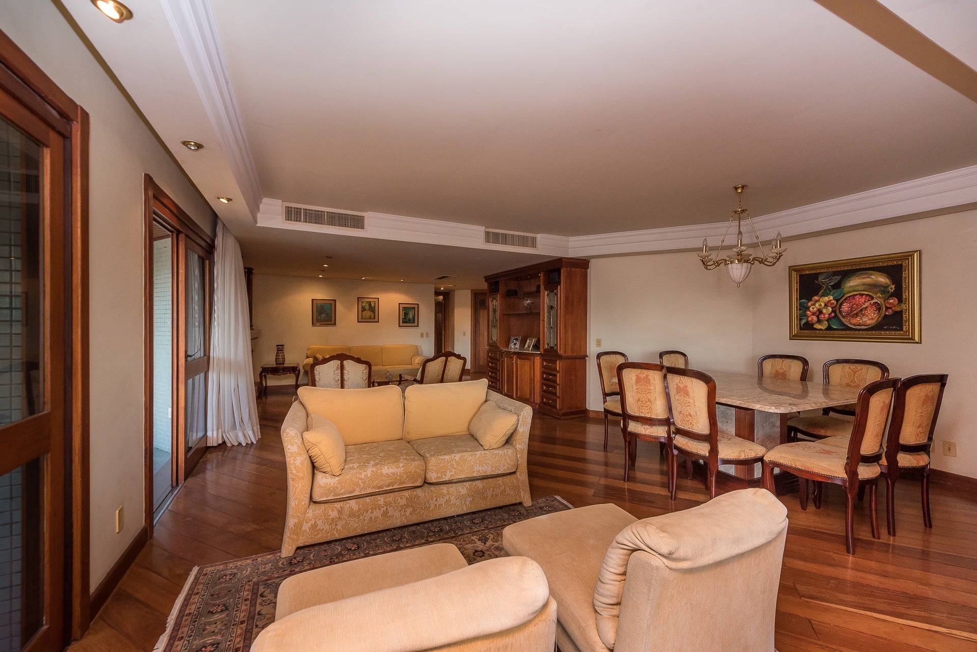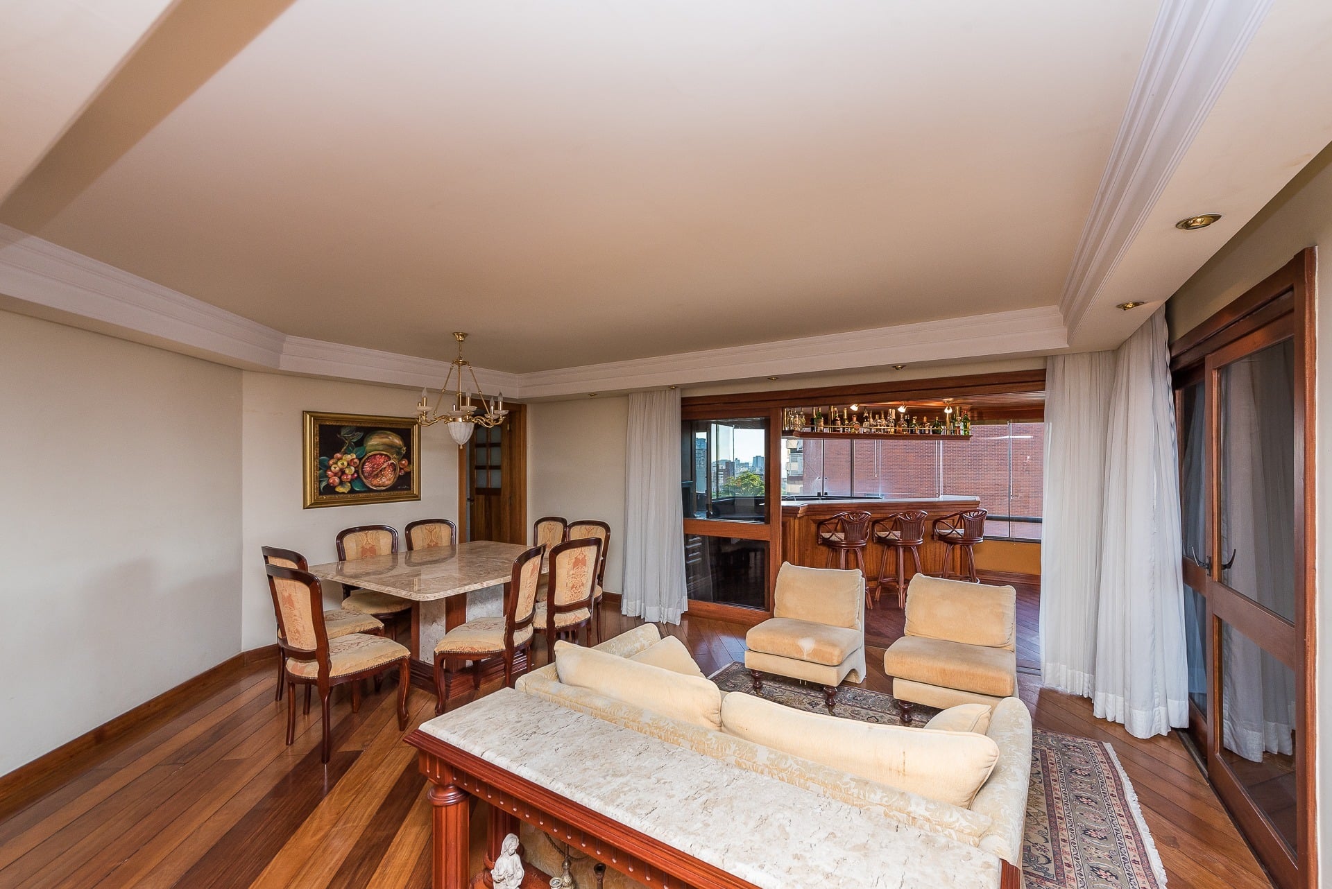 Apartamento para alugar mobiliado com 4 dormitórios, sendo 2 suítes, 179m de área privativa, living com ar condicionado, sacada fechada e ampla com churrasqueira, escrivaninha, cômodas, ventiladores de teto e cortinas, banheiro social com armários, cozinha completa com armários, fogão, geladeira, micro-ondas e coifa e área de serviço.