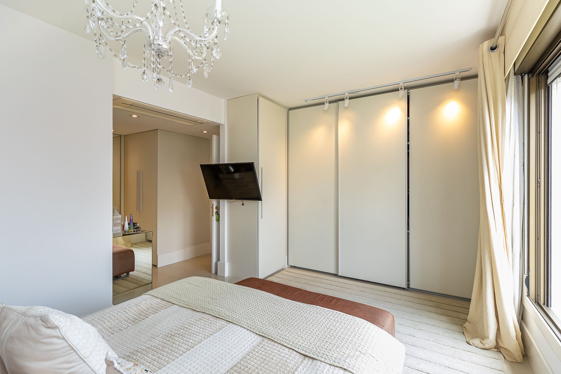 Apartamento para alugar mobiliado com 4 dormitórios, sendo 2 suítes, 179m de área privativa, living com ar condicionado, sacada fechada e ampla com churrasqueira, escrivaninha, cômodas, ventiladores de teto e cortinas, banheiro social com armários, cozinha completa com armários, fogão, geladeira, micro-ondas e coifa e área de serviço.