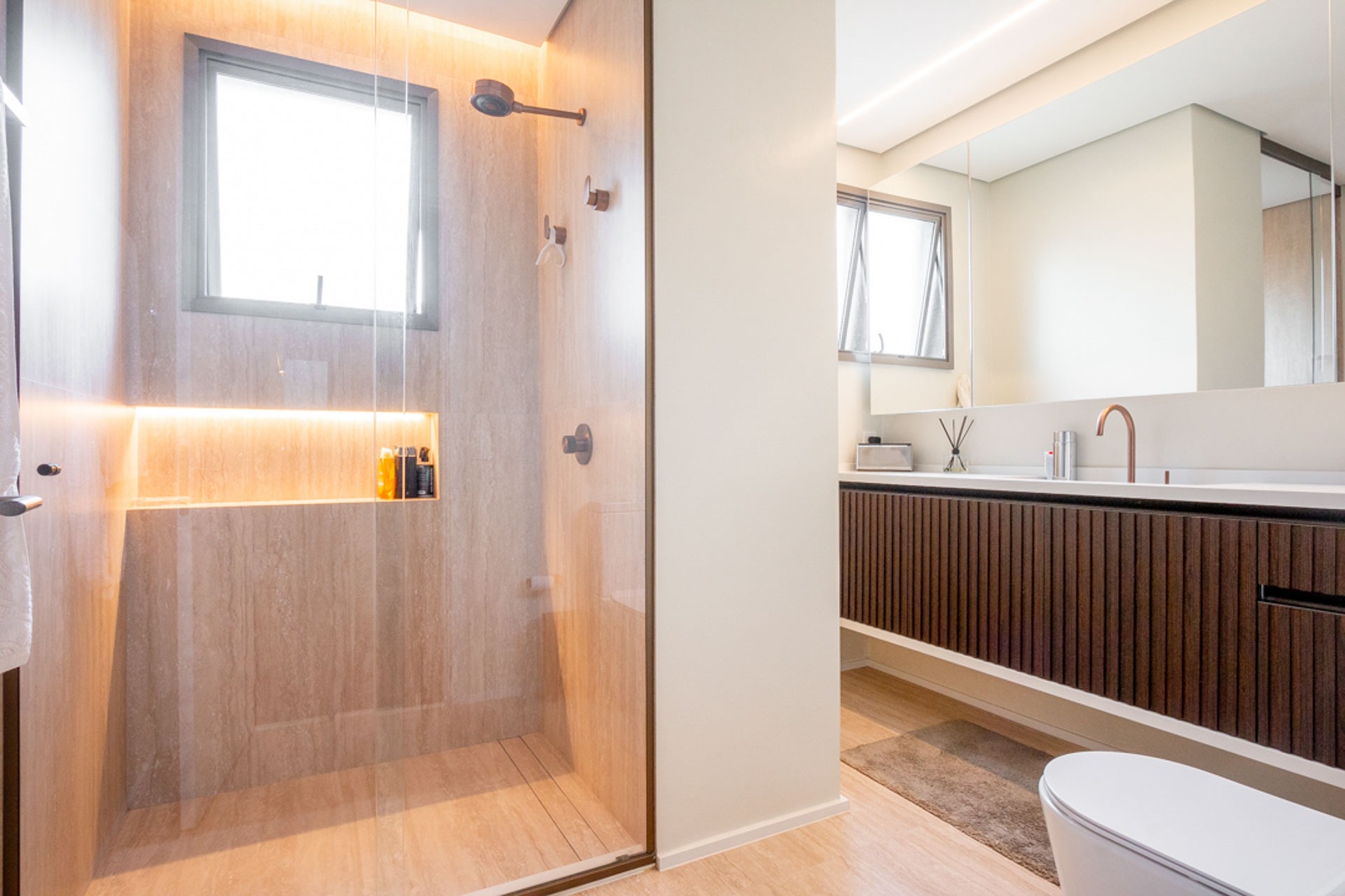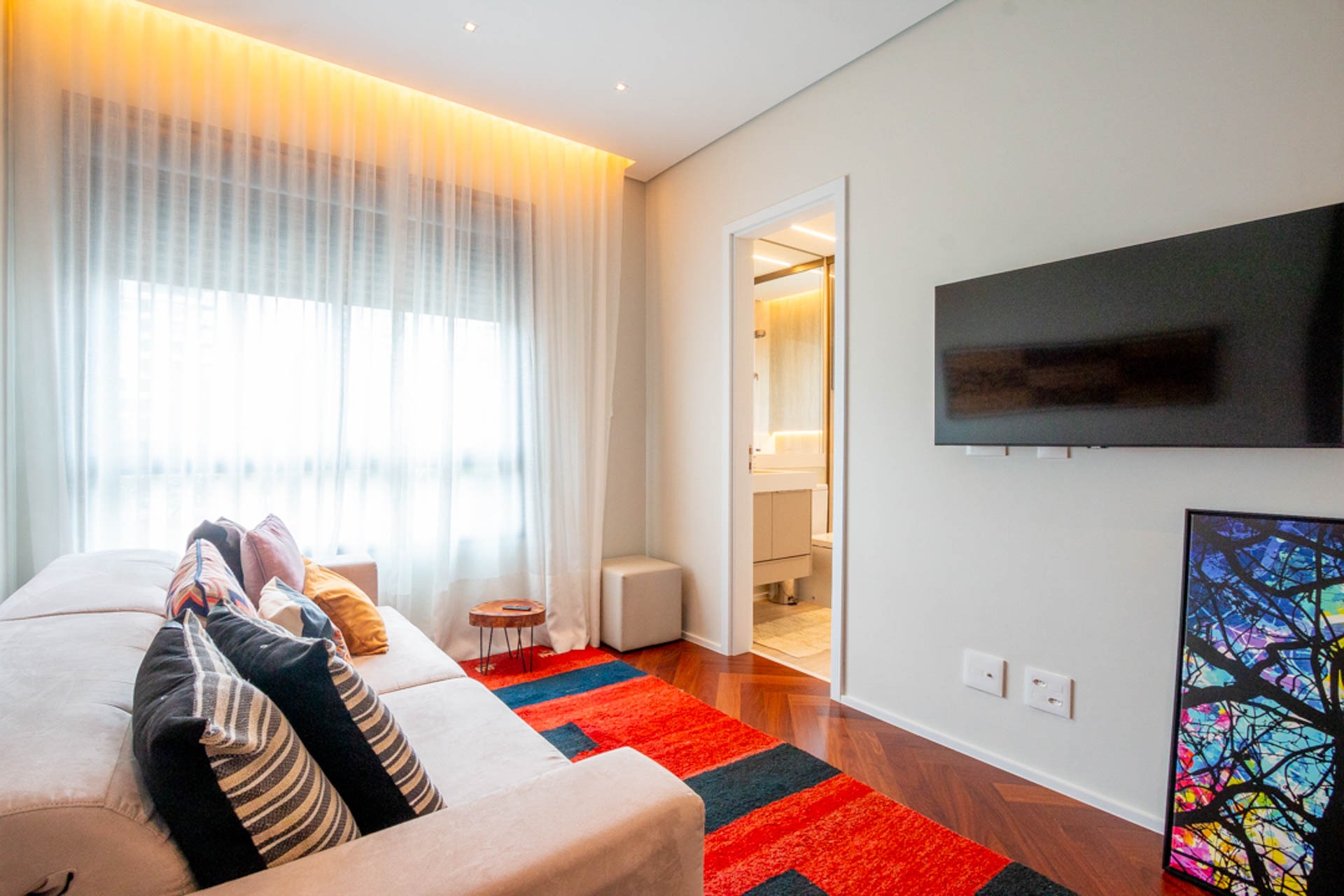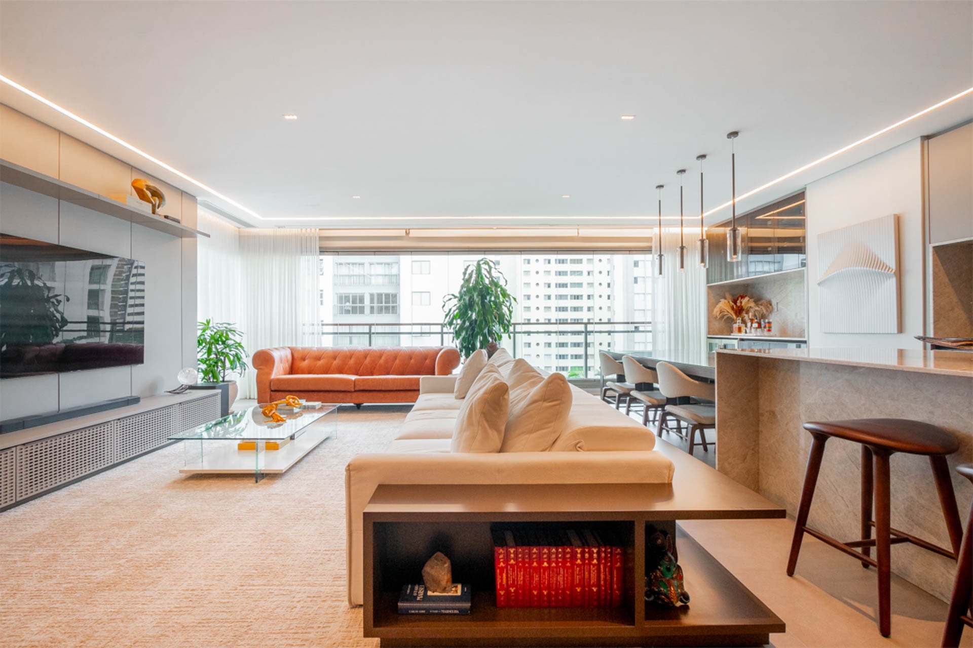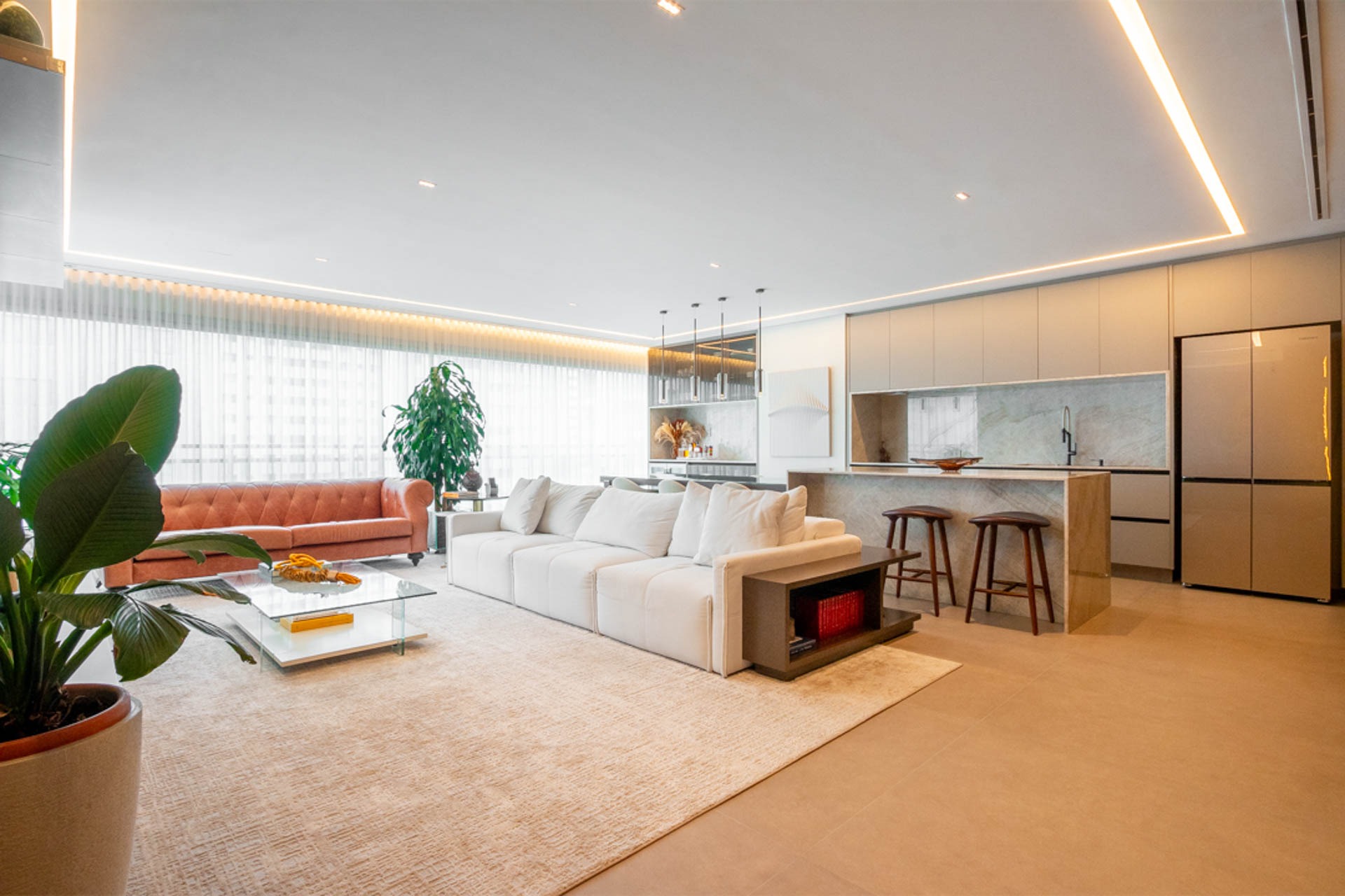 UM AMPLO LIVING, COM PÉ DIREITO DUPLO E UMA ILUMINAÇÃO NATURAL IMPRESSIONANTE, QUE OFERECE UMA EXPERIÊNCIA COMPLETA DE BEM-ESTAR E ACONCHEGO.
