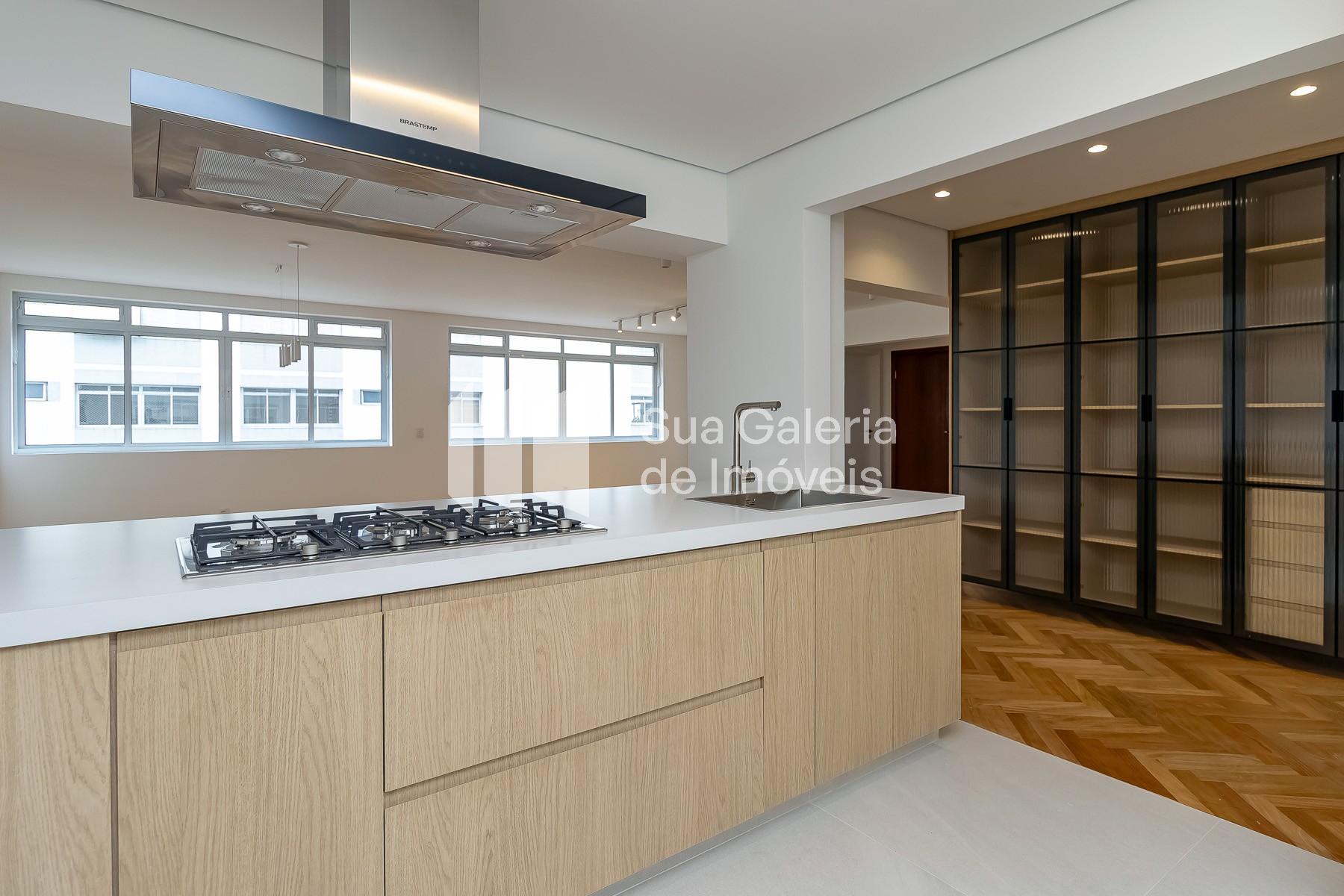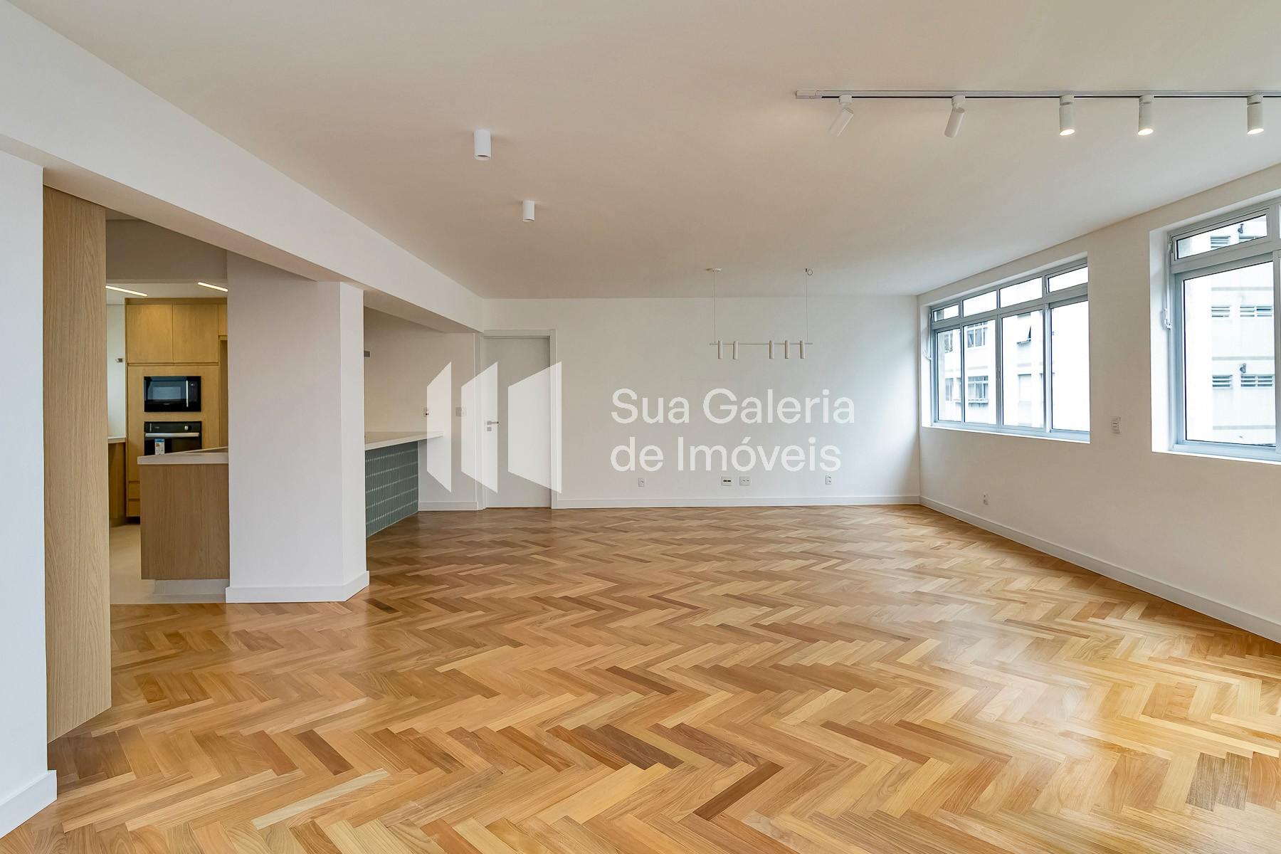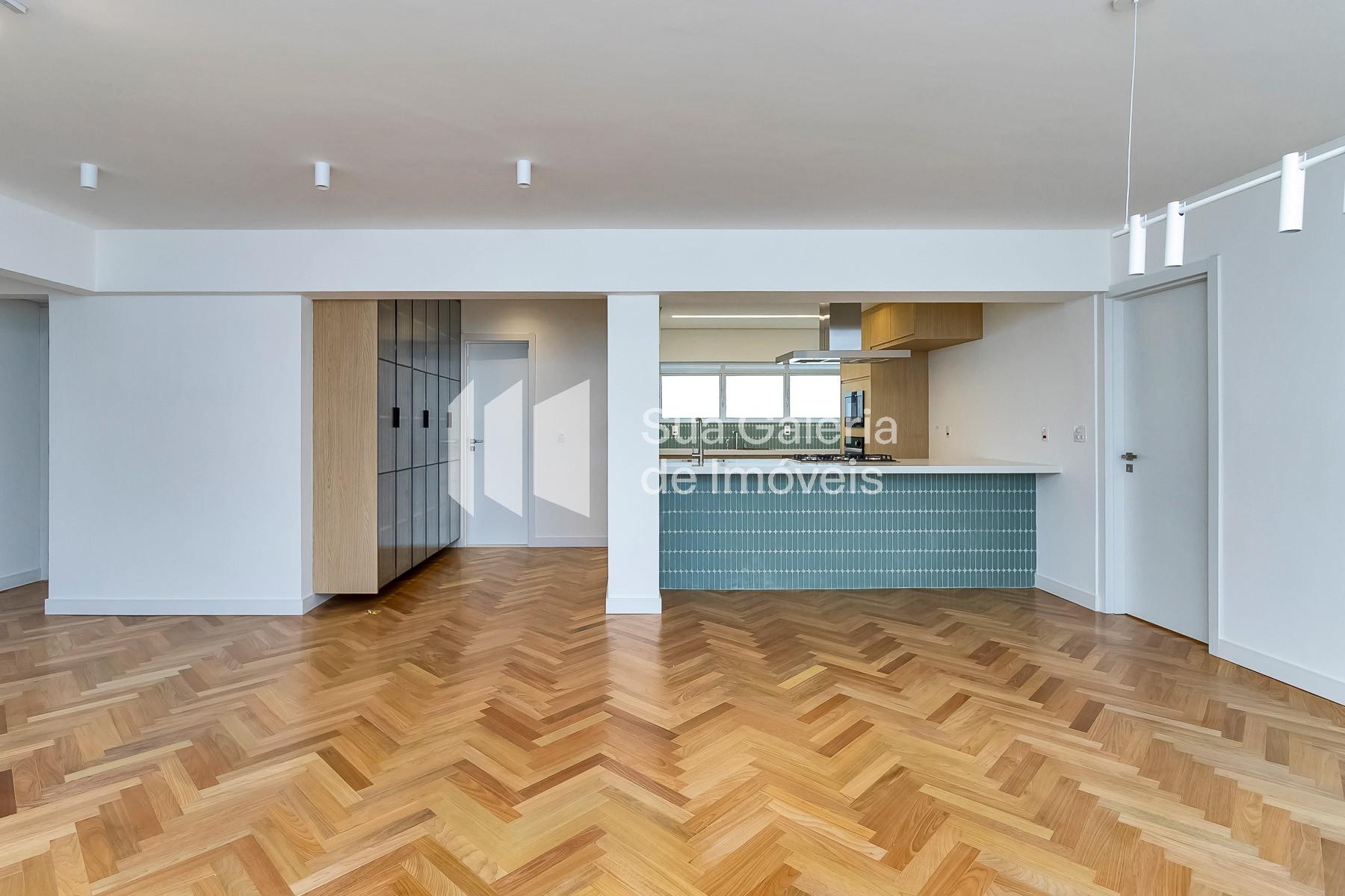 Apartamento reformado à venda Jardim América com 158.6 m² de área útil, 3 quartos sendo 2 suítes, lavabo e cozinha integrada.