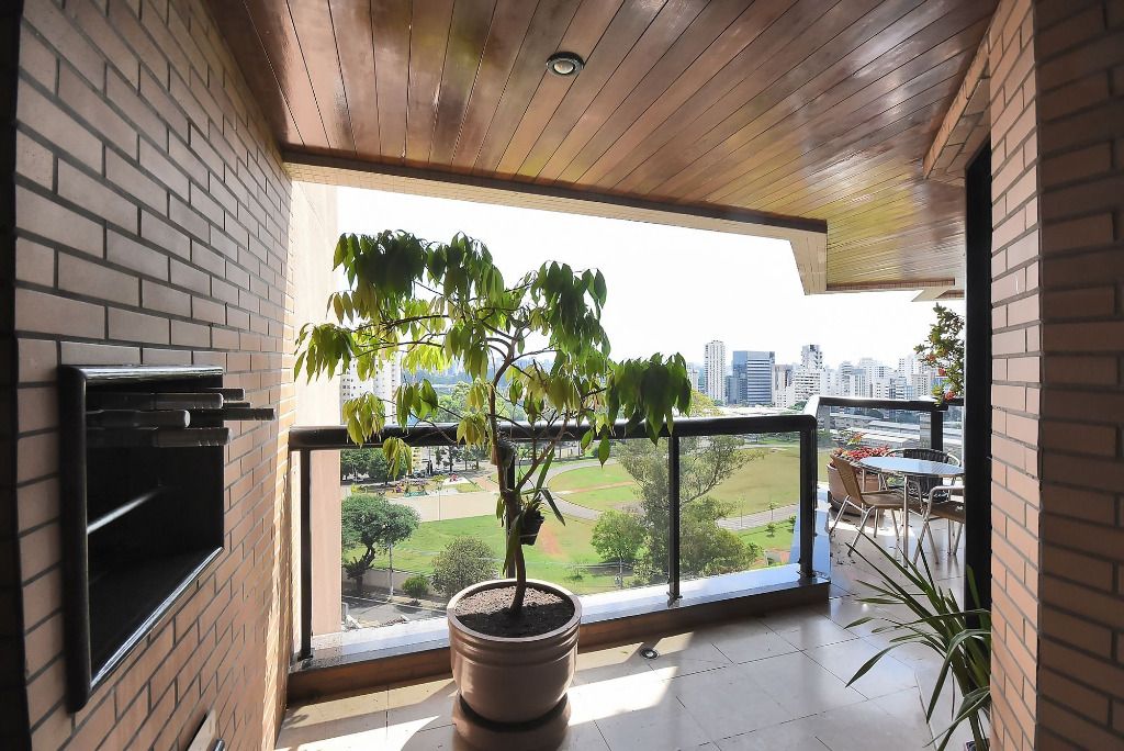 O piso superior possui uma das suítes, cozinha de apoio, sala de estar, lavabo, piscina, churrasqueira e um amplo espaço para lazer, com vista para o Parque do Ibirapuera.
