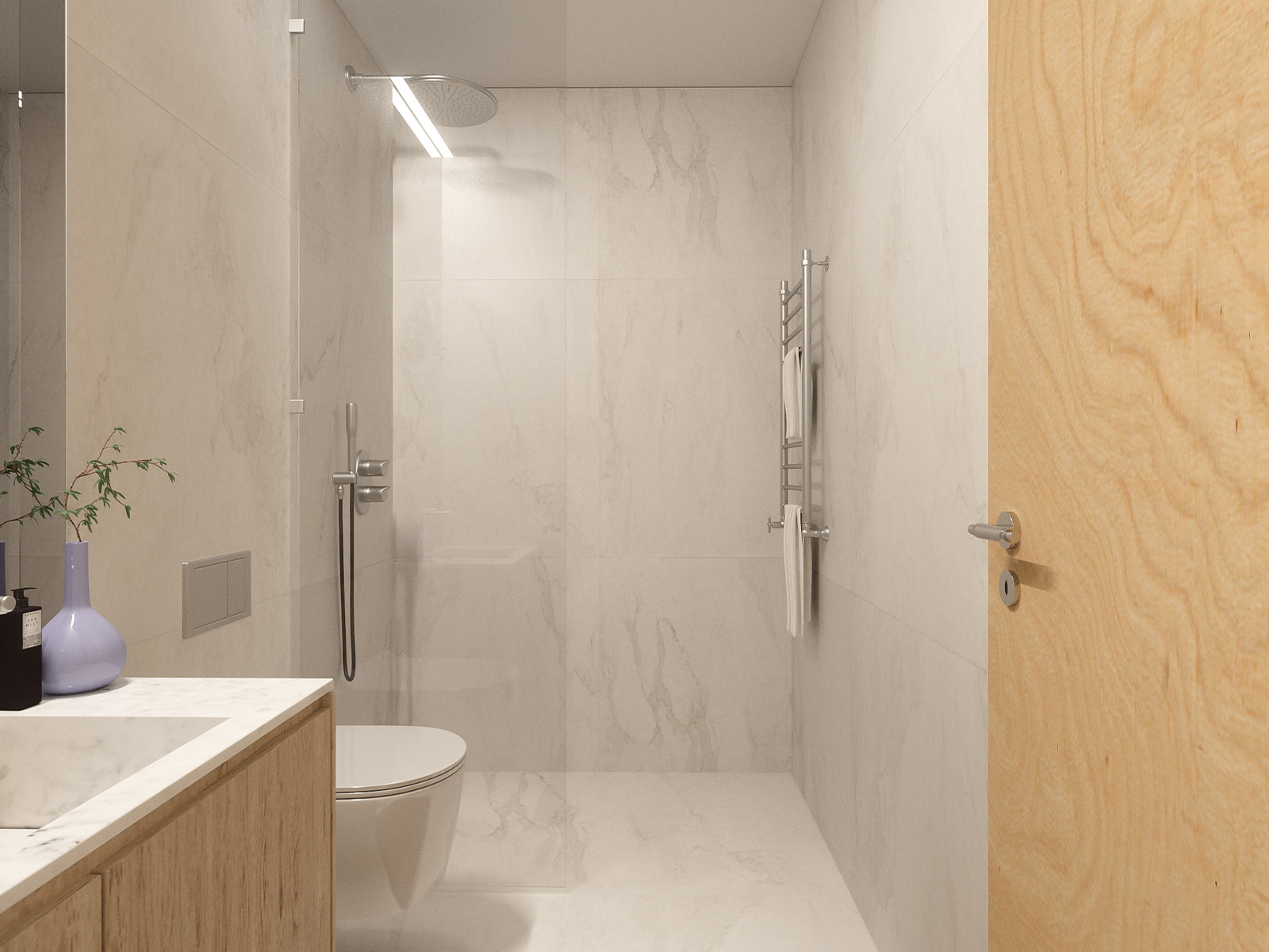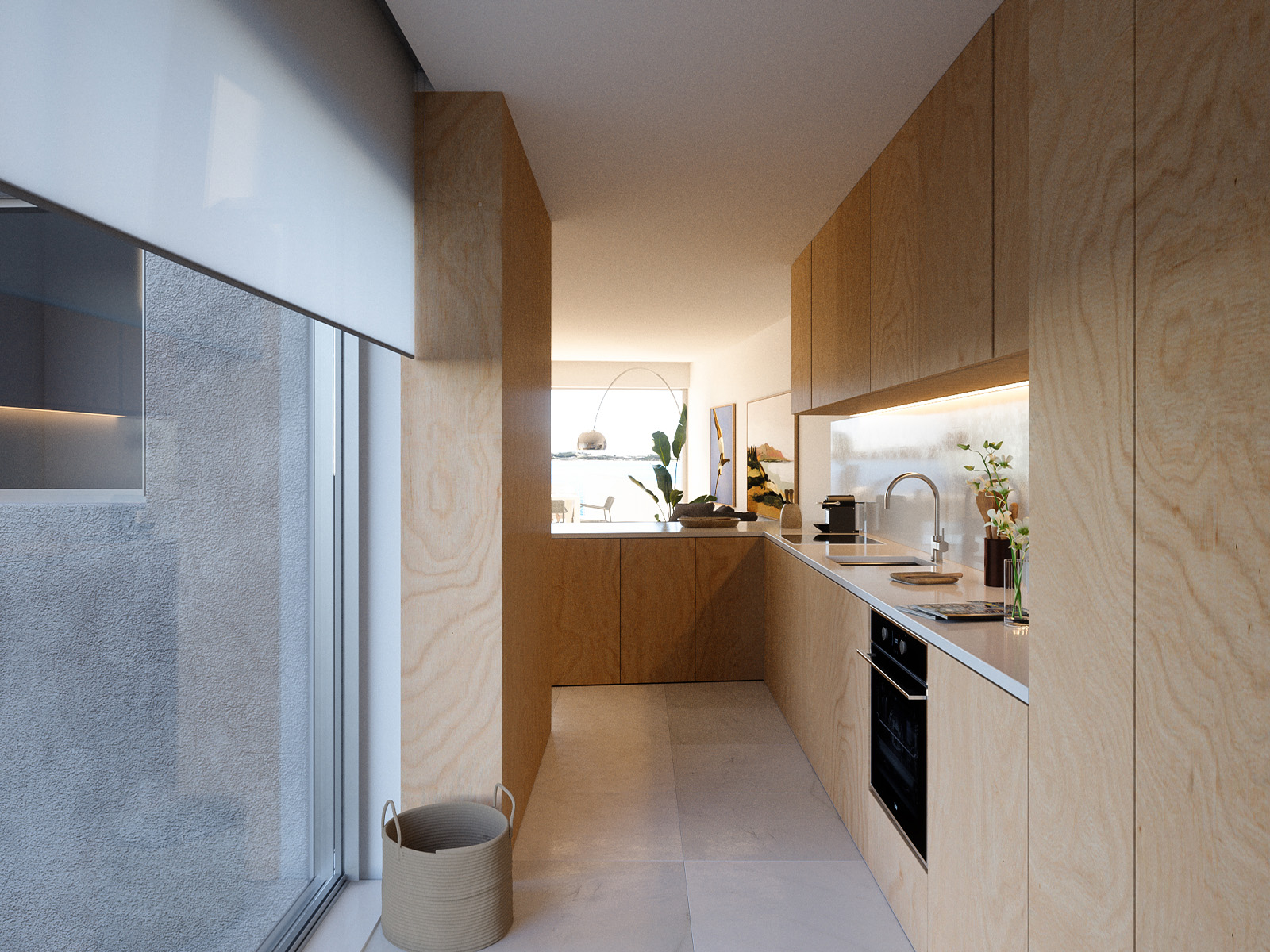 Os acabamentos são de elevada qualidade, com soalho em madeira de carvalho americano, mármore Estremoz ou Ibiza nas zonas húmidas, cozinhas equipadas com eletrodomésticos Siemens, bancadas em Silestone e armários em madeira de carvalho claro. As casas de banho estão equipadas com louças Duravit ou Porcelanosa e torneiras Bruma em acabamento mate. Ambos os apartamentos incluem ar condicionado, bomba de calor, estores elétricos blackout nos quartos e solscreen nas salas, caixilharias em alumínio com rutura térmica, vídeo porteiro IP e iluminação indireta. A eficiência energética está classificada com a categoria B.