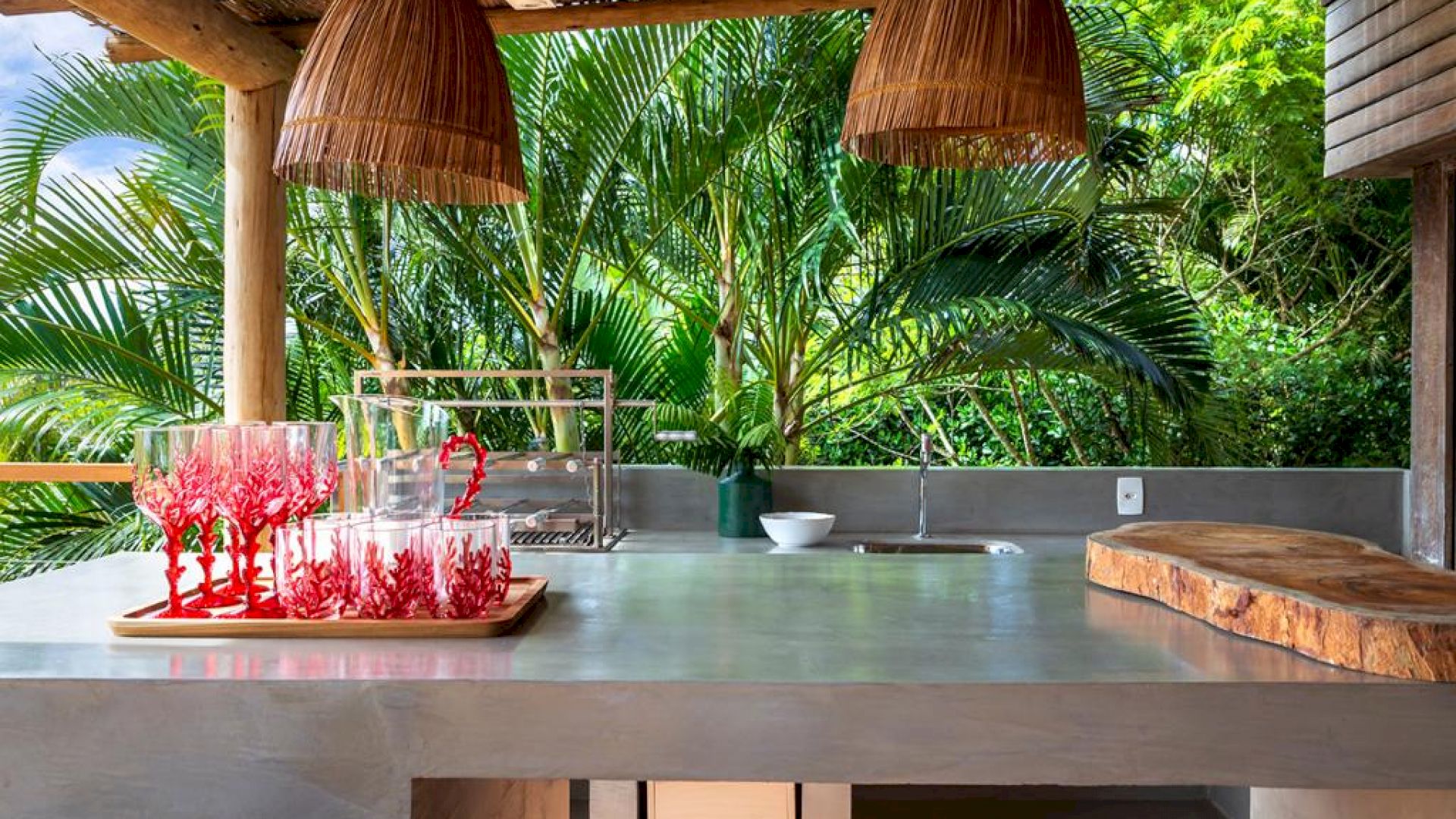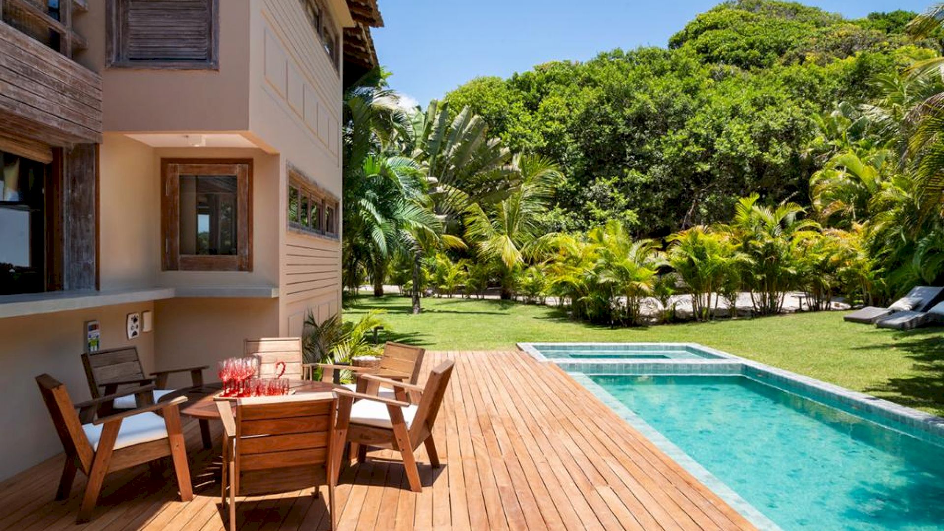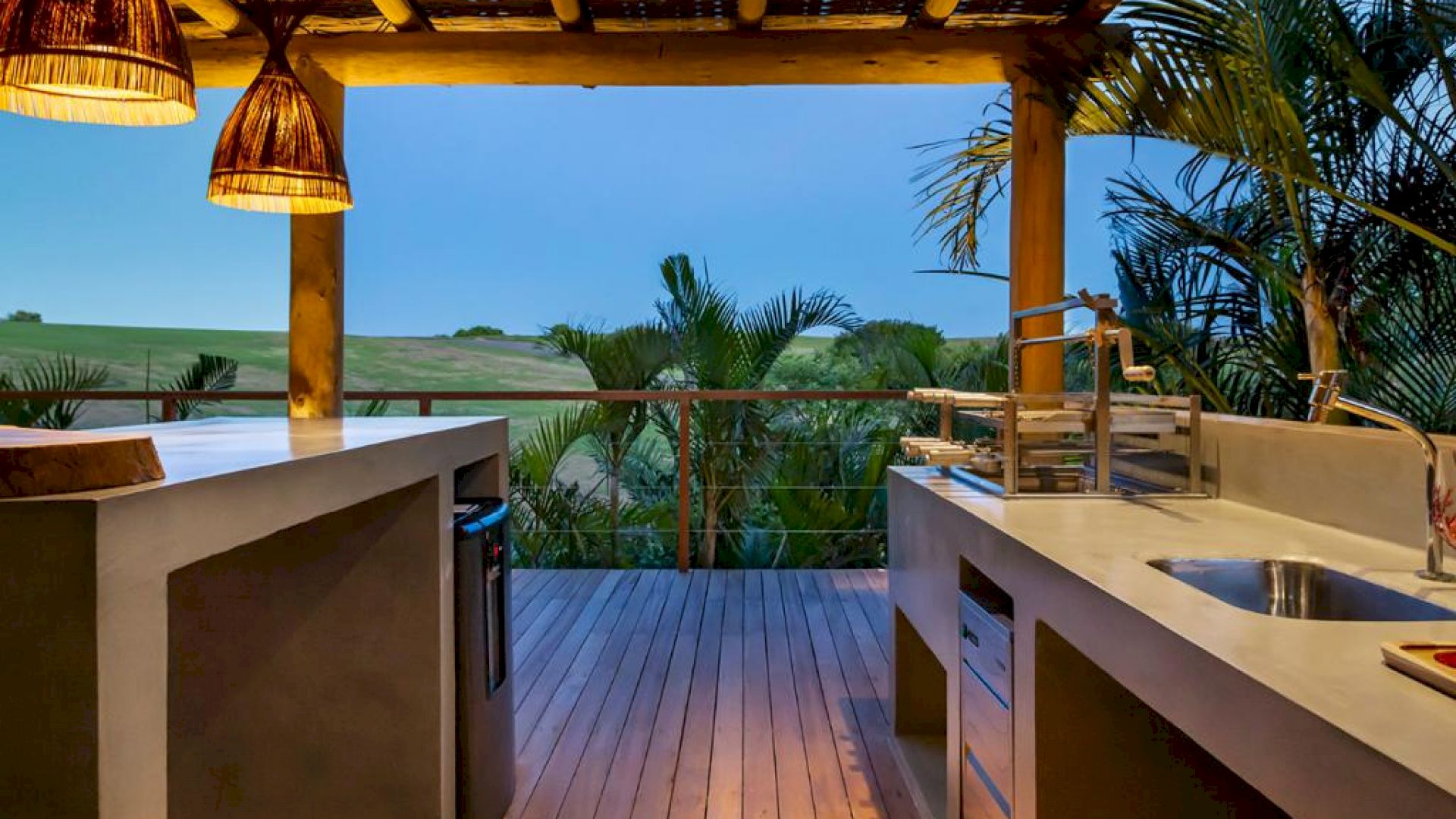 A residência, erguida sobre um terreno de 800 m² com 450 m² de área construída, foi projetada para ser uma ode ao bem-estar. Toda a sua área social e de lazer volta-se para o horizonte infinito do campo de golfe, criando uma sensação de amplitude e liberdade que poucos imóveis conseguem oferecer. O paisagismo tropical abundante envolve a piscina com hidromassagem, enquanto a varanda gourmet, equipada com churrasqueira estilo parrilla, máquina de gelo e cervejeira, torna-se o palco ideal para harmonizações gastronômicas memoráveis sob a brisa da Bahia.