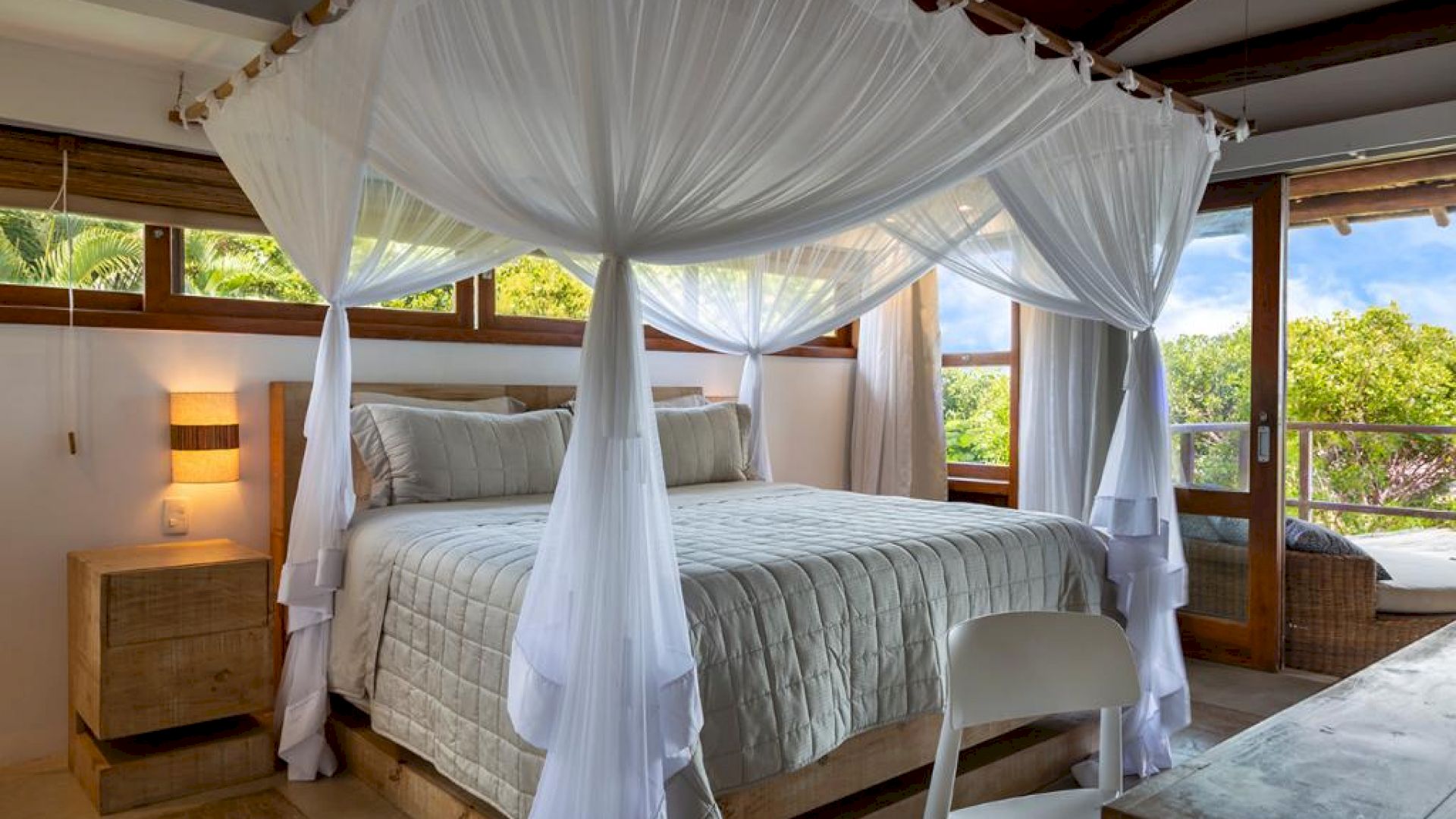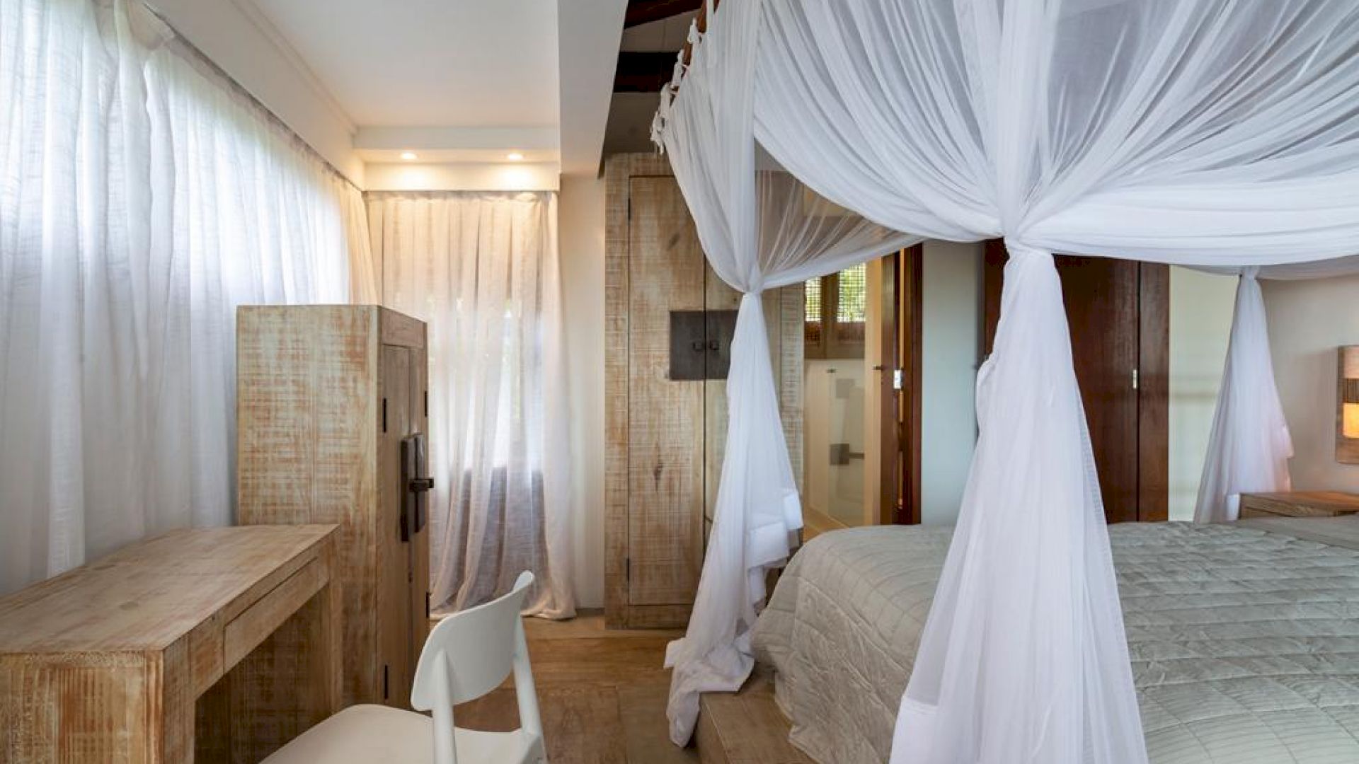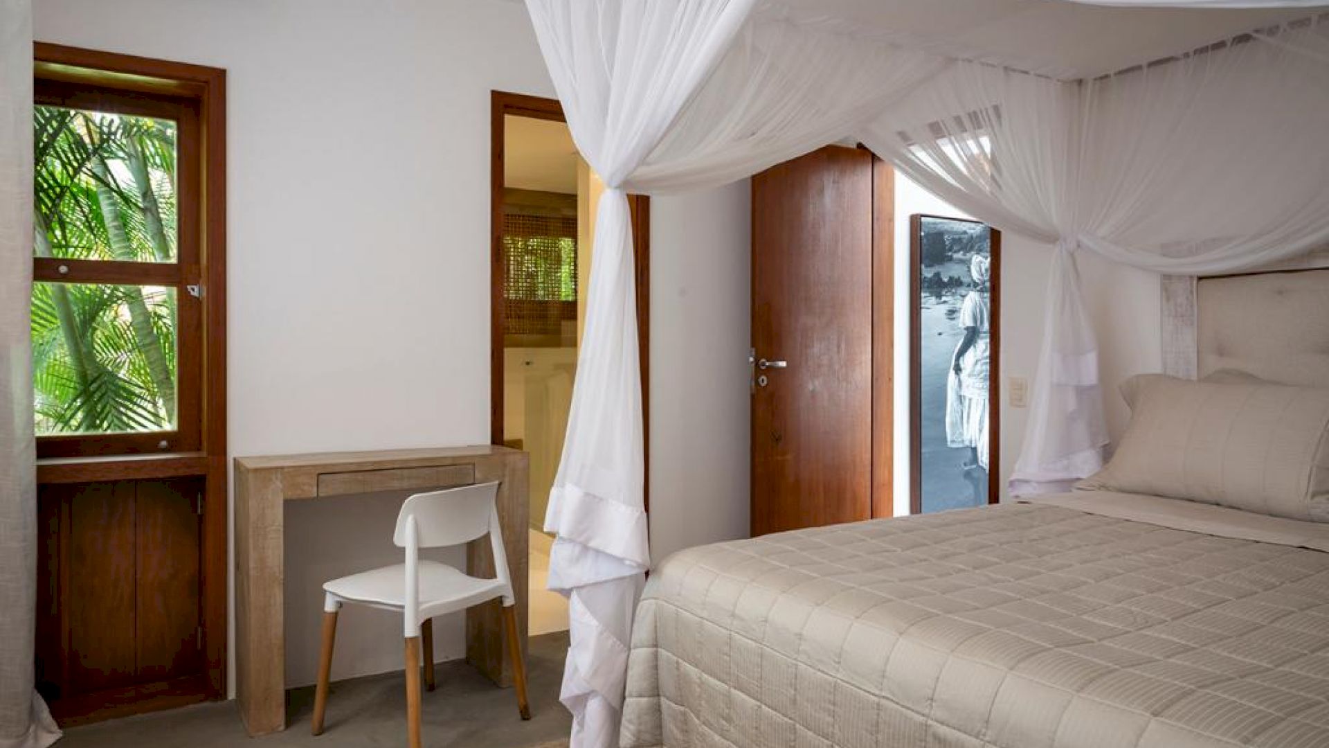 A ala íntima é um convite ao repouso profundo, composta por quatro suítes climatizadas que acolhem até oito hóspedes com total privacidade. A suíte master, com sua cama Super King e closet, é um refúgio de serenidade, enquanto as demais suítes, adornadas com mosquiteiros clássicos, remetem à elegância rústica e