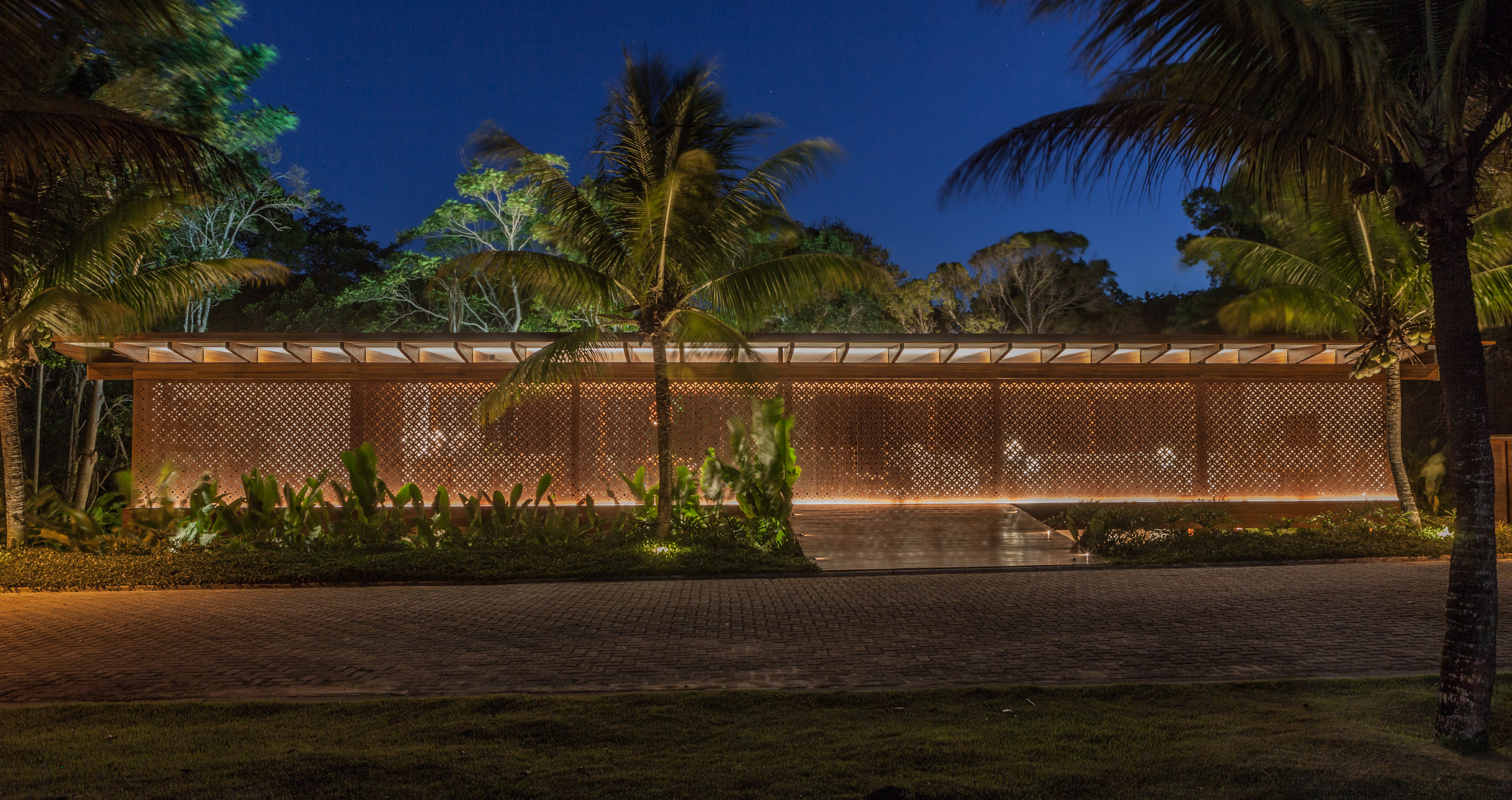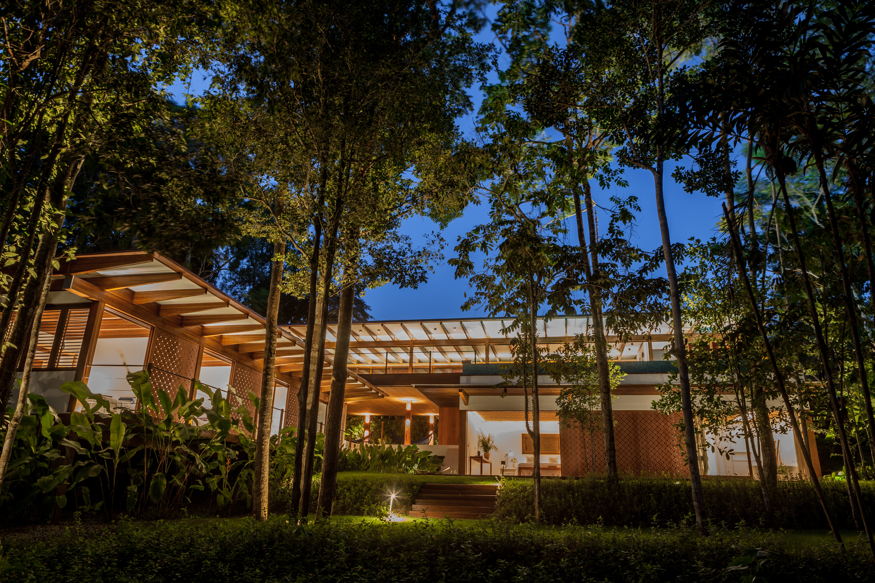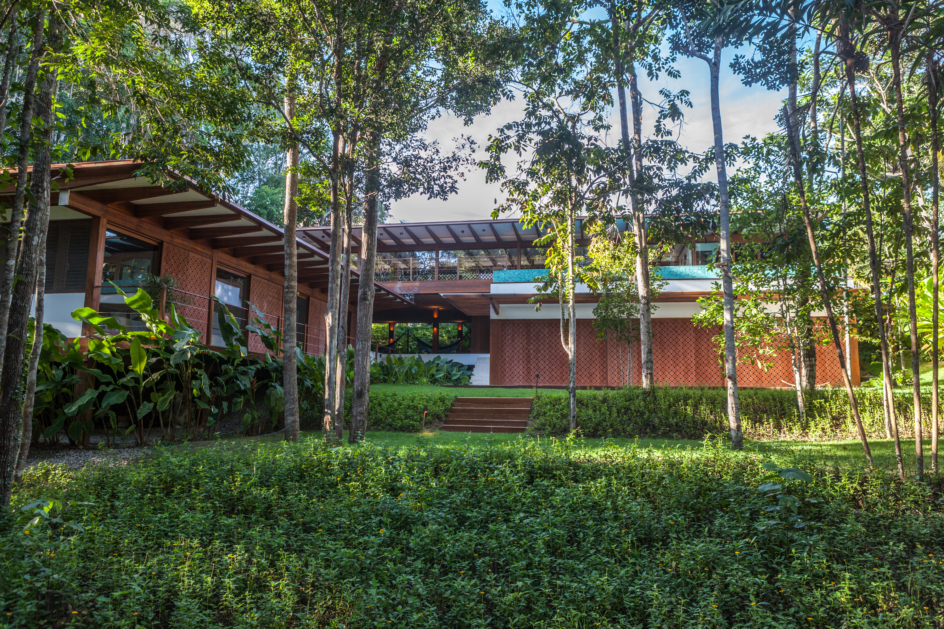 A arquitetura da casa é um exercício de harmonia e respeito ao entorno. Distribuída em dois pavilhões distintos sobre um terreno de aproximadamente 1.600m², a residência utiliza o conceito de "luxo orgânico". O bloco social é o coração da convivência, coroado por uma piscina de borda infinita que parece desaguar na copa das árvores. Um dos diferenciais mais fascinantes deste projeto são os telhados transformados em jardins suspensos: enquanto o terraço principal oferece um mirante privativo para o mar.
