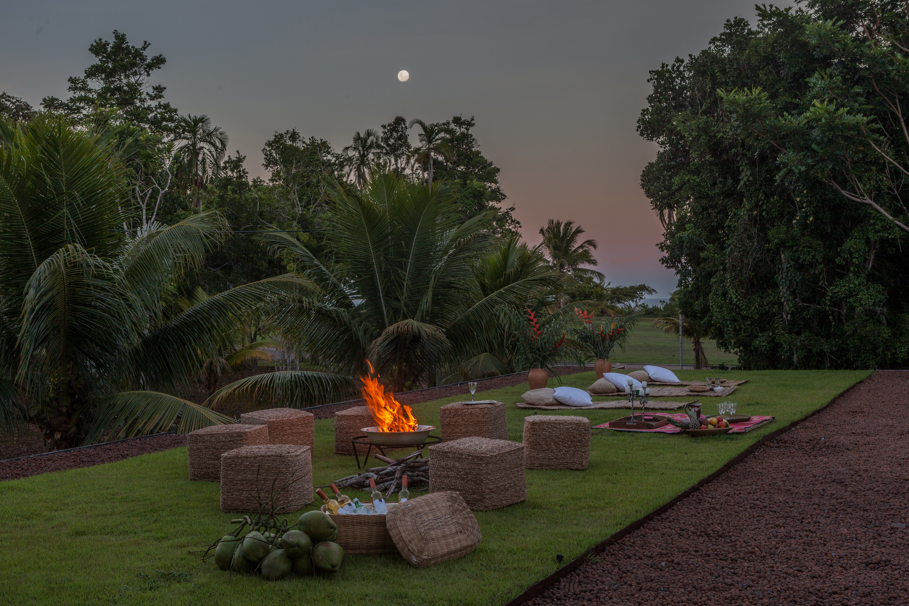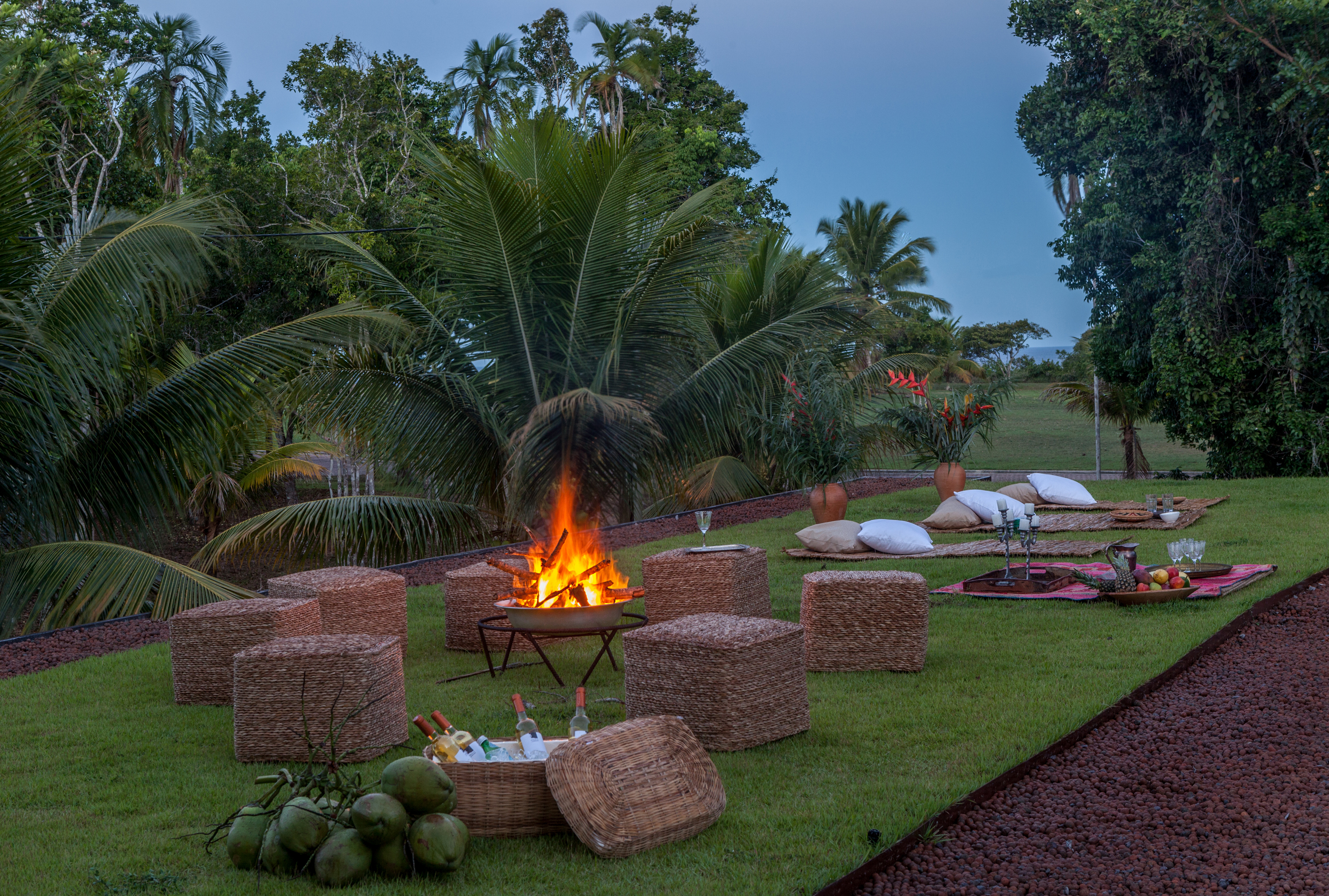 Sob a sala principal existe uma área para relaxamento e leitura com redes, esteiras e almofadas.