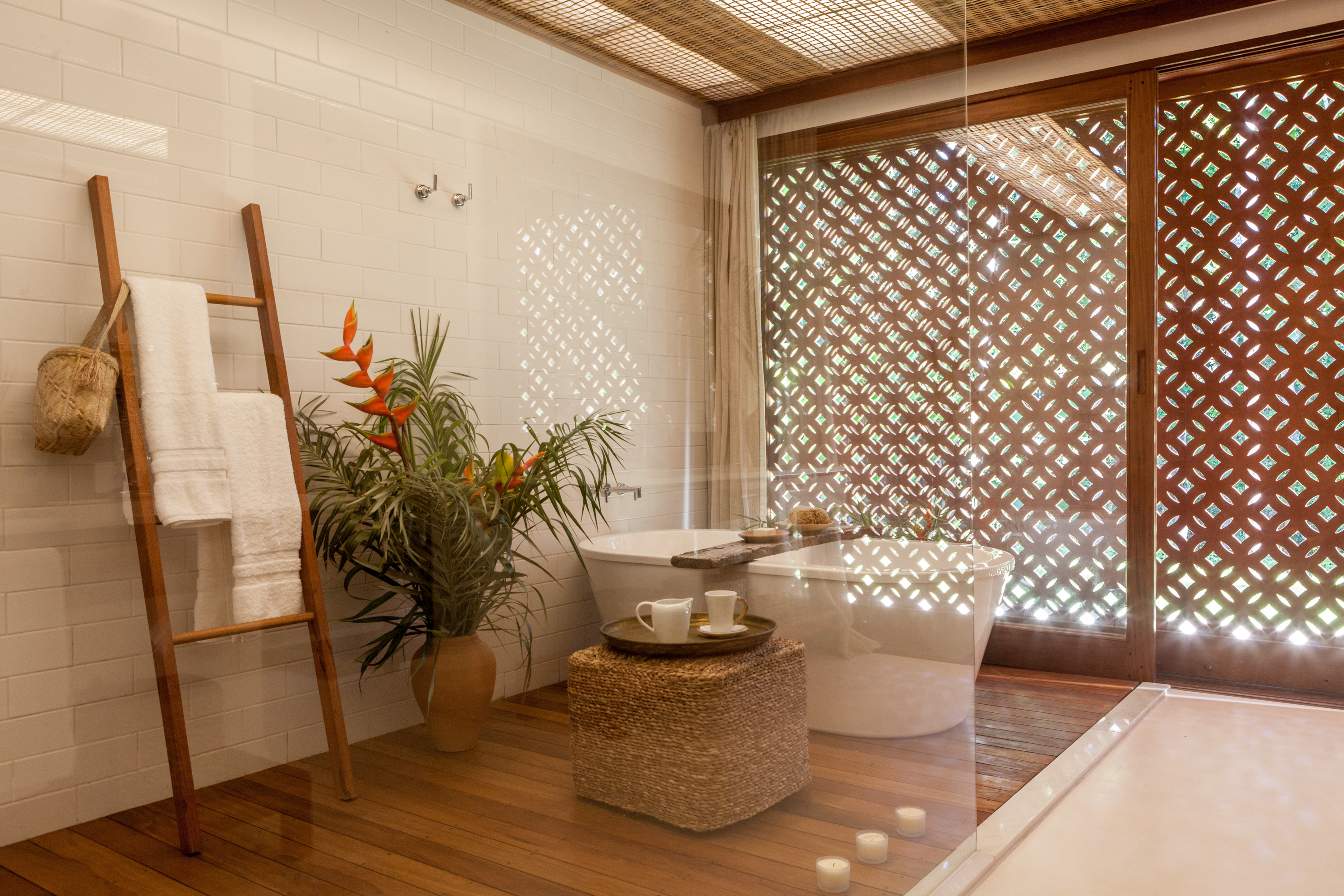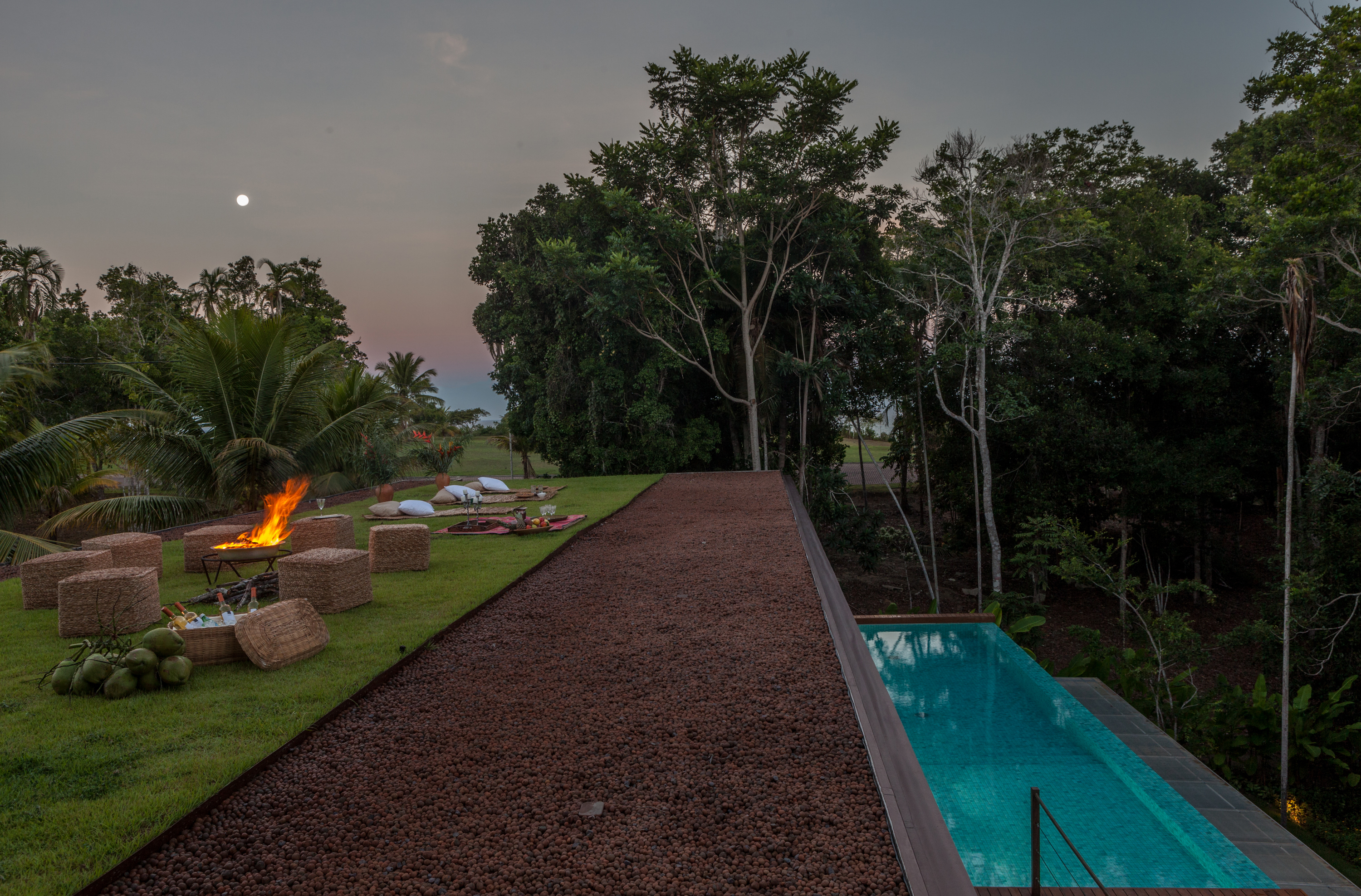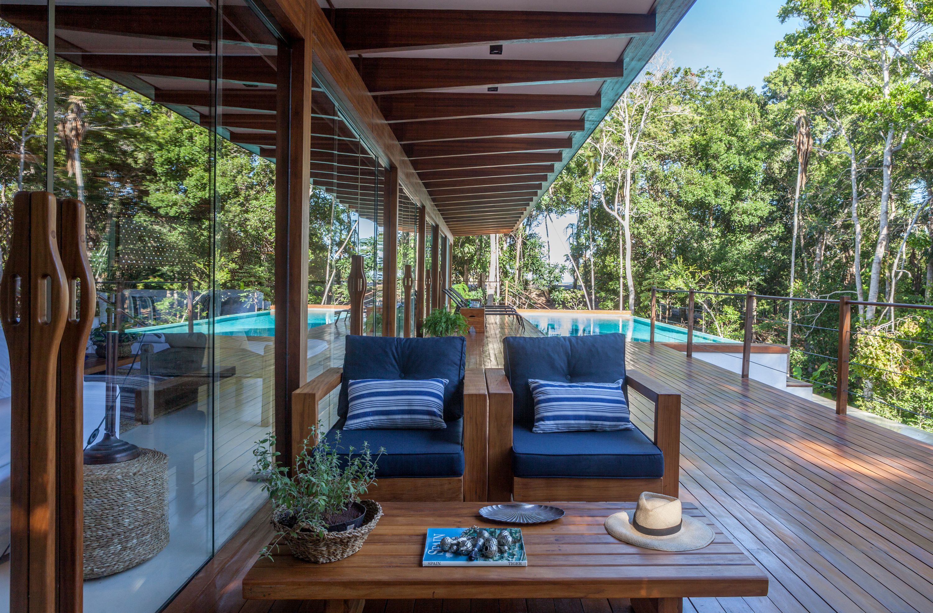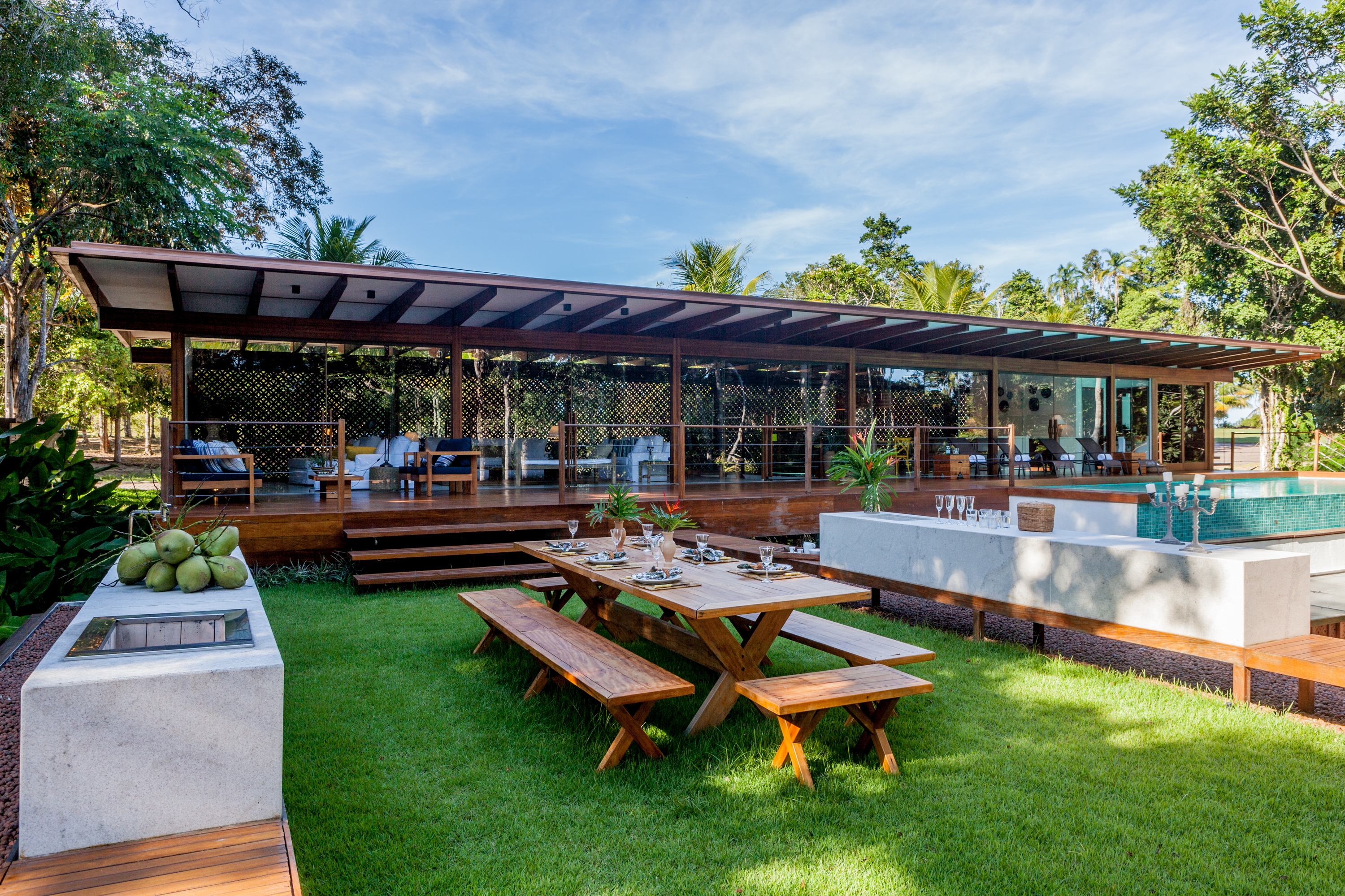 No bloco principal fica a parte social da casa. Piscina de borda infinita com vista para a copa das árvores, além de uma sauna seca de frente para a mata nativa. Os telhados da casa foram transformados em jardim. O do bloco principal proporciona vista para o mar da Praia dos Coqueiros e é perfeito para um luau. Já o telhado dos quartos circundado por um banco de madeira é uma área deliciosa para refeições ao ar livre com churrasqueira, pia e apoios para serviço e bebidas, tudo isso tendo a mata como cenário.