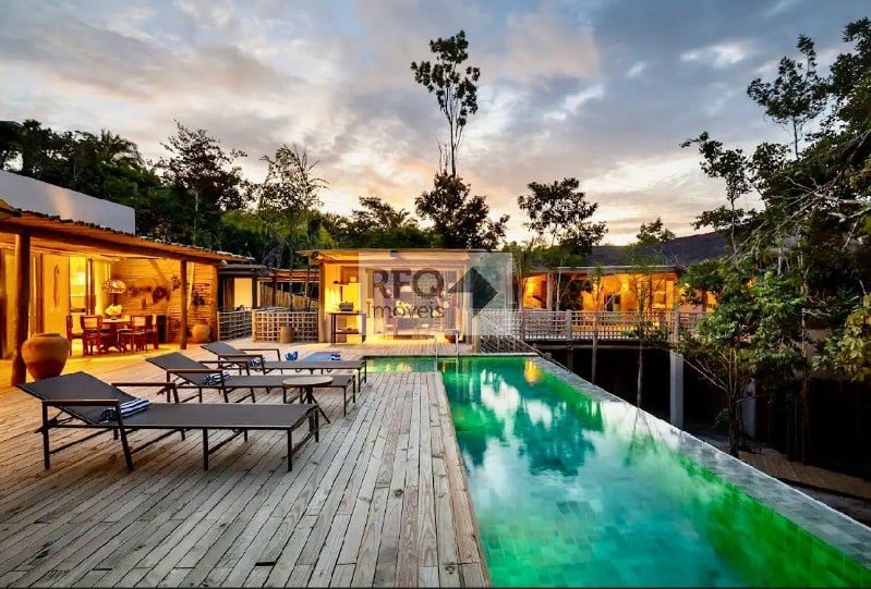 Com 7 dormitórios, todos com banheiro privativo, a casa possui acabamentos e móveis de alto padrão, garantindo conforto e luxo aos hóspedes. Além disso, conta com 2 cozinhas gourmet, uma cozinha industrial, piscina raia com opção de aquecimento, jardim de areia com deck, suíte de funcionários, energia solar, horta, ampla área de serviço e vagas independentes.