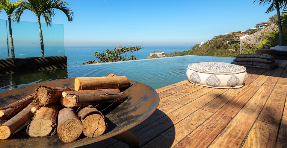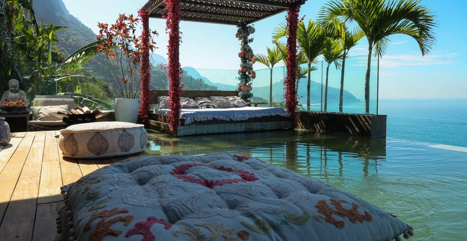 A piscina com borda infinita que visualmente se funde ao mar, convidando o horizonte.