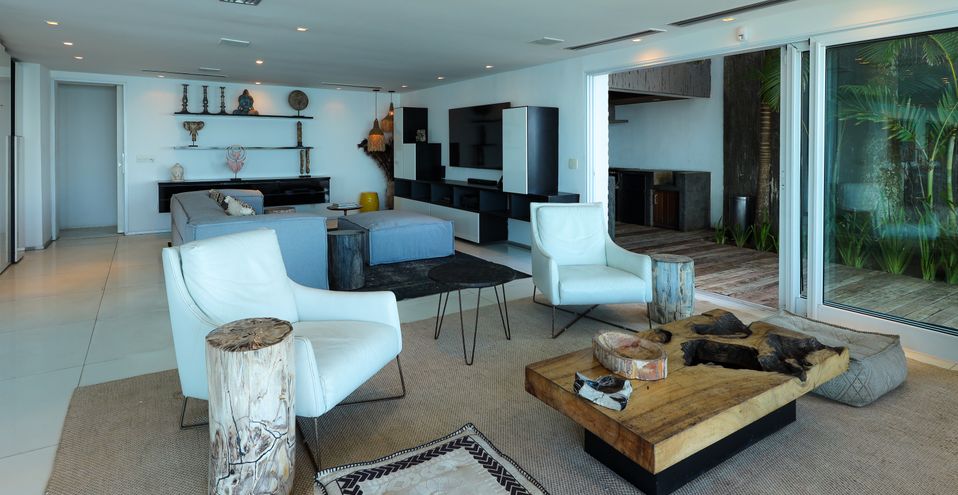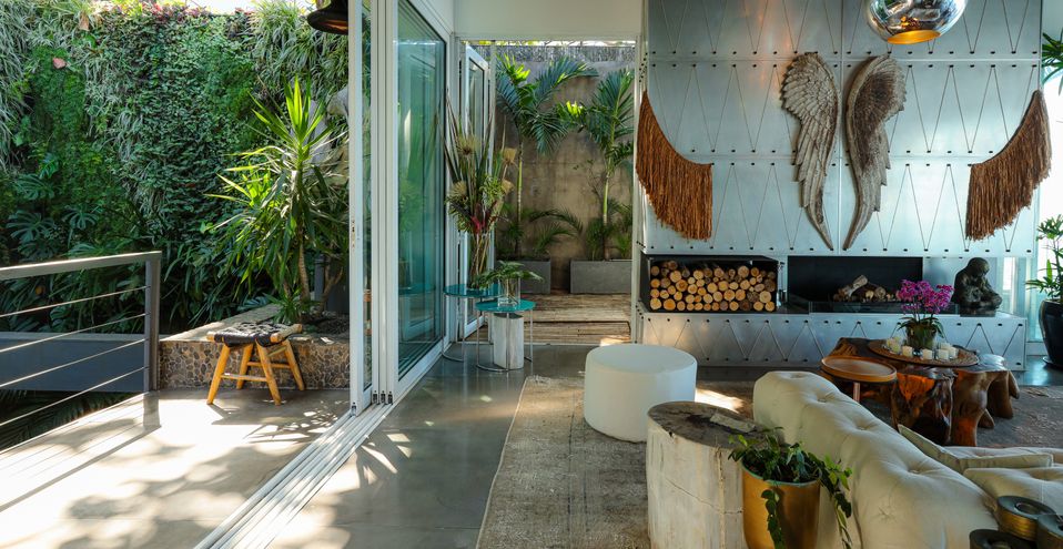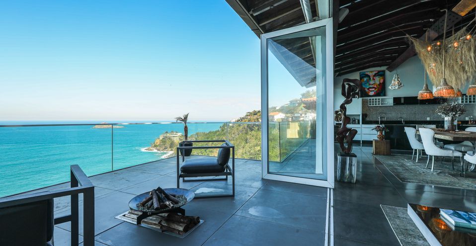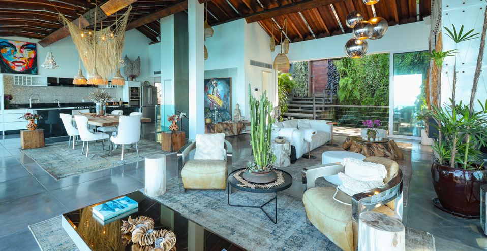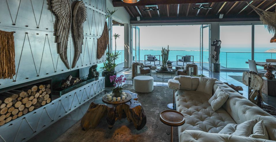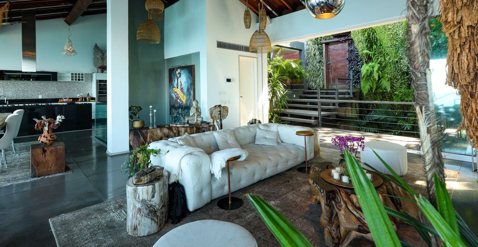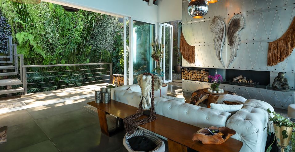 O Living tem vistas deslumbrantes para o mar e jardim vertical de incomparável beleza.