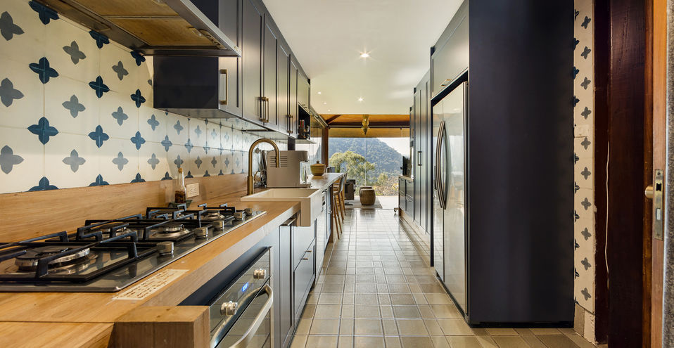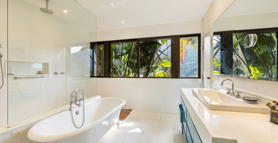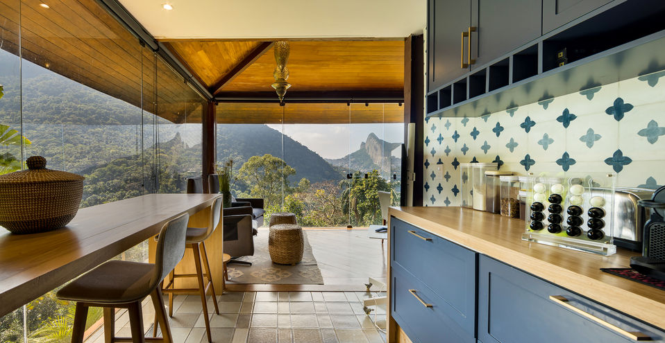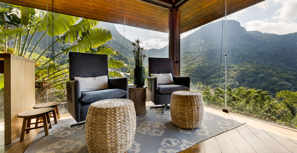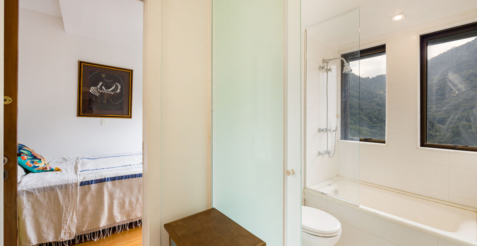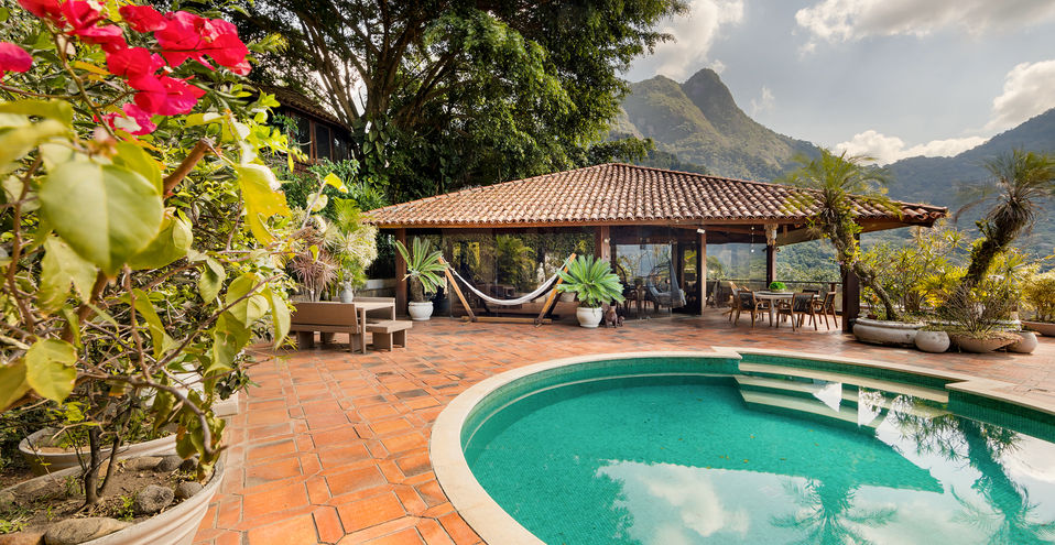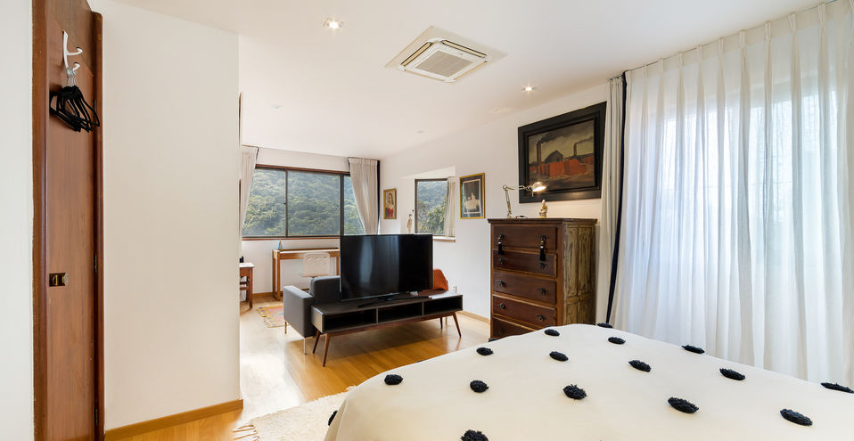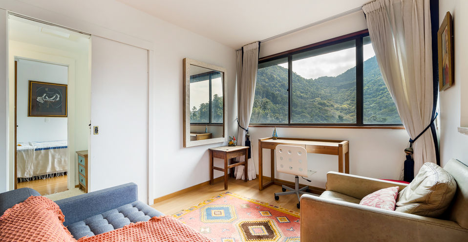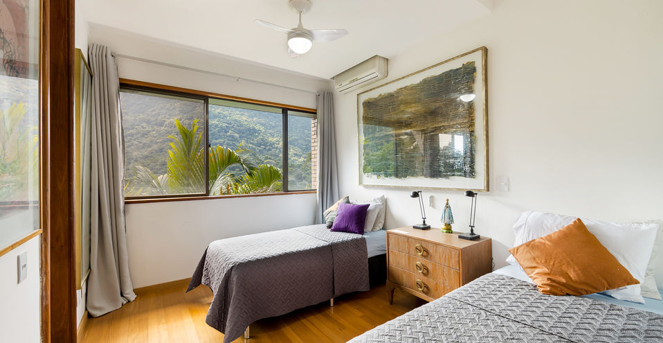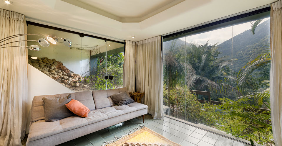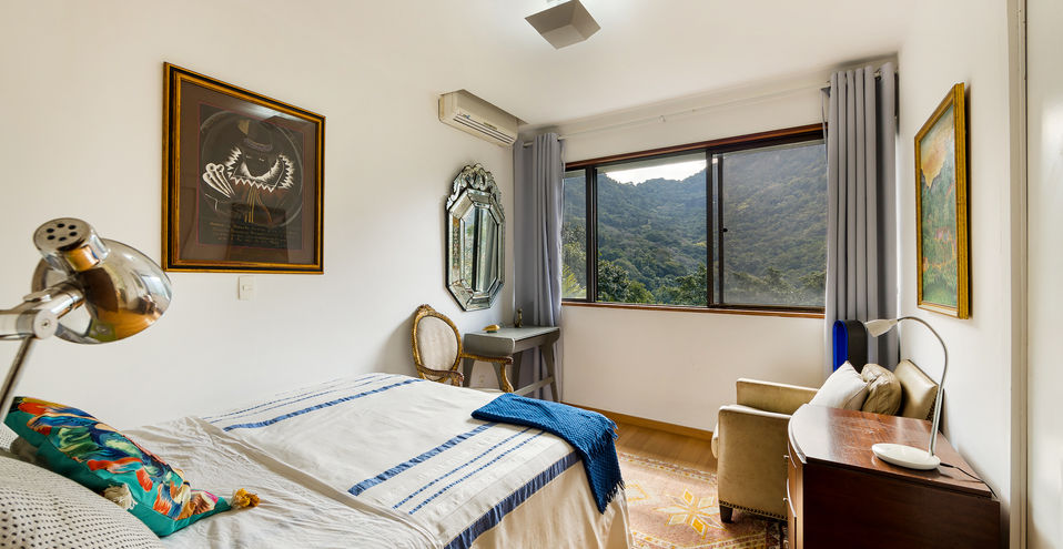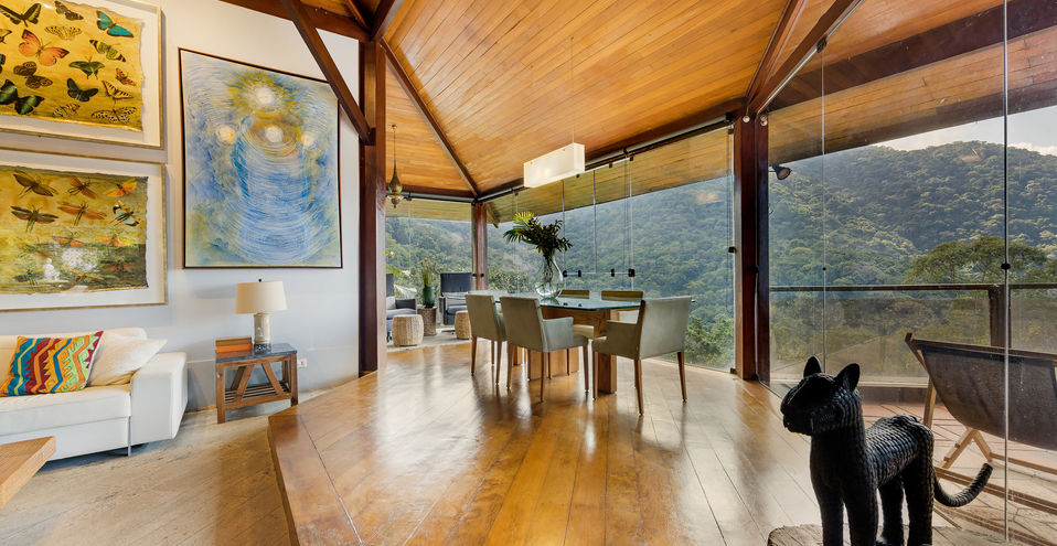 A casa é composta por salão de estar com pé direito alto, com quase 360 graus de vista para o verde, montanha e mar!