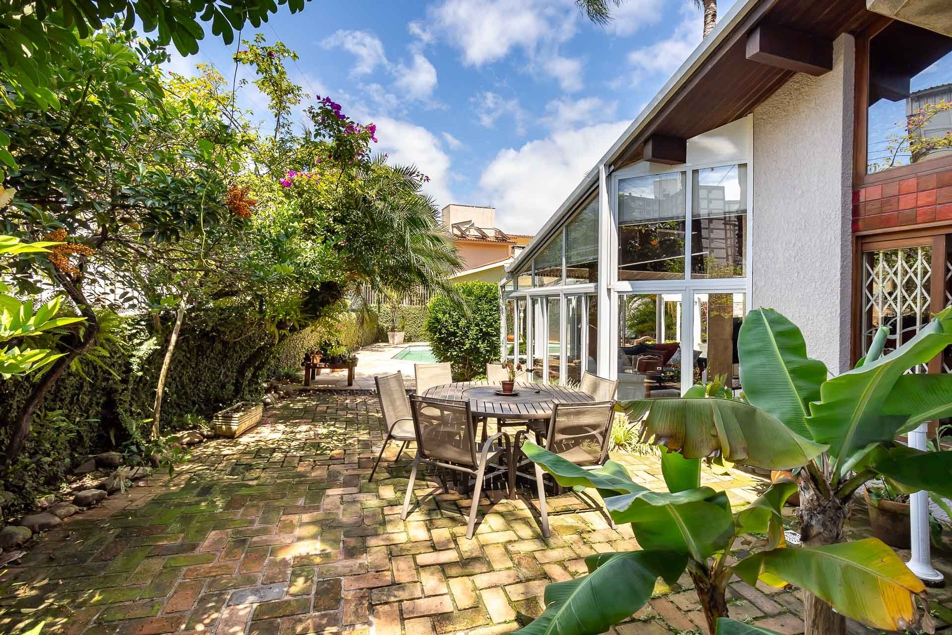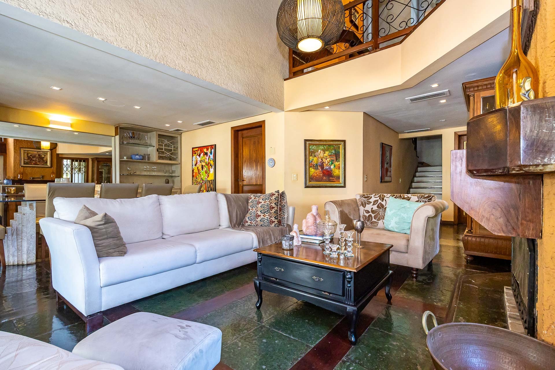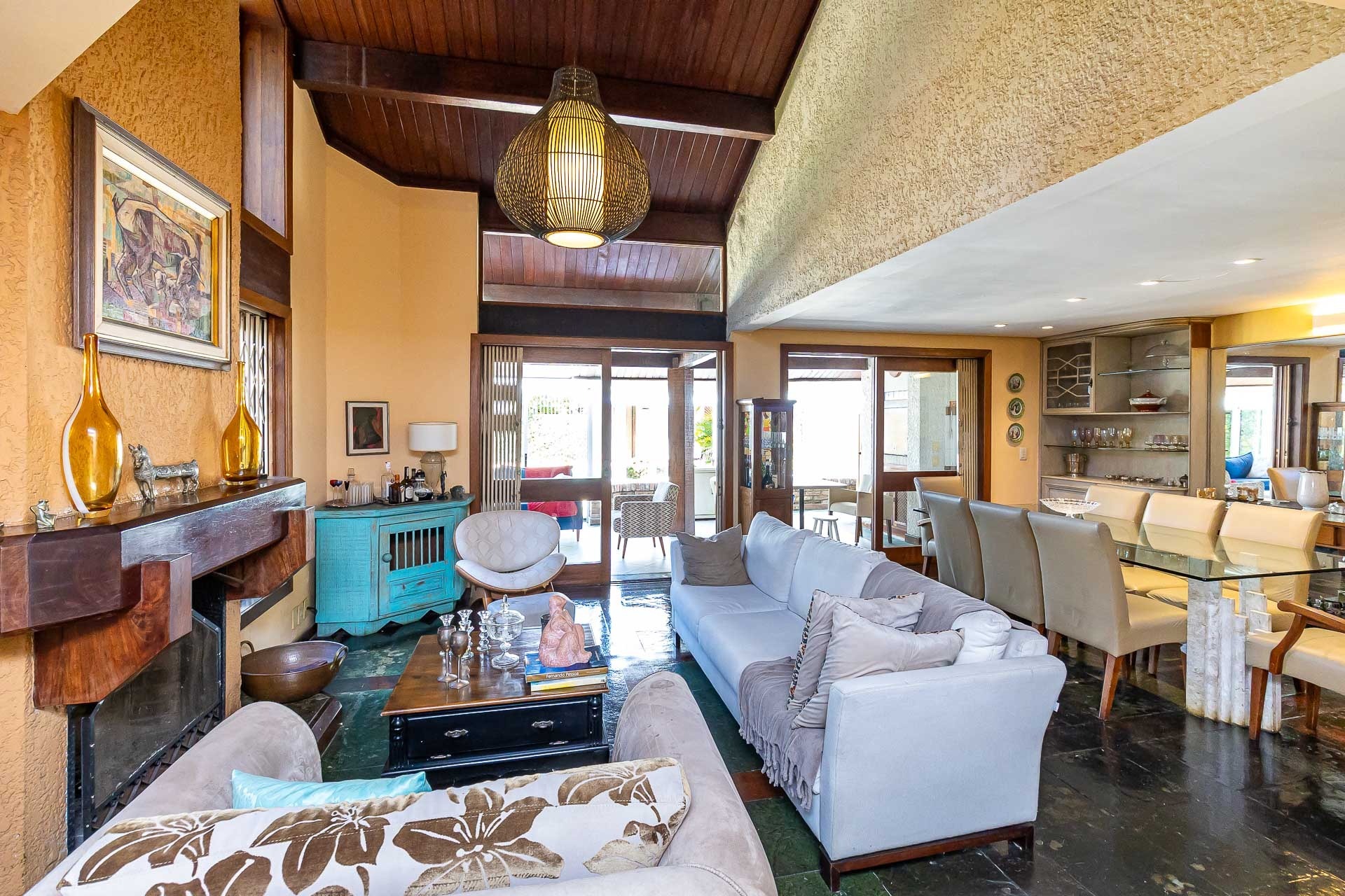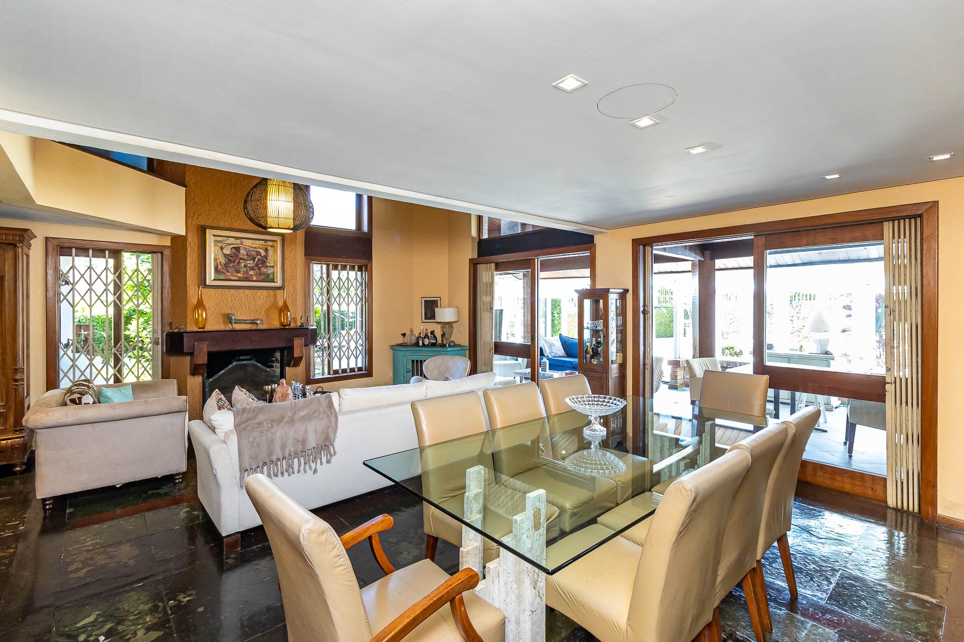 No primeiro piso nos deparamos com um maravilhoso living em 3 ambientes, com jantar, estar com lareira, cozinha americana, lavabo, pátio em L com churrasqueira, jardim, deck e uma parede verde muito agradável.