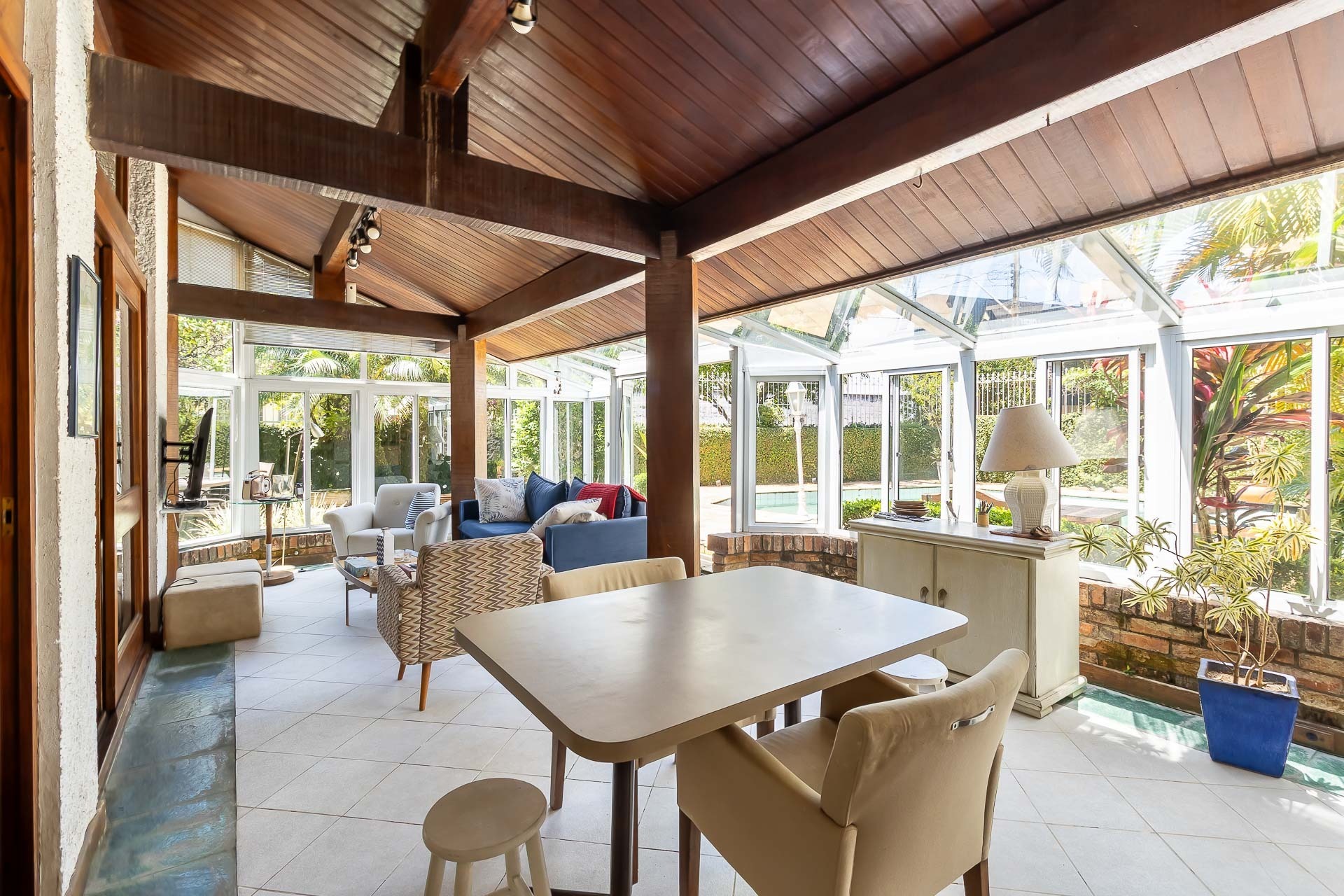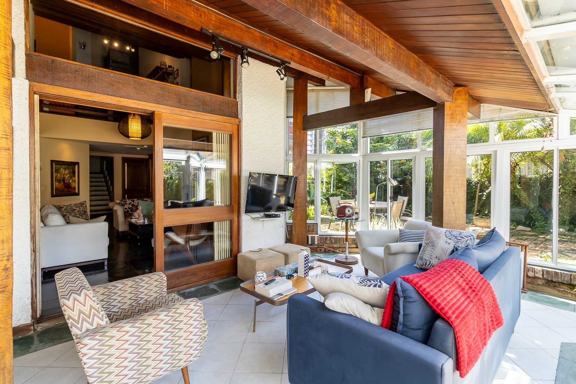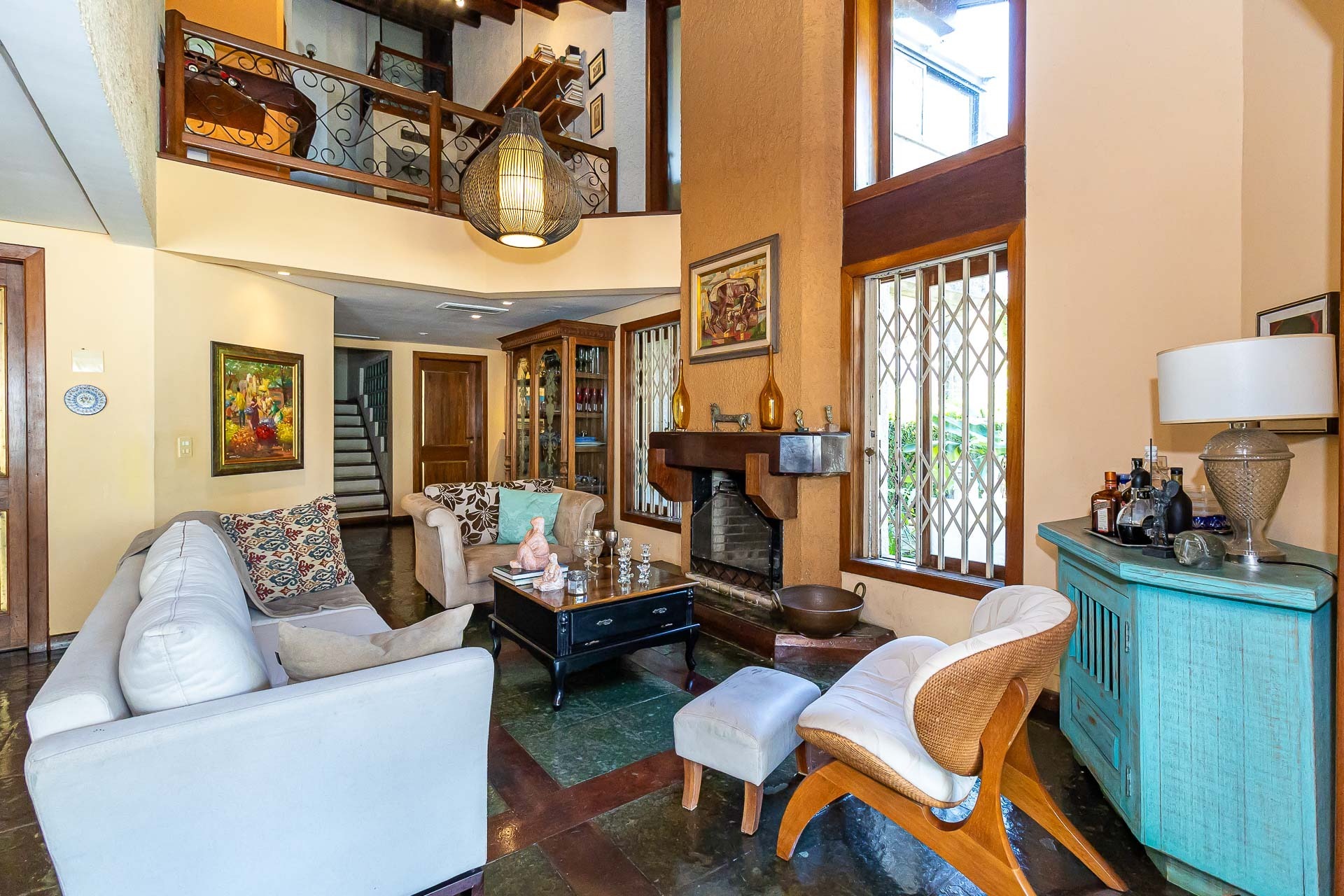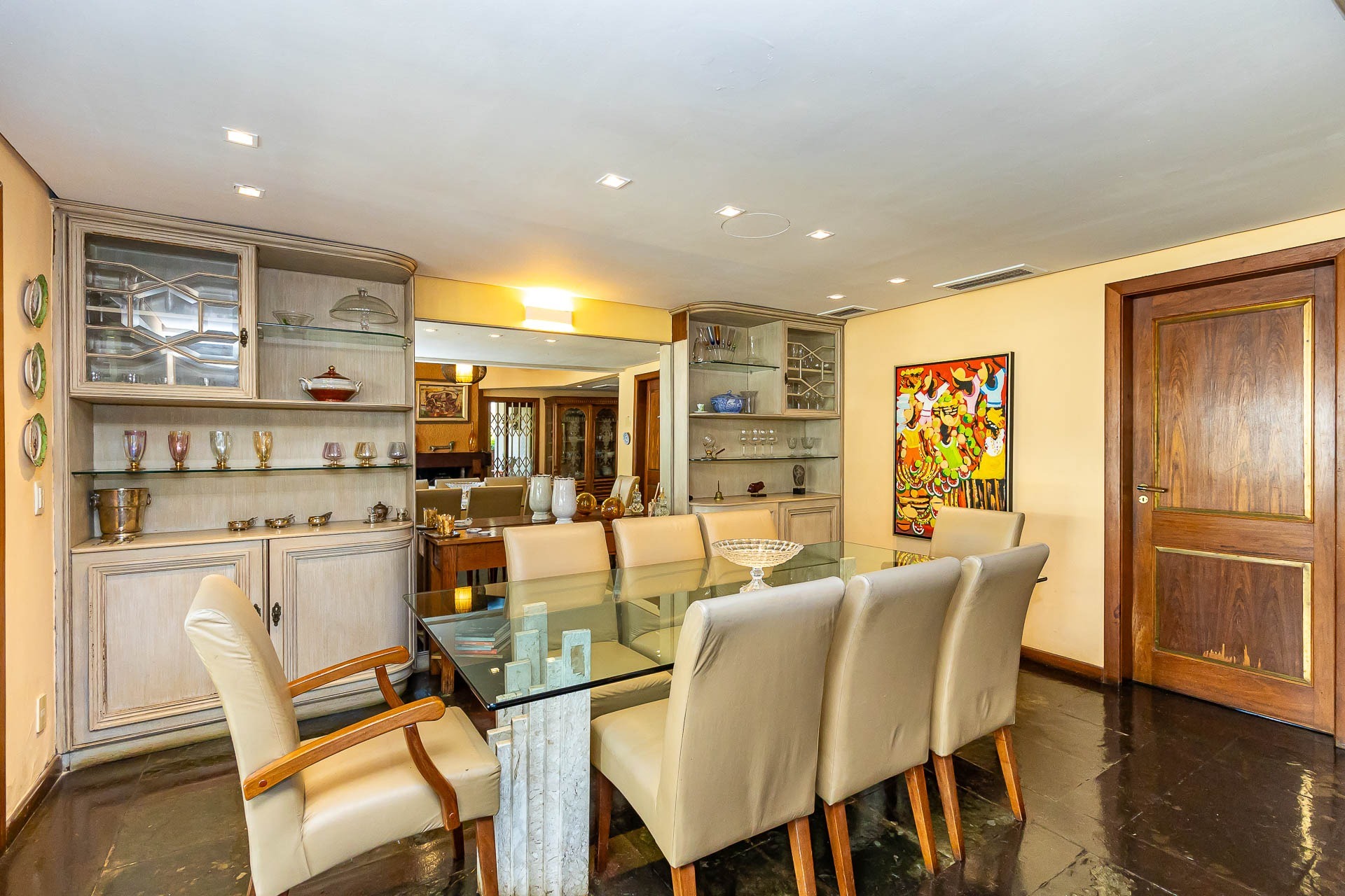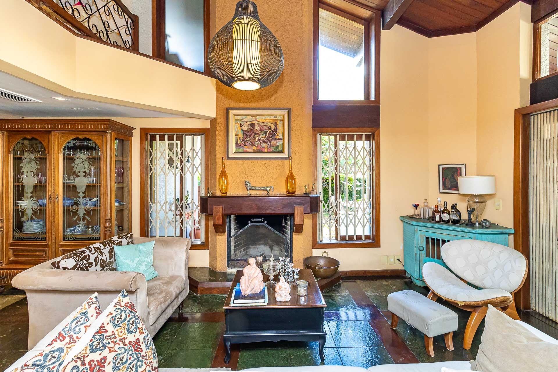 No primeiro piso nos deparamos com um maravilhoso living em 3 ambientes, com jantar, estar com lareira, cozinha americana, lavabo, pátio em L com churrasqueira, jardim, deck e uma parede verde muito agradável.