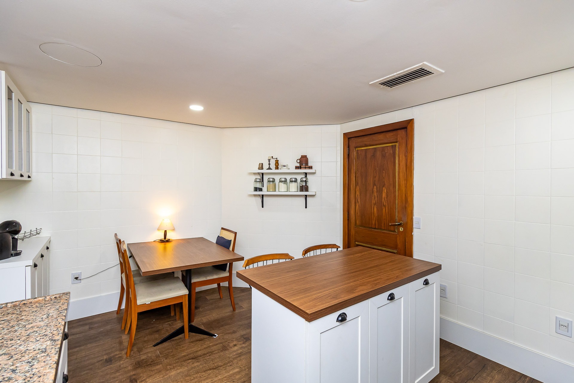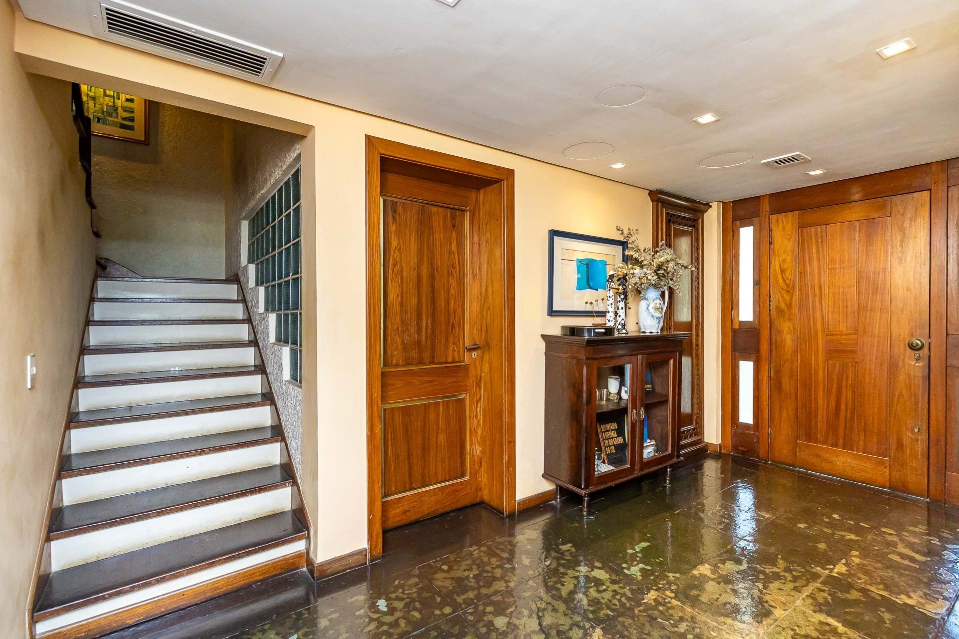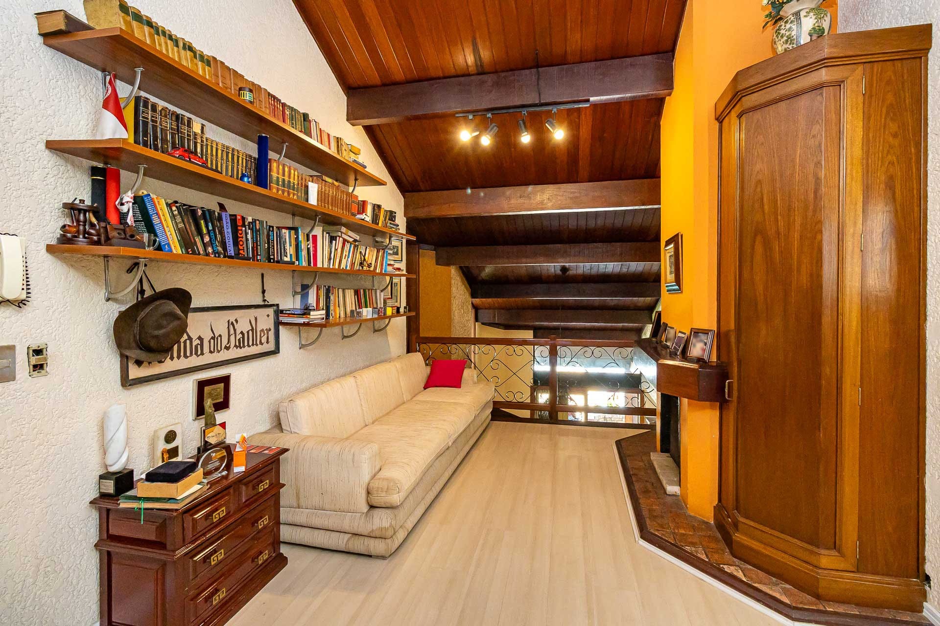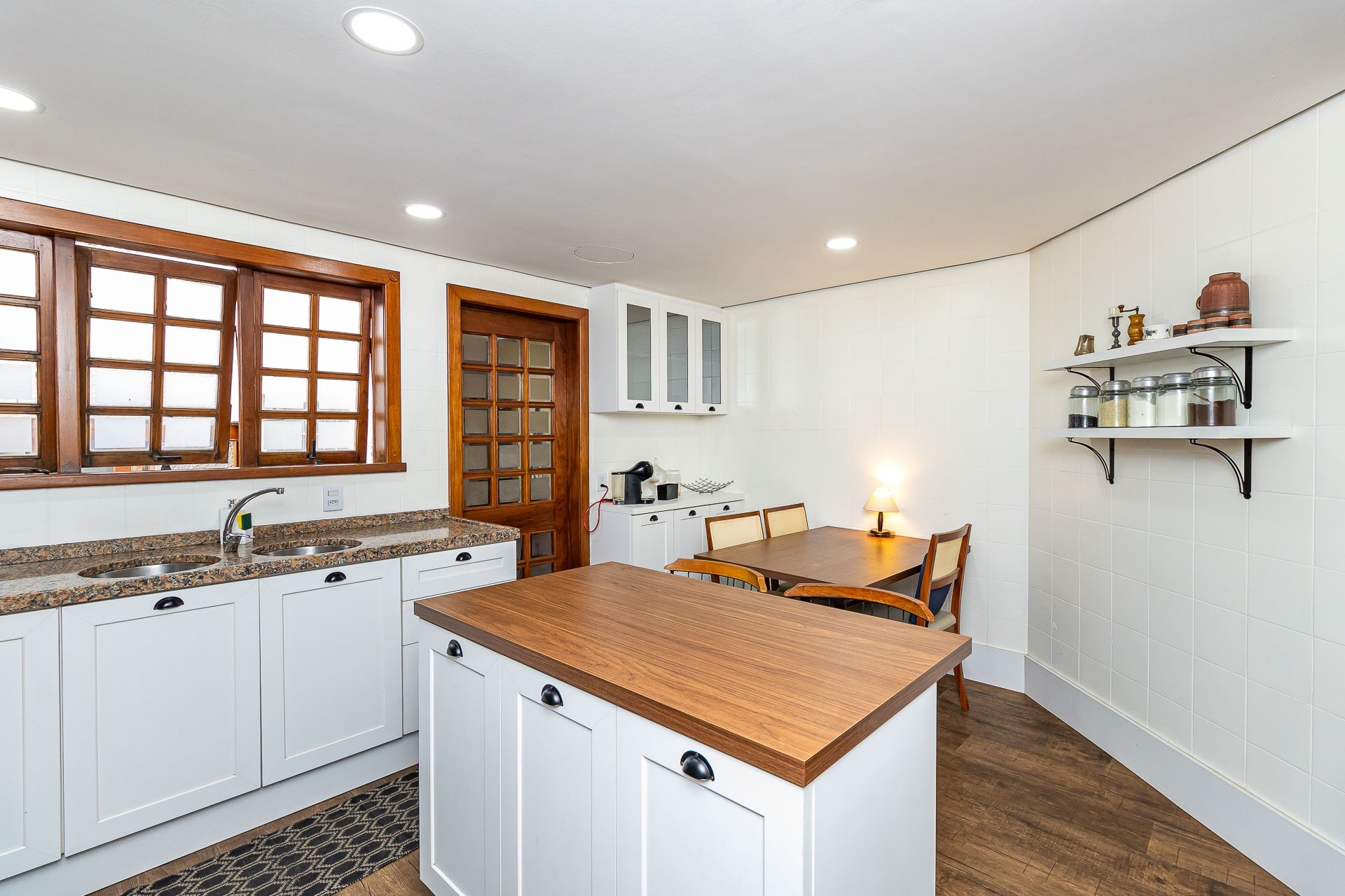 No primeiro piso nos deparamos com um maravilhoso living em 3 ambientes, com jantar, estar com lareira, cozinha americana, lavabo, pátio em L com churrasqueira, jardim, deck e uma parede verde muito agradável.